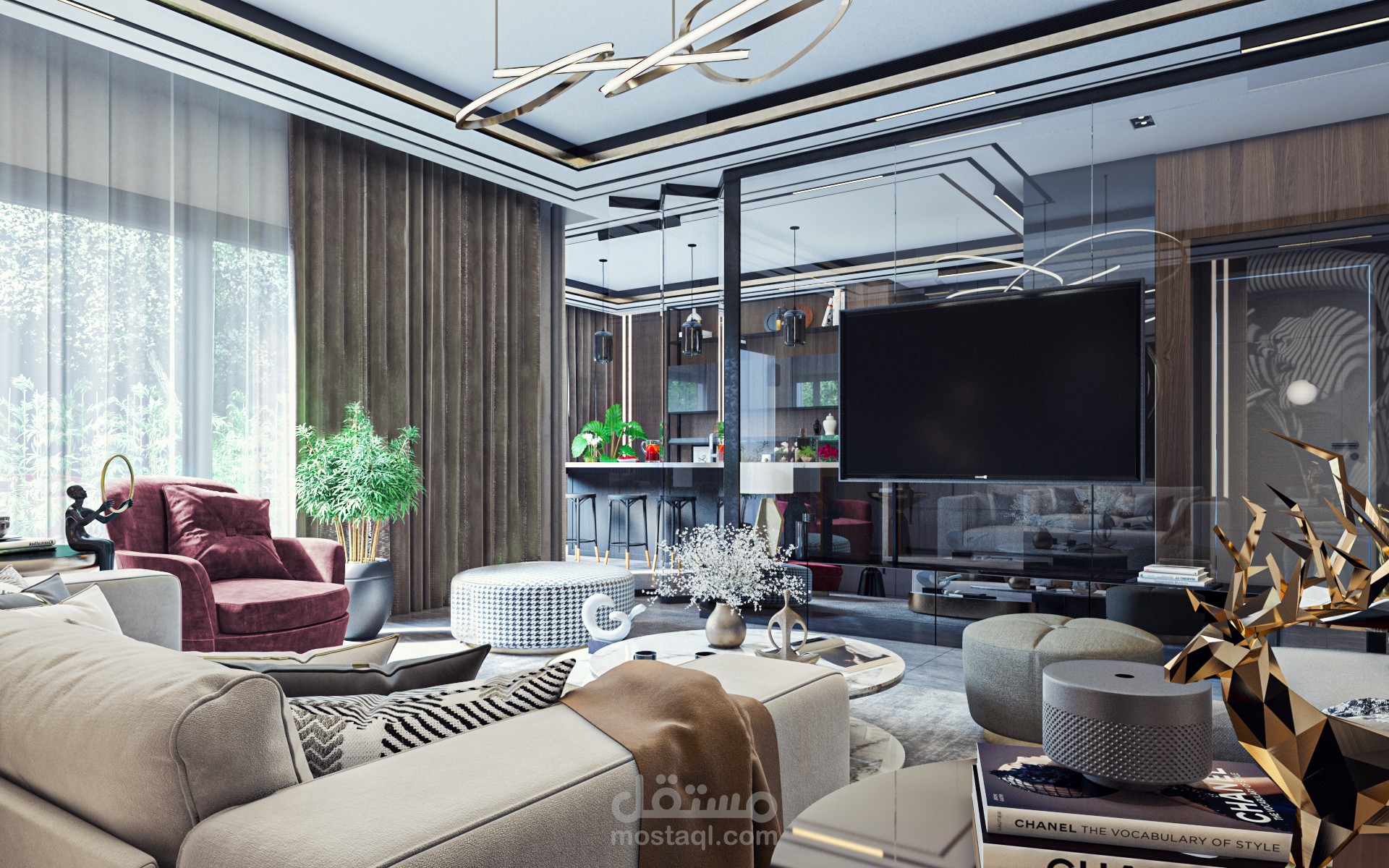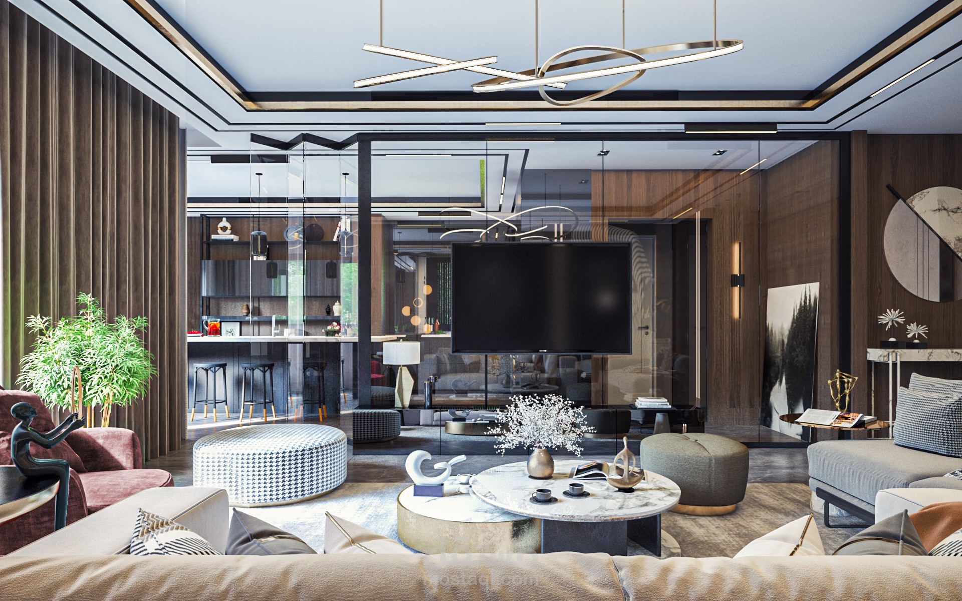تصميم داخلى لغرفة معيشة بفكر توسيعى للمساحه واستخدام زجاج شفاف على مساحة المطبخ المصممة لتتكامل مع الجزء الخارجى