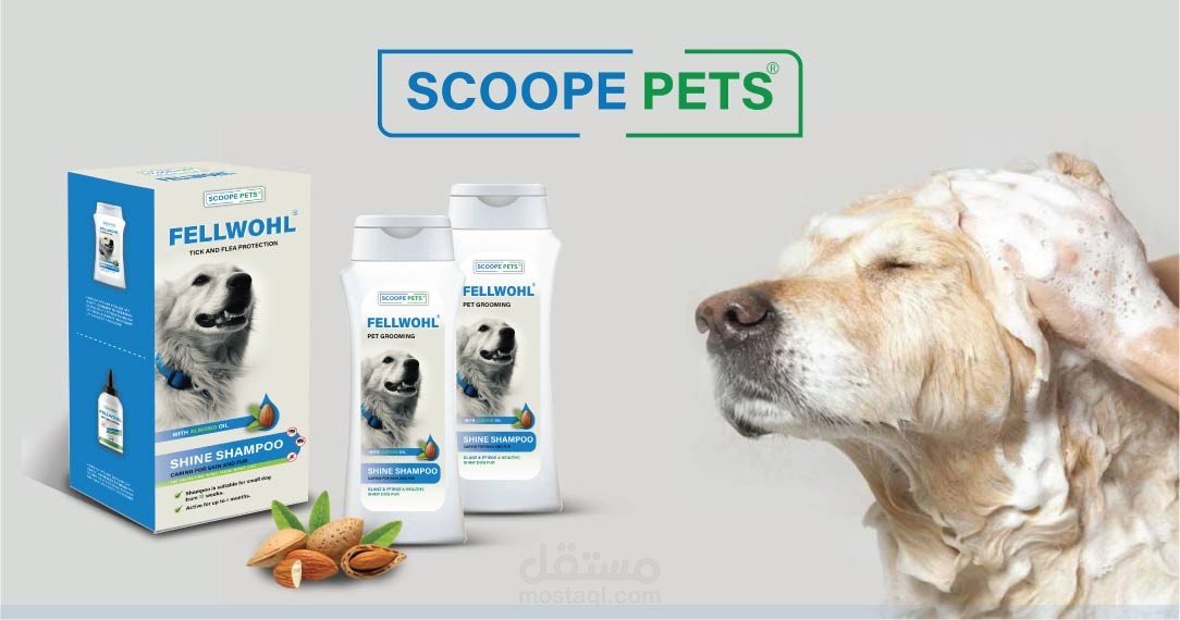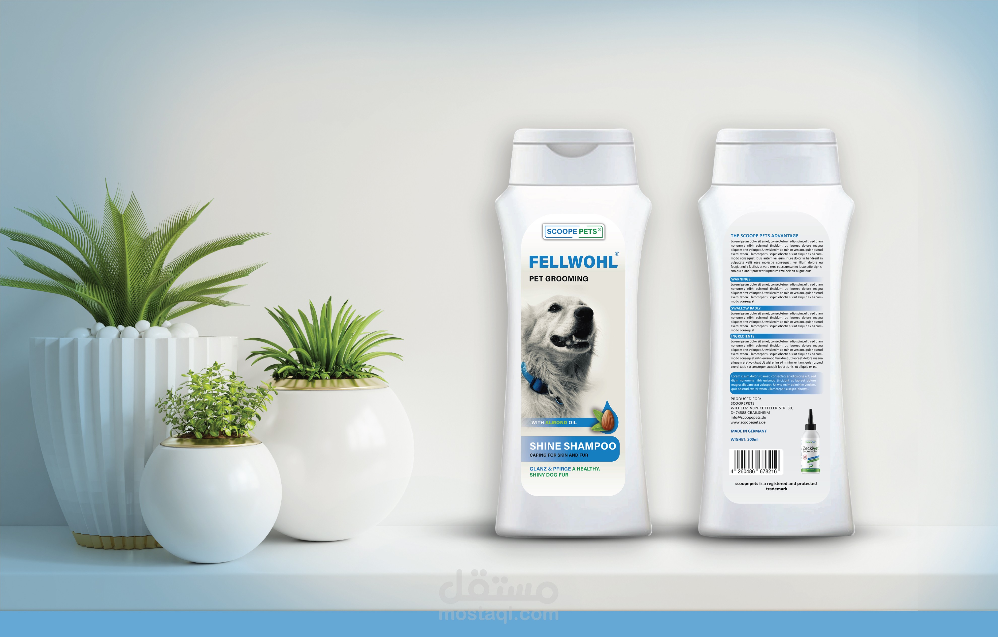 تصميم بكيج كامل لشامبو مخصص للكلاب (ملصق لعبوة شامبو + كرتونة شامبو) ، تابع لشركة SCOOPE PETS في ألمانيا.