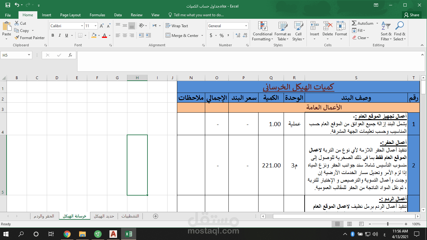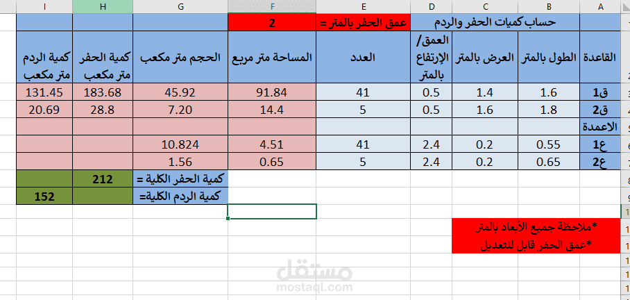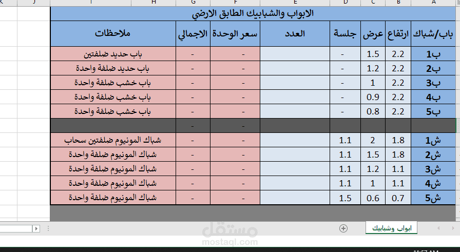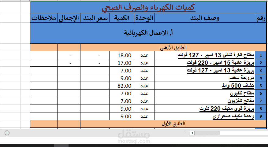 تمت حساب الكميات من الحفر والردم والخرسانة والحديد والمباني بالبلك والبلاط والابواب والشبابيك واعمال الكهرباء والصرف الصحي وتسليم جداول اكسل قابلة للتعديل واضافة الاسعار وملفات pdf جاهزة للطباعة