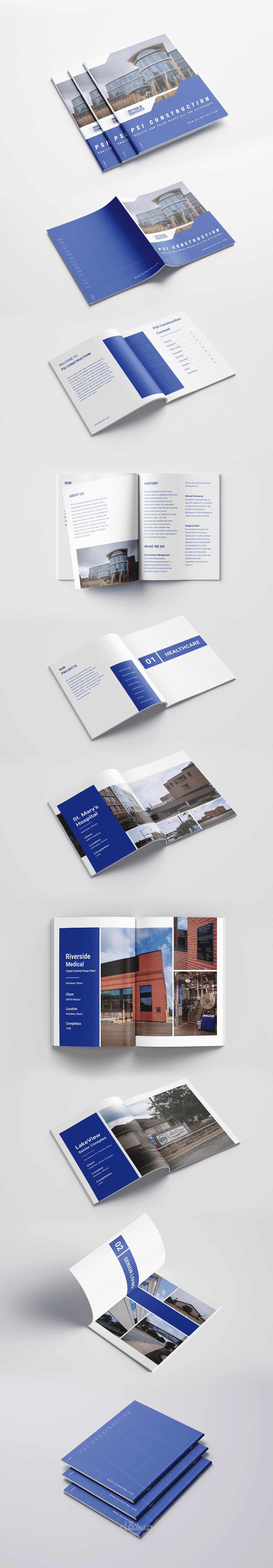 تصميم كتيب لعرض مشاريع شركة "PSI Construction" المختصة في بناء المجمعات الاستشفائية والتكنولوجية