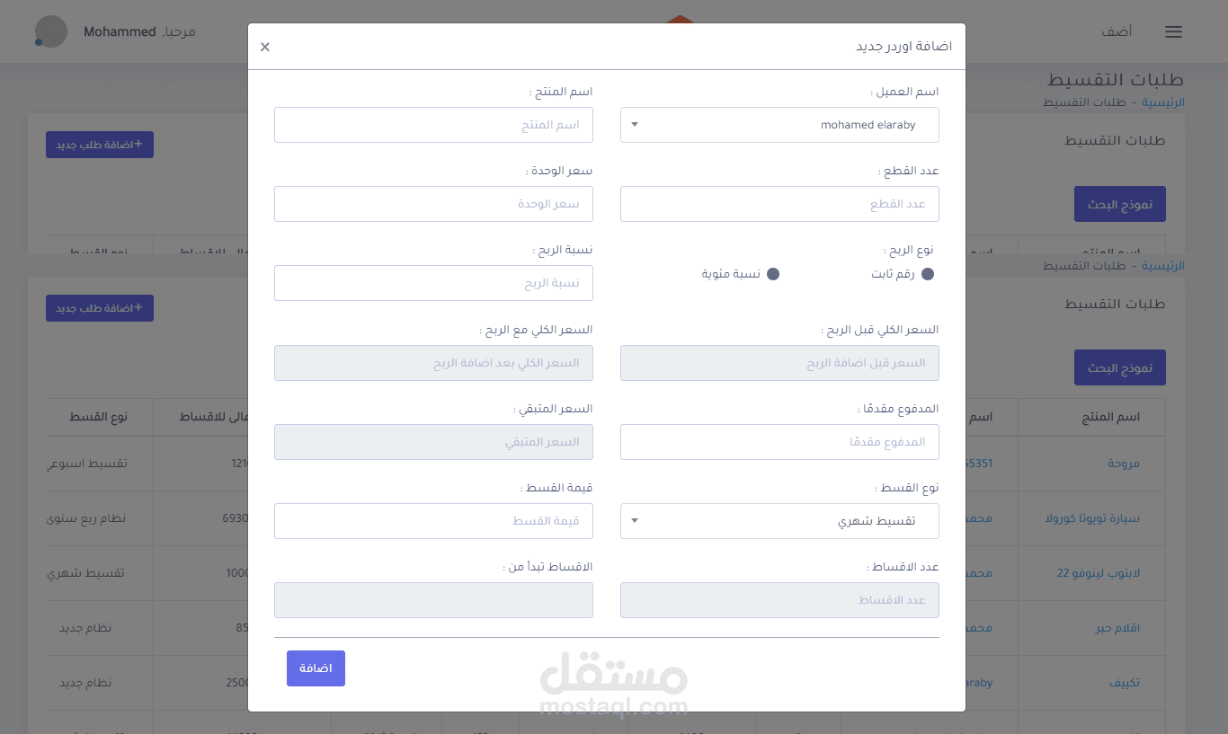 - Employees write product name, price, Interest value, choose Interest value percent or Fixed value, and the value of installments.