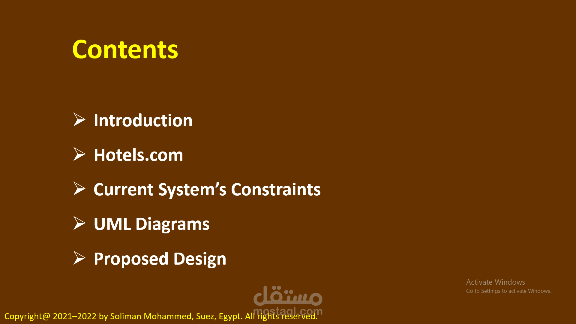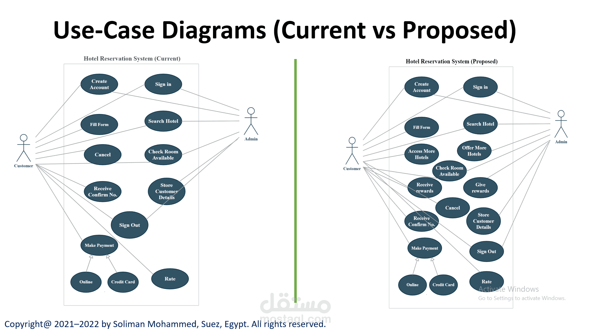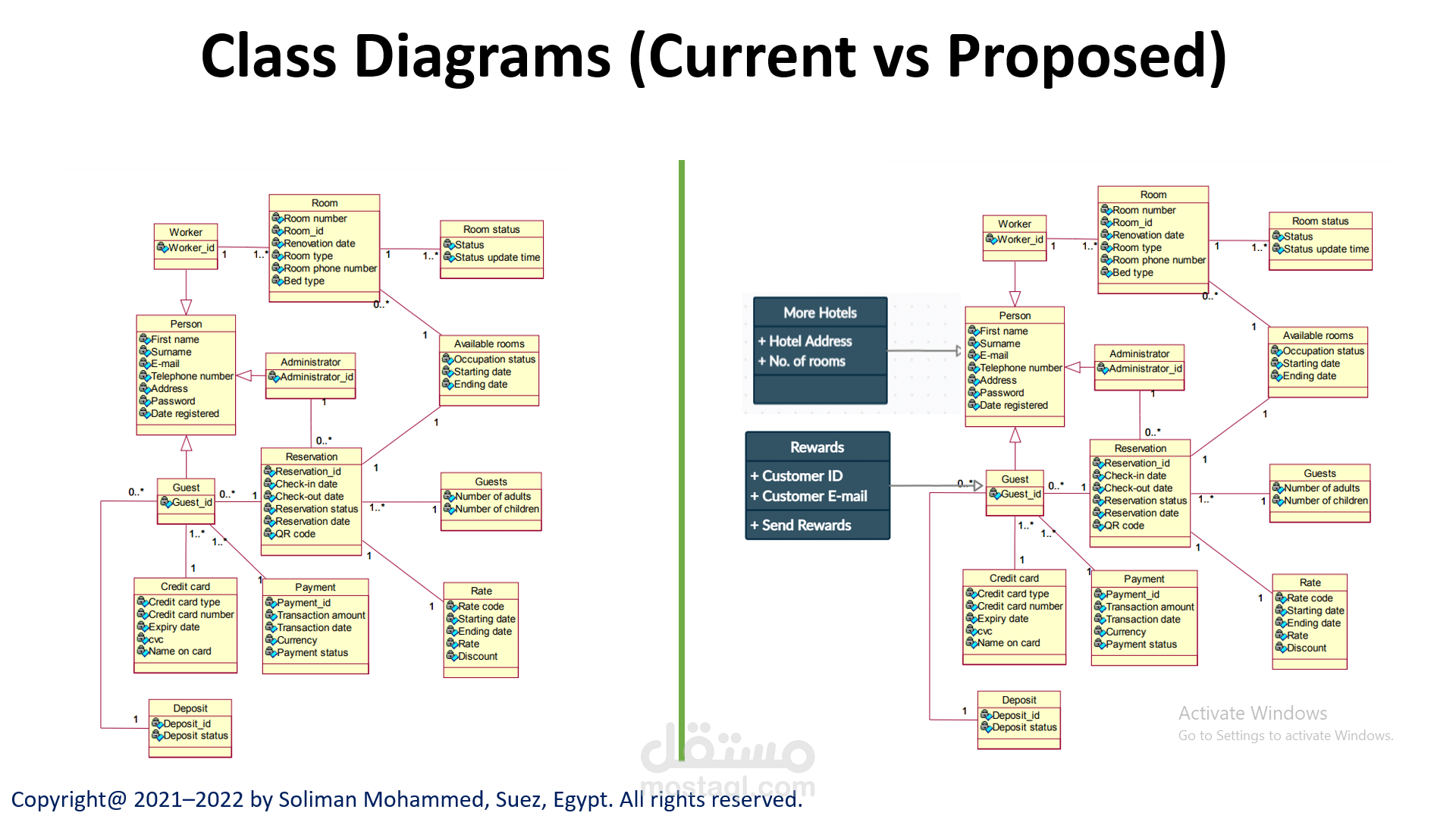 إنه نموذج عرض تقديمي لتحليل (Analysis) نظام حجز فنادق Hotel Reservation System الذي يسمح للزوار بحجز الغرف عن طريق الموقع الالكترونى الخاص بالشركة، لذلك ف قد قمت بتحليله باستخدام مخططات UML مثل ERD - DFD - Use Case Diagram - Class Diagram - Sequence Diagram (Register) - Sequence Diagram (Login) - Sequence Diagram (Reserve a room) - WBS - Activity Diagram بالإضافة الى كتابة السيناريو والنبذة والتنسيق والموشن او الحركة والتدقيق اللغوي والإملائي. إنه تحليل دقيق موثوق، ويمكنني إضافة المزيد من المخططات والتعديلات حسب الطلب.