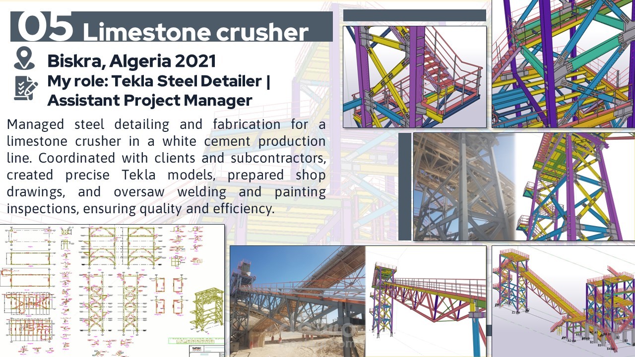تم إدارة تفصيل وتصنيع الهياكل الفولاذية لكسارة الحجر الجيري في خط إنتاج الأسمنت الأبيض لصالح مصنع "البسكرية للأسمنت" في الجزائر.