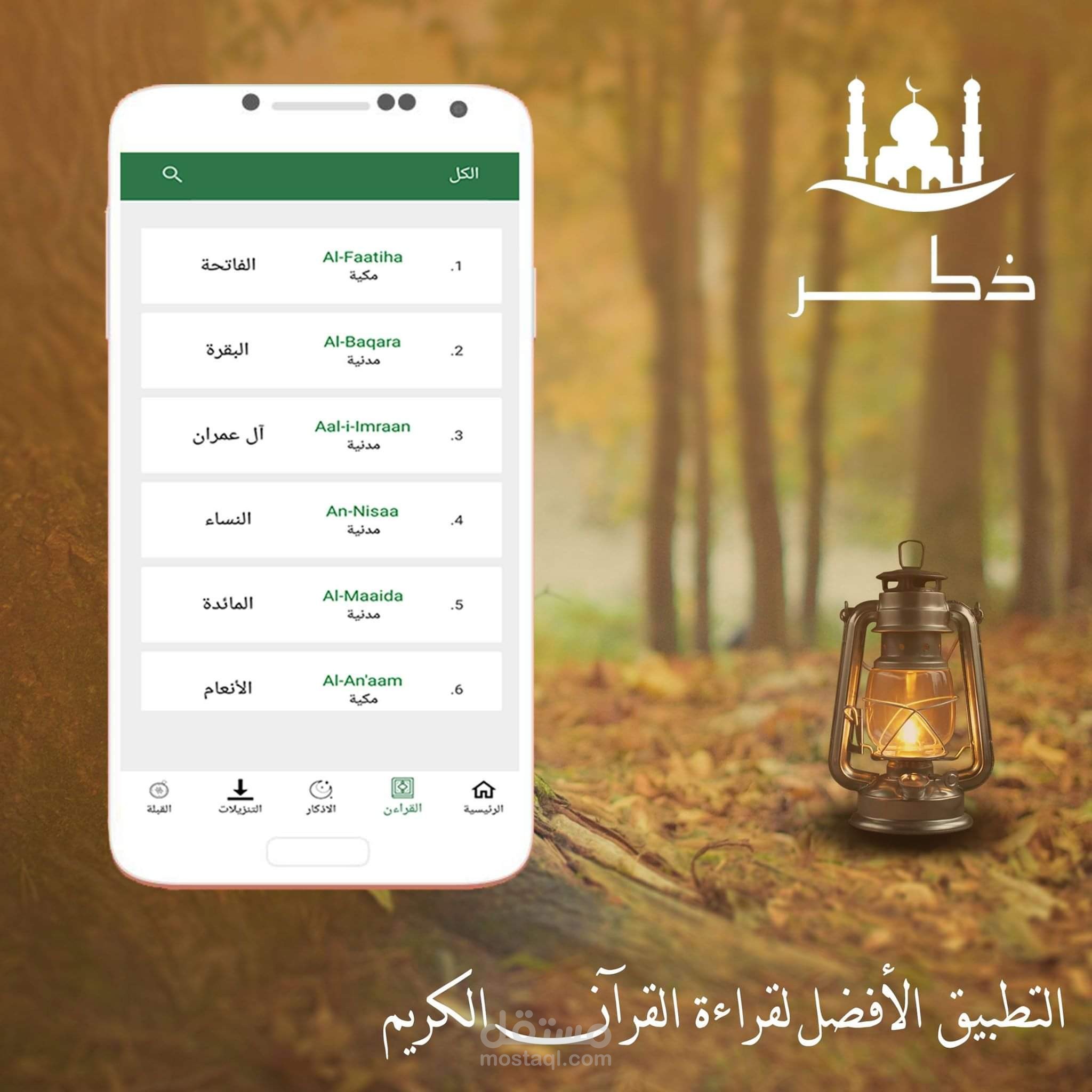 تطبيق ذُكر تطبيق للقراءن الكريم يعمل على كل من النظامين الاندرويد وال ios يحتوي ع الخصائص التالي: - تطبيق يحتوي على ال dark mode and light mode. - وردك اليومي من القراءن. - القراءن الكريم بلغتين العربية والانجليزية. - يمكنك التحميل السورة بصوت اكثر من 20 شيخ موجودين داخل التطبيق . - media player داخليه يمكنك من خلالها التحكم بالاصوات التي تم تنزيلها وسماعها. - تحديد القبلة. - أذكار المسلم (يشمل ع جميع الأذكار)