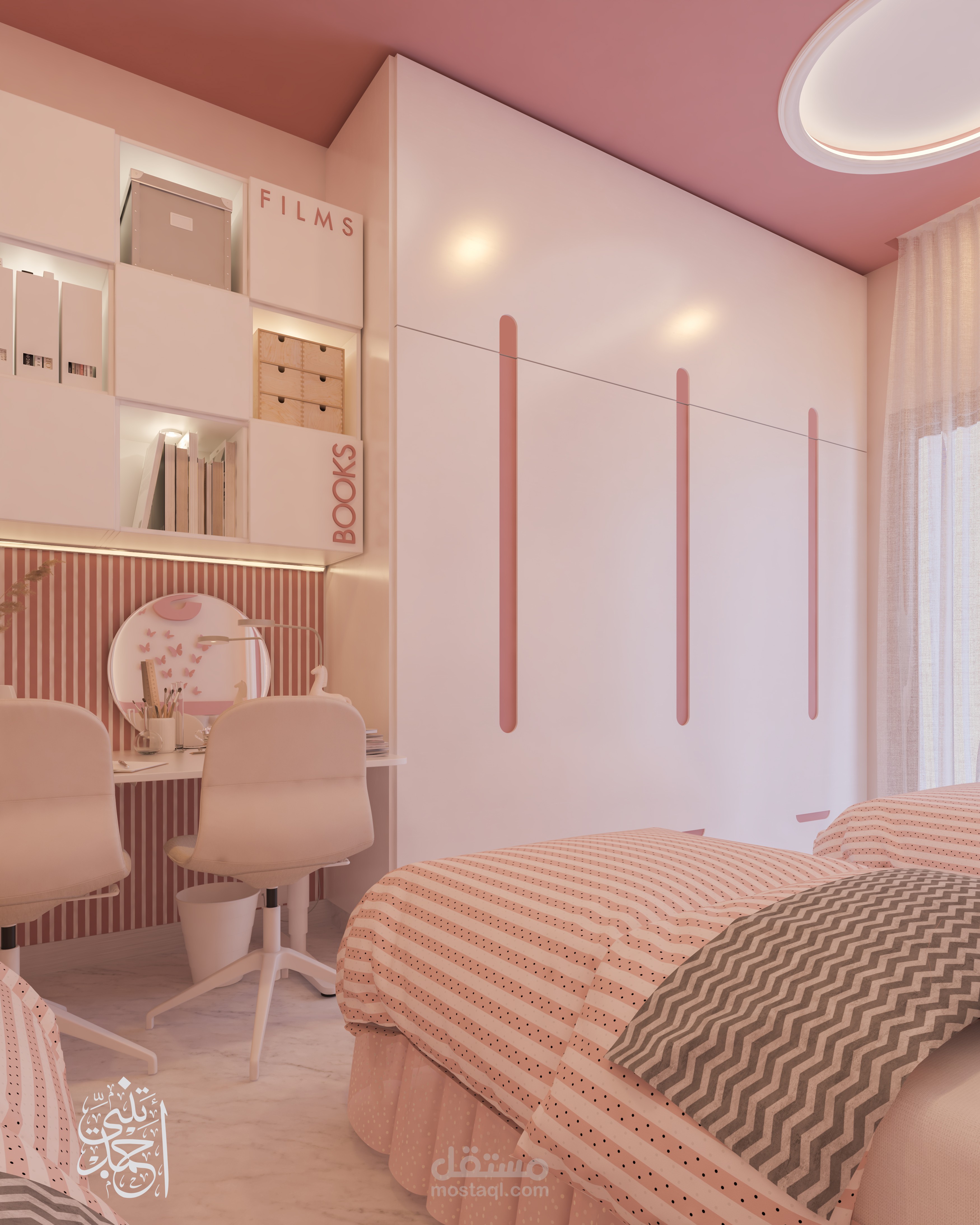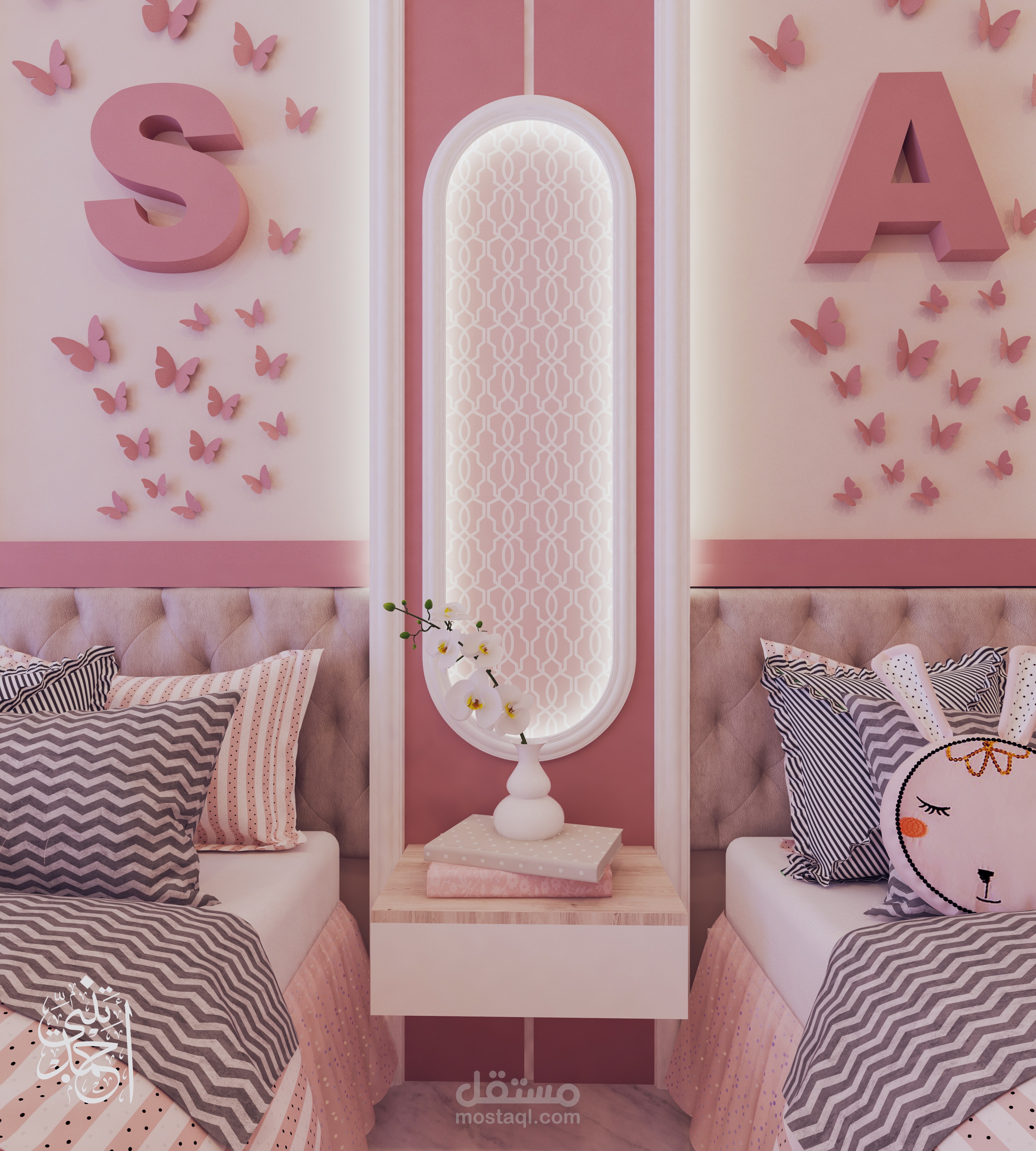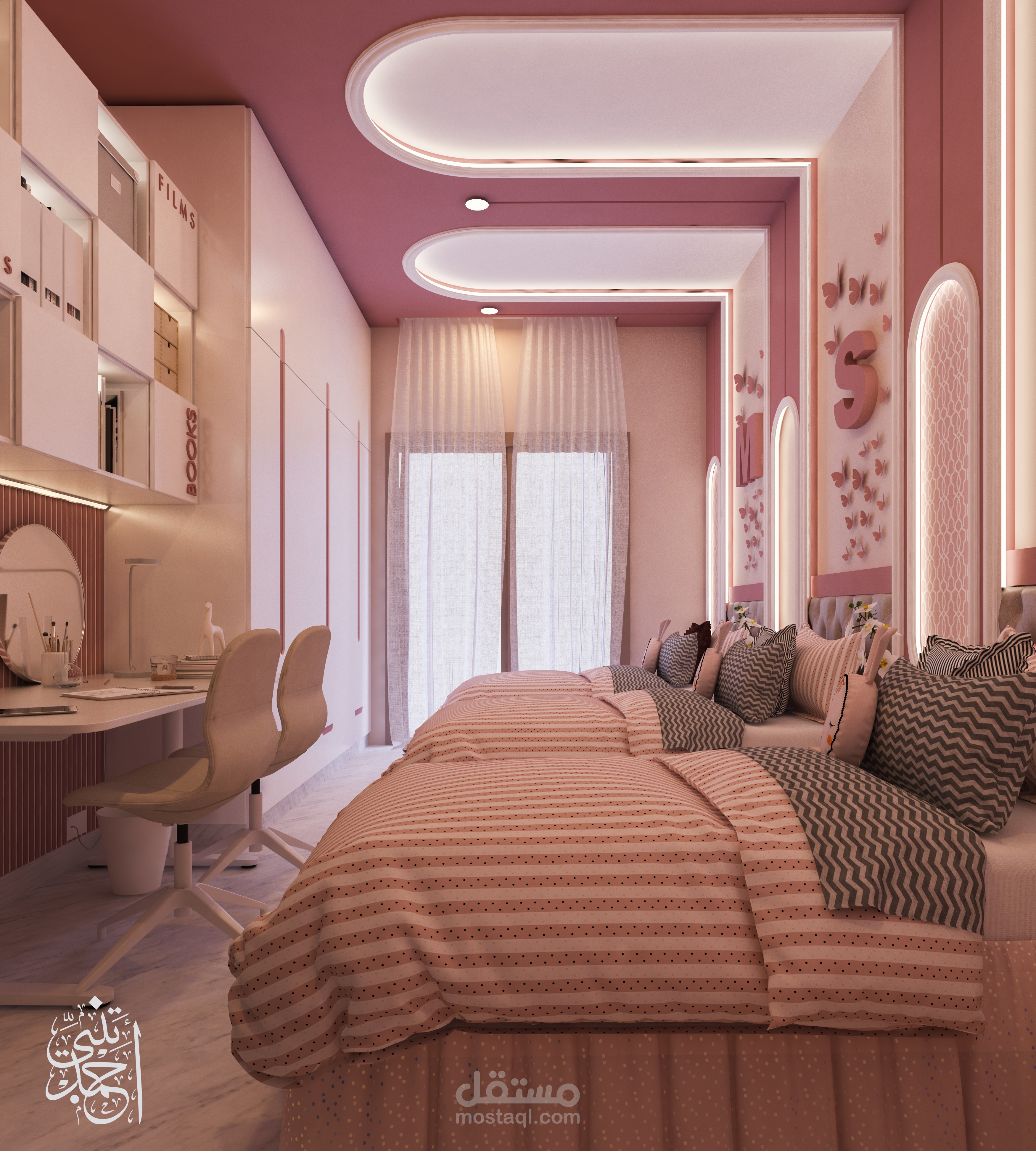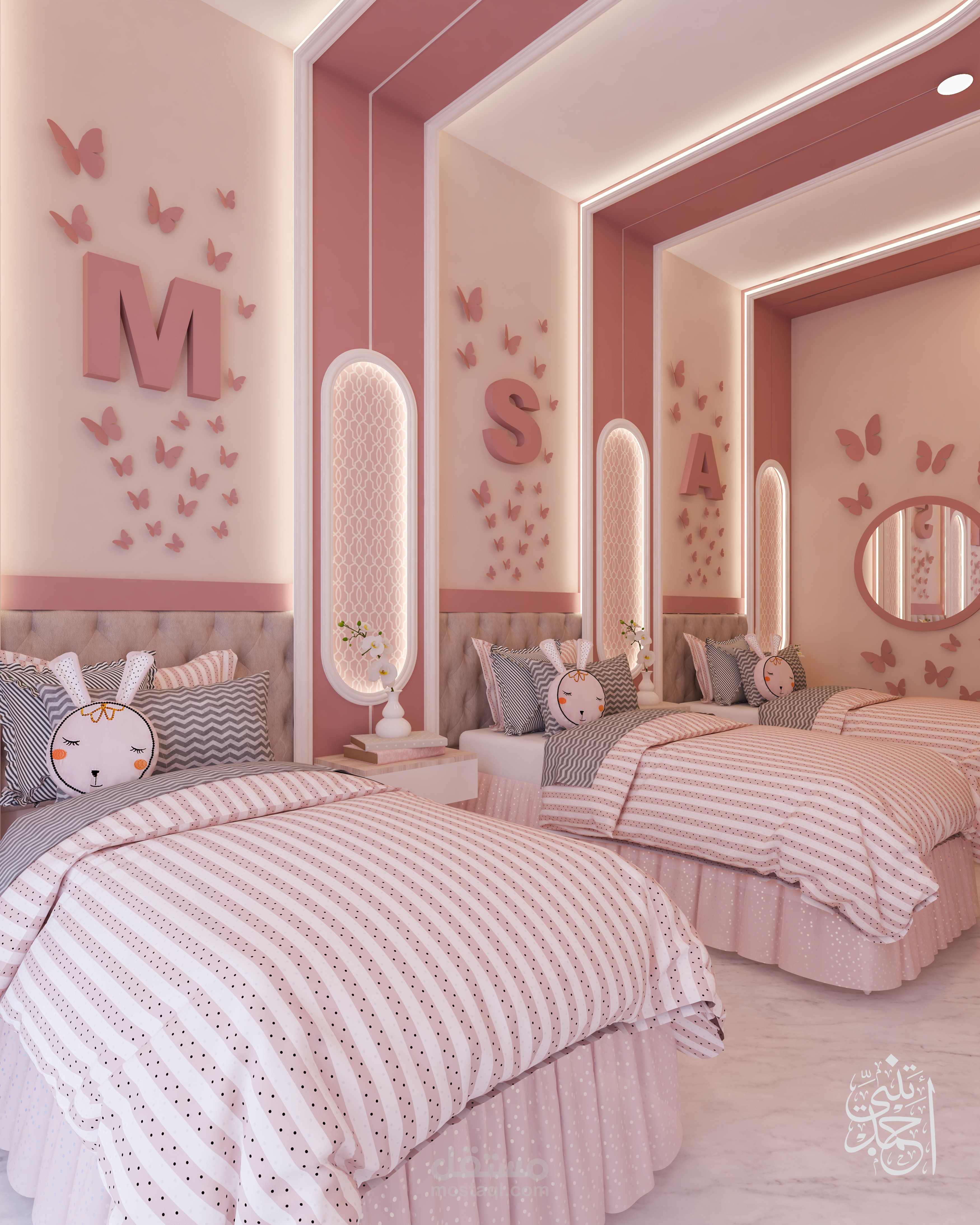 تصميم غرفة نوم لثلاث بنات راعيت توزيع العناصر للأسرة بشكل متوازي مع مكان للدراسة وتمييز كل سرير