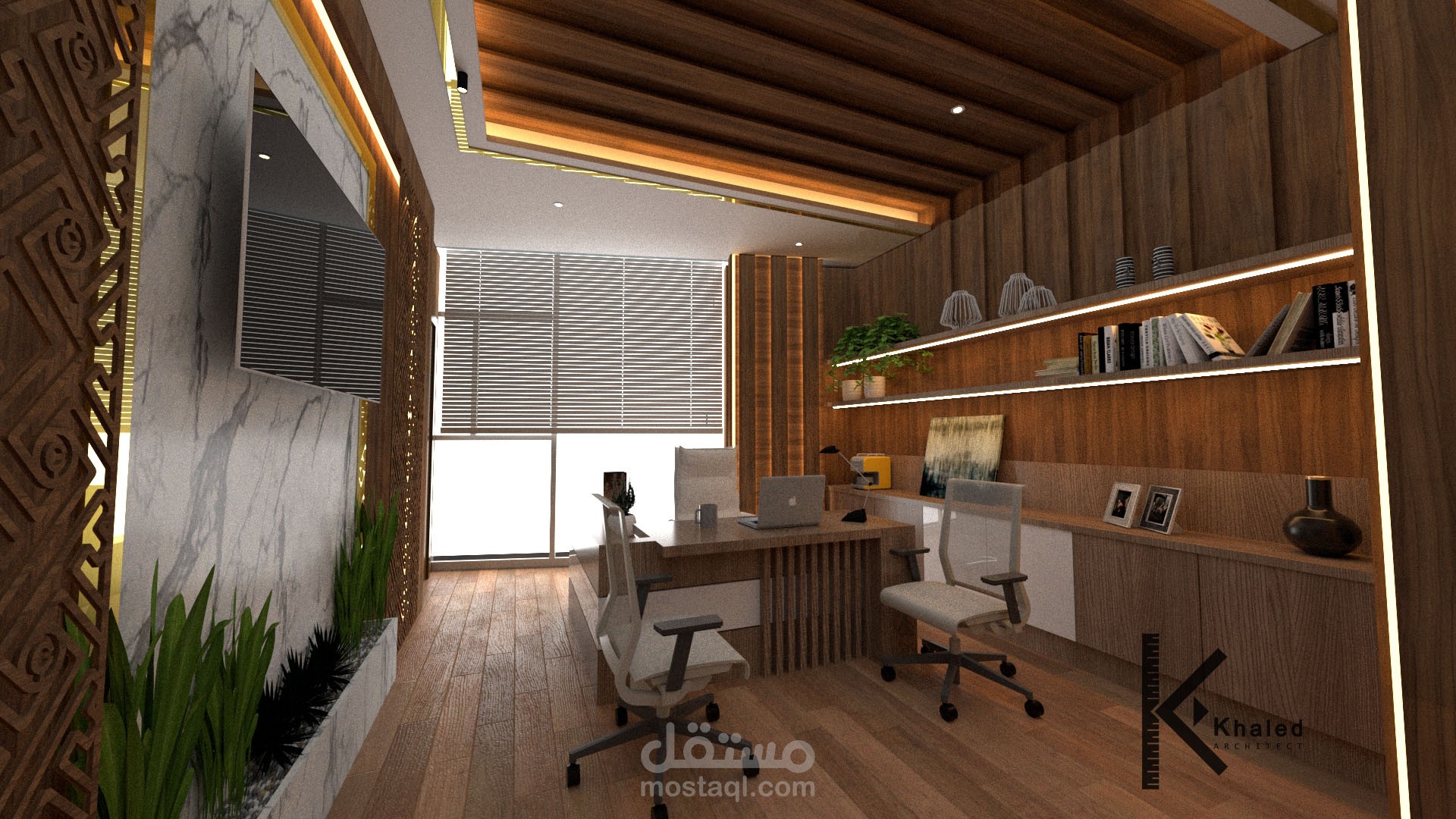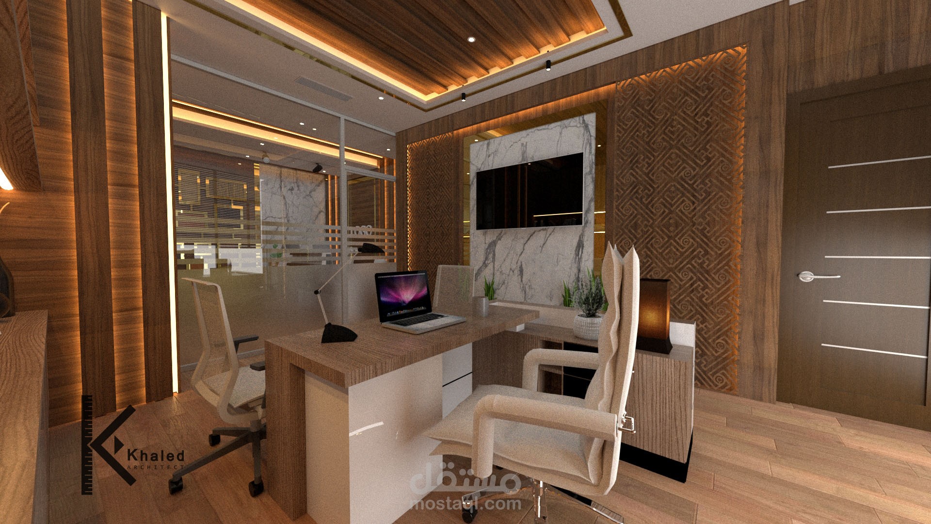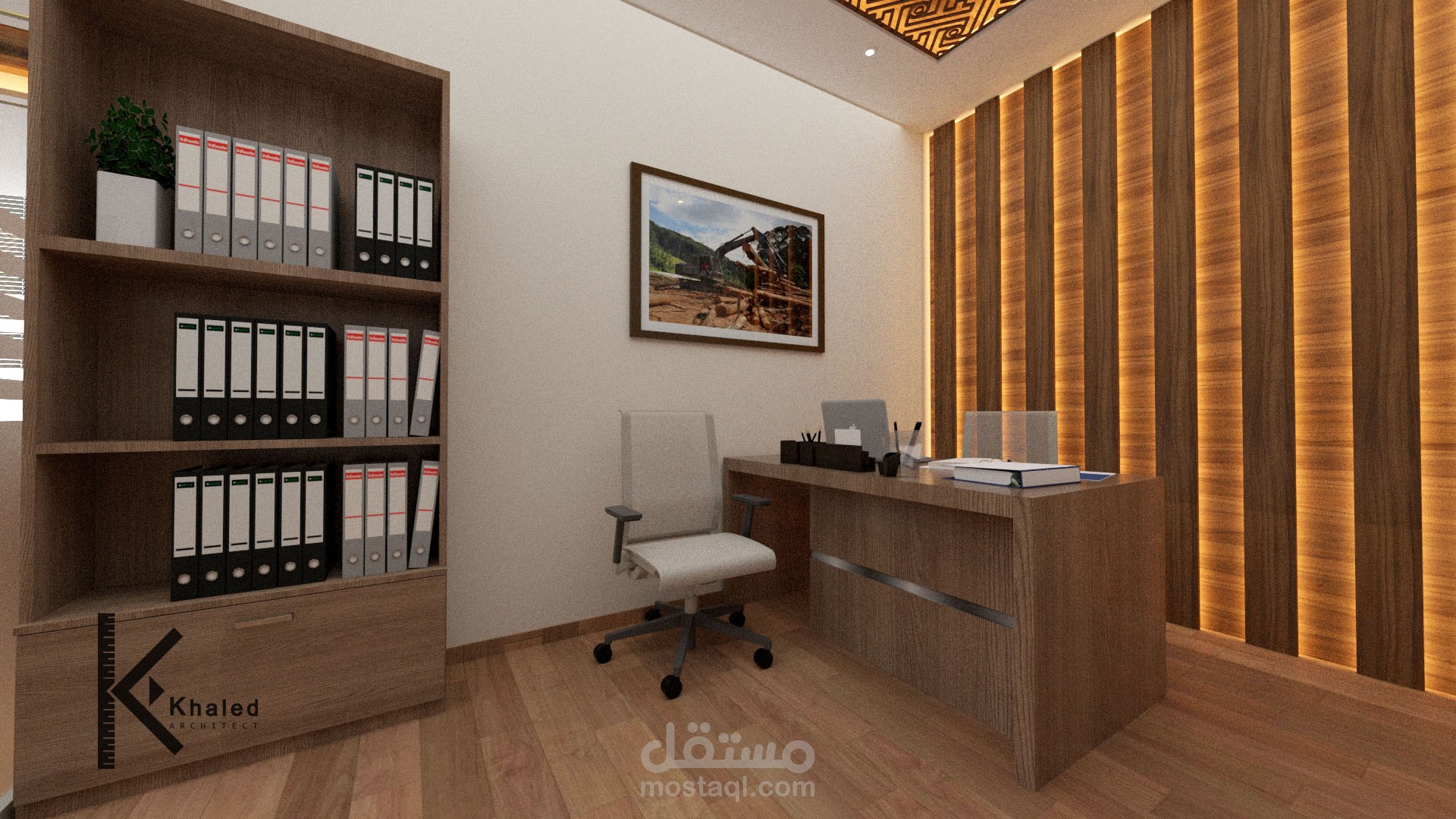 تصميم داخلي لمكتب شركة أخشاب بالسعودية على الطراز المودرن وقد تم استخدام الأخشاب والباركيه للأرضيات لتعبر عن هوية الشركه وتجهيز المخططات التنفيذيه وجدول التشطيبات للمشروع