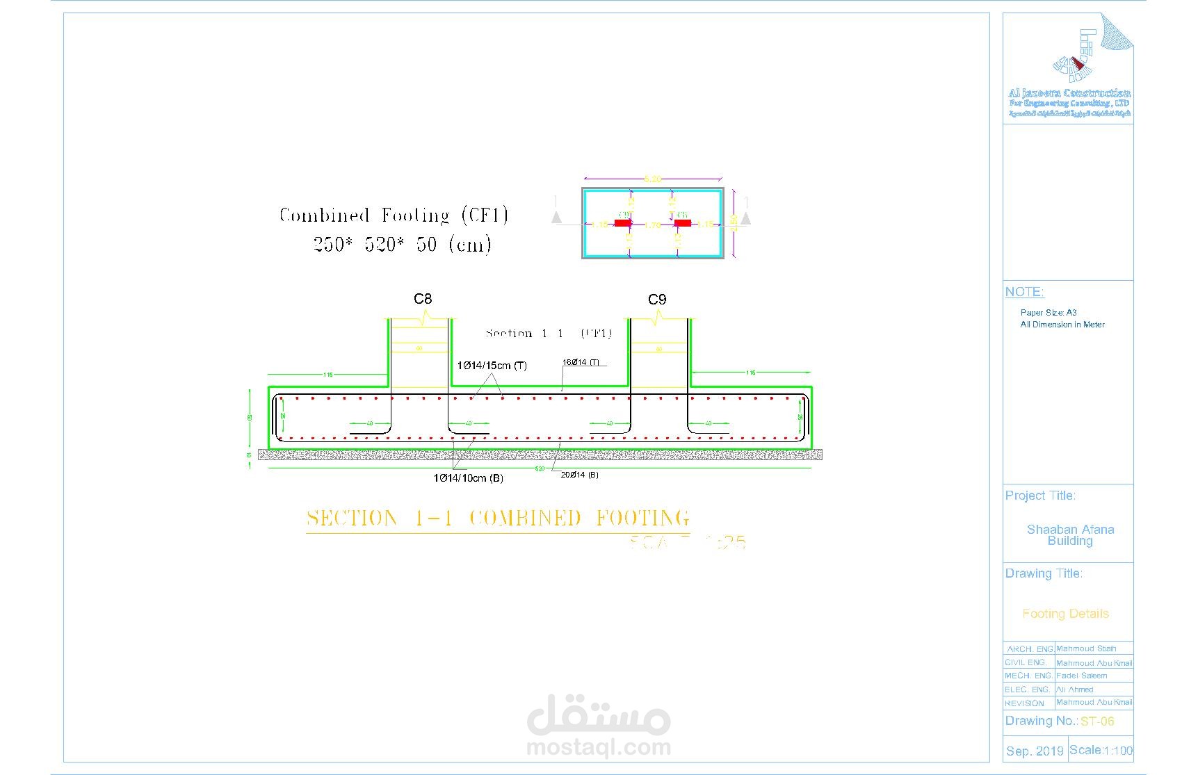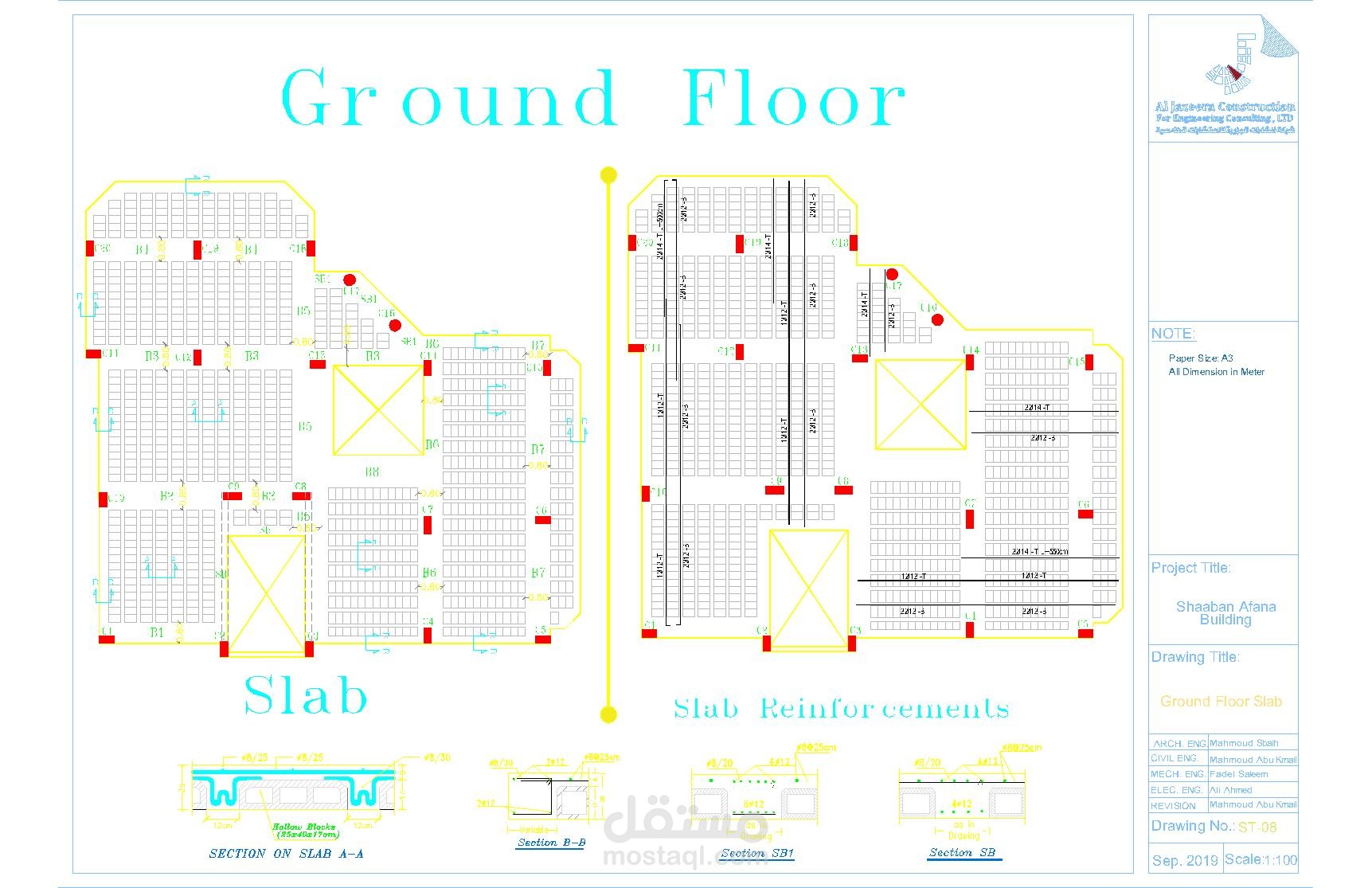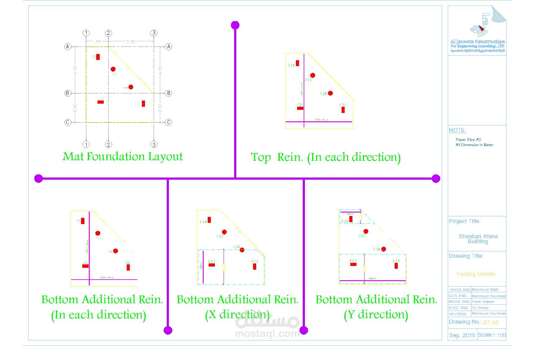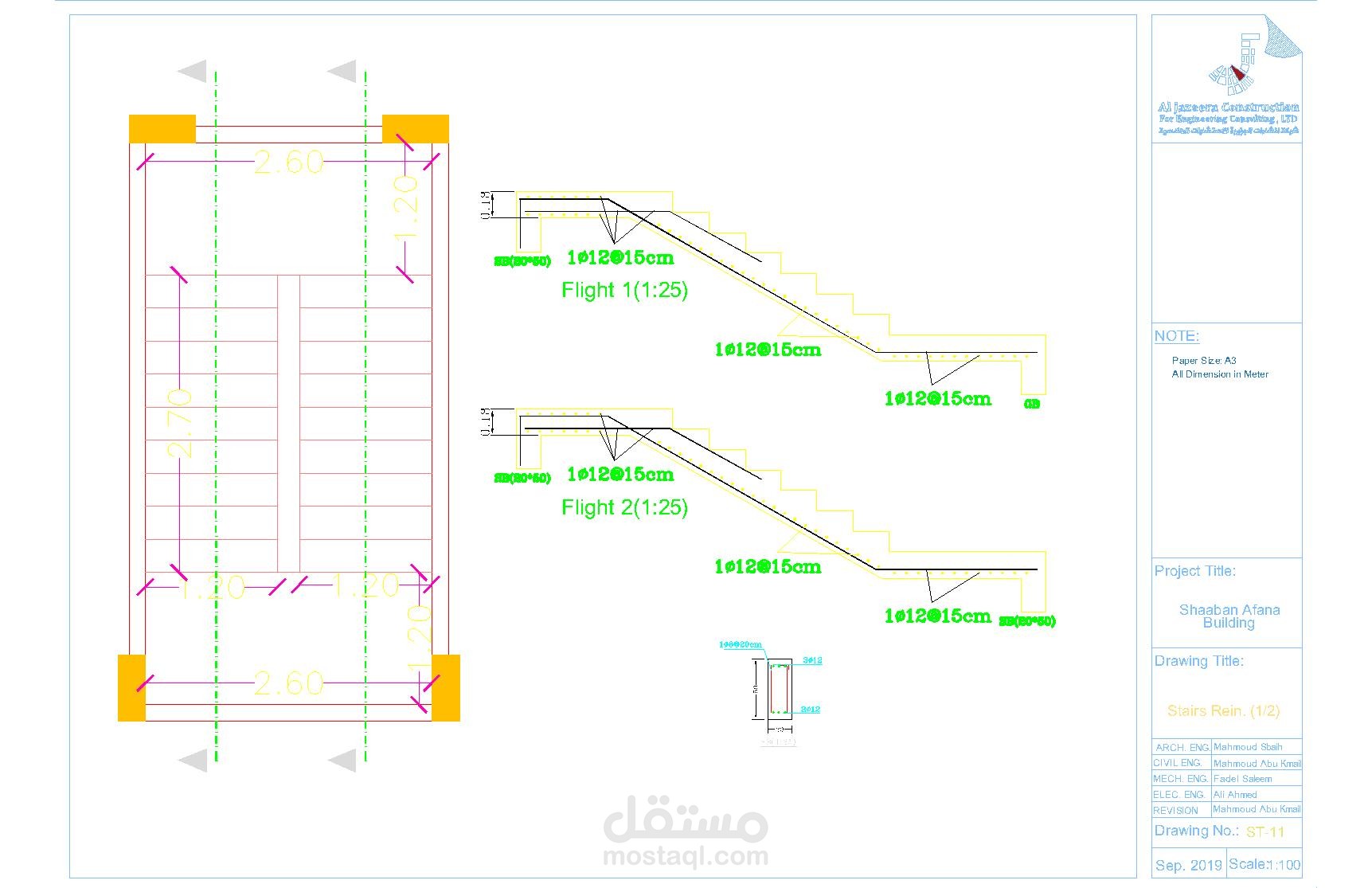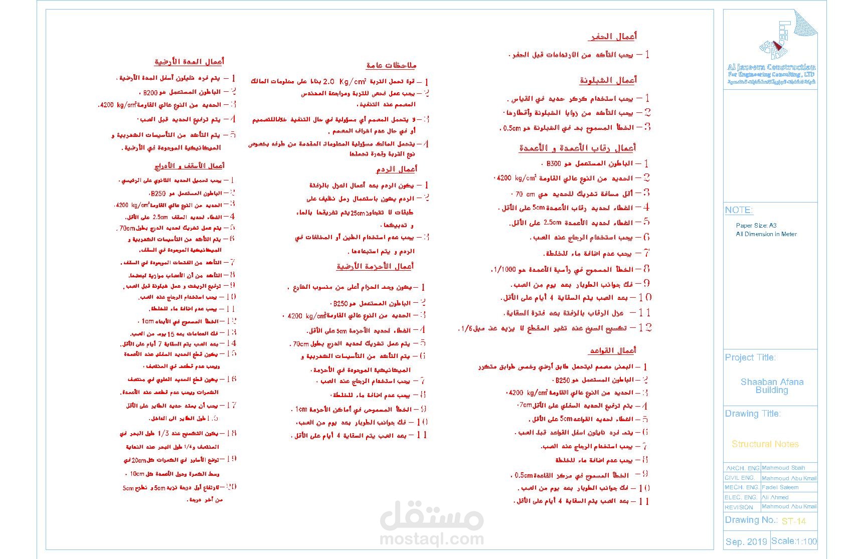 تم بحمد الله عمل تصميم انشائى محترف لفيلا سكنية فى جازان بالمملكة العربية السعودية وذلك طبقاً للكود الامريكي ومواصفات واشتراطات الكود وتم عمل ايضا حصر لكميات الحديد والخرسانة المستخدمة فى الانشاء وتم عمل قطاعات توضح التسليح فى جميع اجزاء المبني مع عمل نوتة حسابية تشمل طريقة حساب الاحمال على عناصر المبني الانشائية وايضا طريقة تصميمها وجميع الاشتراطات الماخوذة فى الحسبان . كما تم ايضا عمل تصميم انشائي للسور وحمام السباحه ومجلس منفصل للرجال ومرفق جميع الملفات للتصميم .