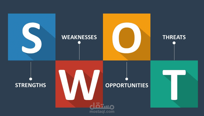 نقاط القوة: توفر الموارد التي يمكن استغلالها في المشروع , نقاط الضعف , الفرص: إمكانيات خارجية تعمل على تحقيق مكاسب للمشروع , التهديدات: ضعف في إمكانيات خارجية للمشروع.