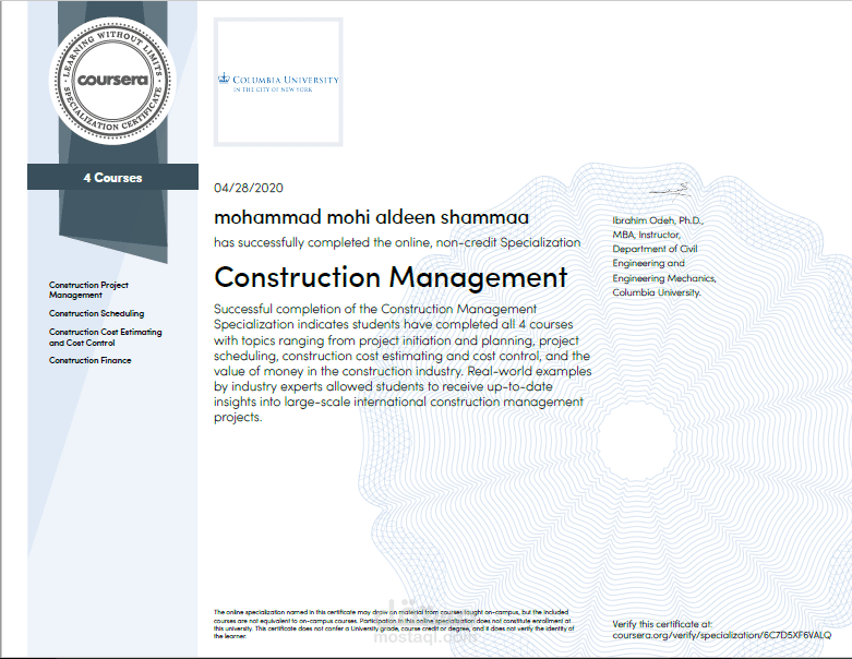 شهادة تخصص بمجال ادارة المشاريع من جامعة كولومبيا الأمريكية في مدينة نيويورك بالتعاون مع منصة كورسيرا