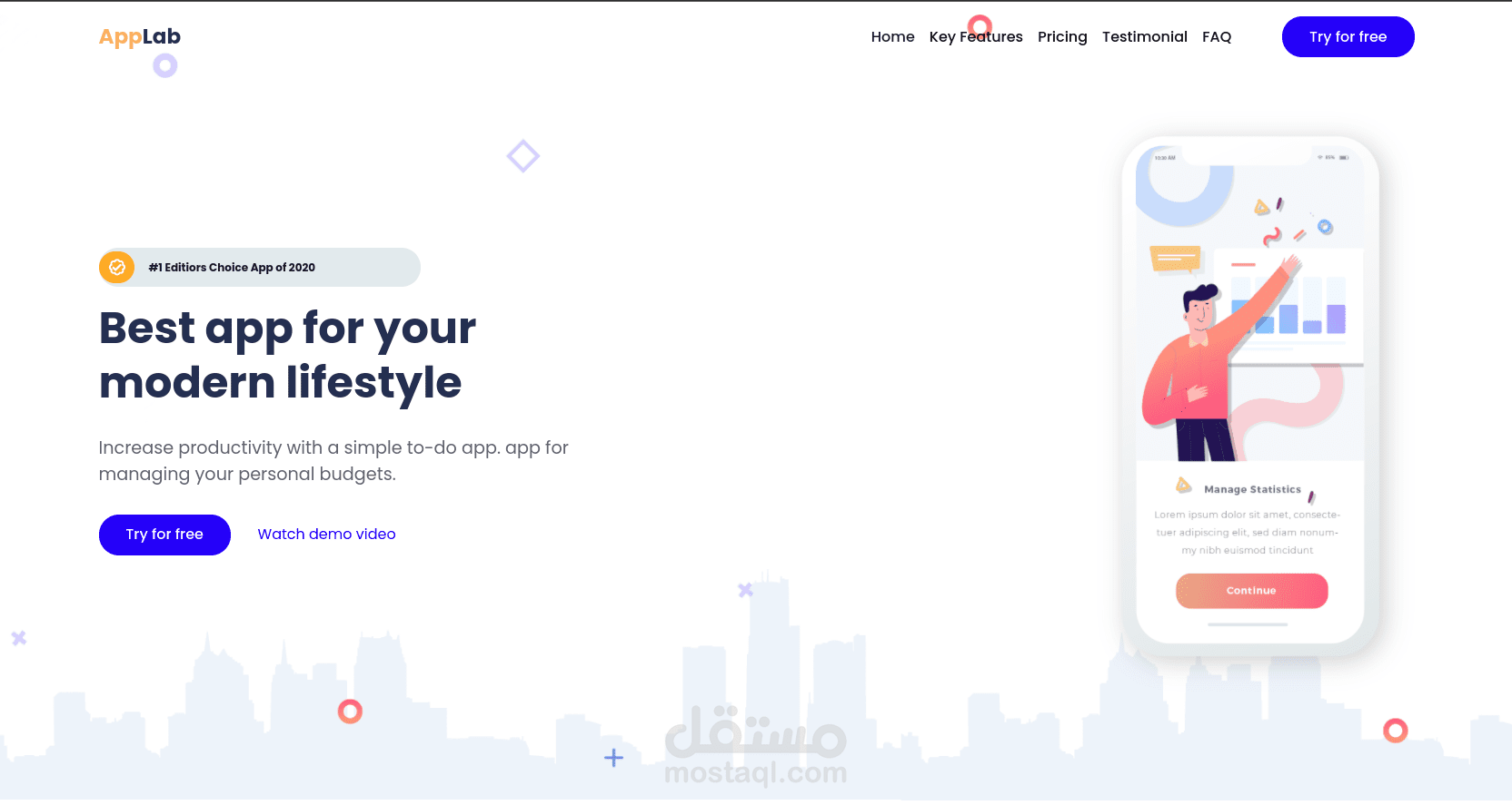 هو صفحة هبوط لتطبيق موبايل متجاوب تماما مع جميع احجام الشاشات ومبني بأحدث التقنياتز