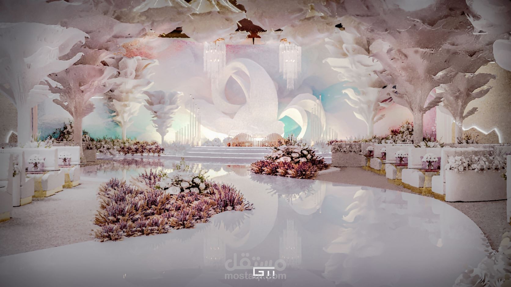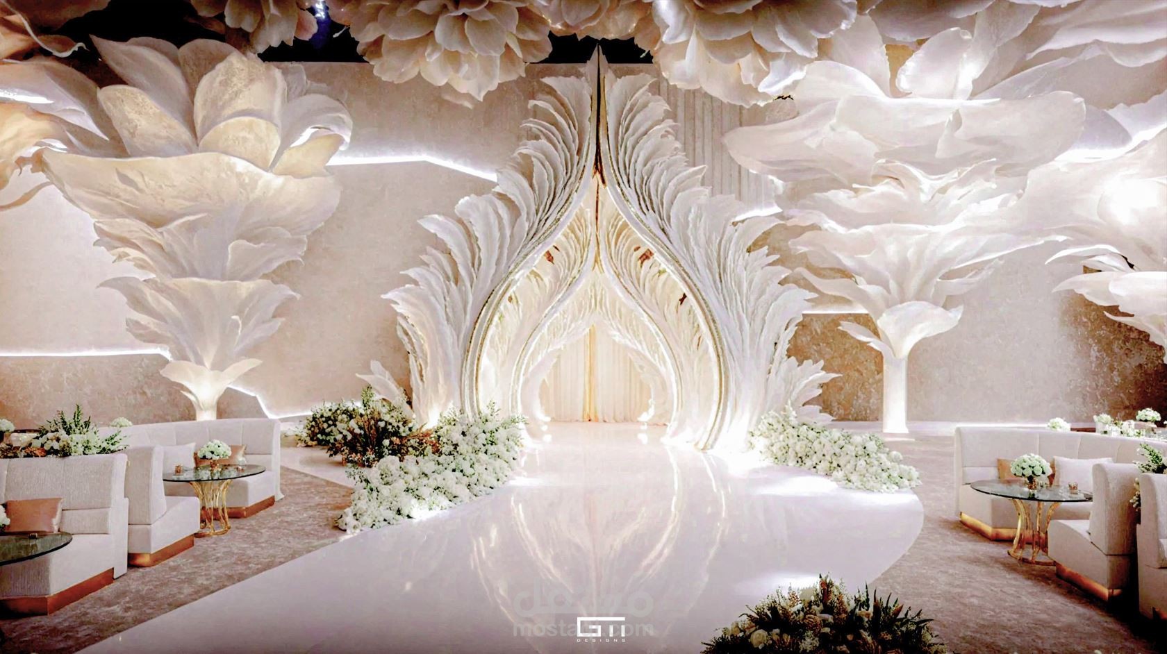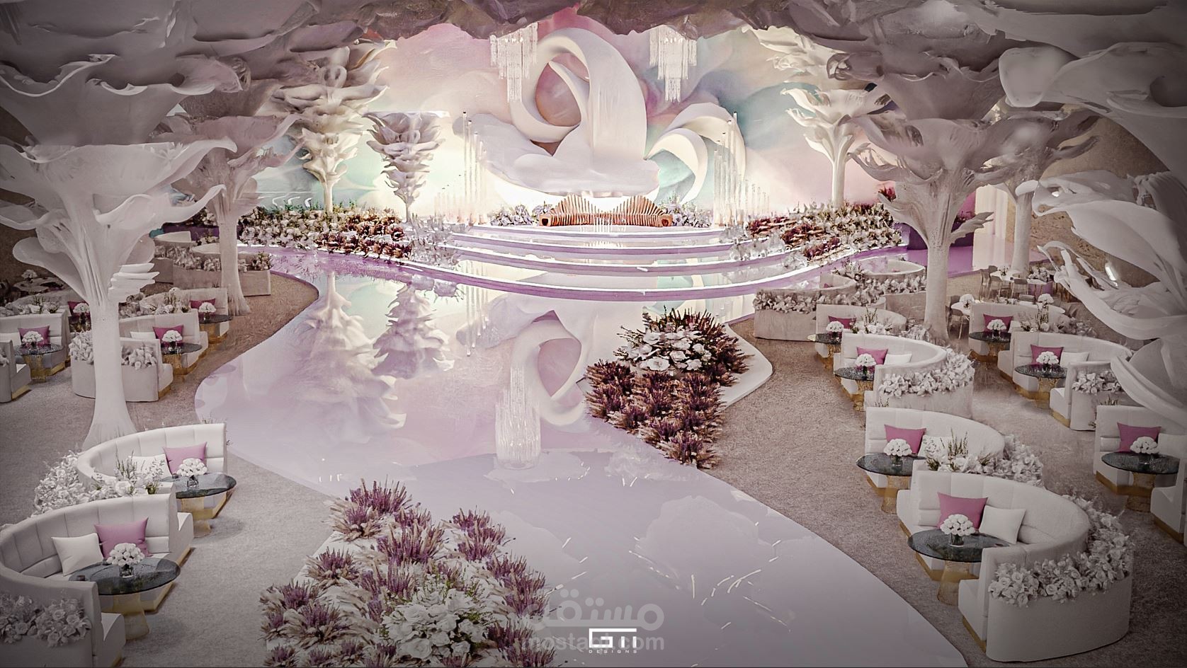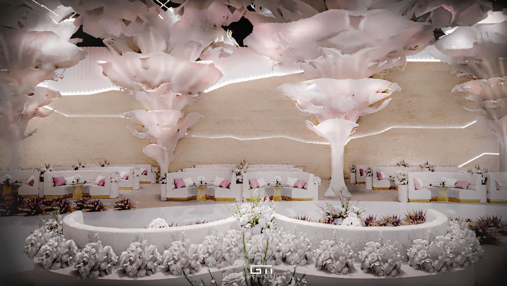 تصميم ابداعى لقاعة حفلات تعتمد على المواد الحديثة بالتصميم و الاقمشة مع الاسلاك لتكون هياكل و اشكال اعمدة و ديكورات تخيلة تفوق الجمال لتكوين تجربة حديثة و متطورة جمالية للتصميم