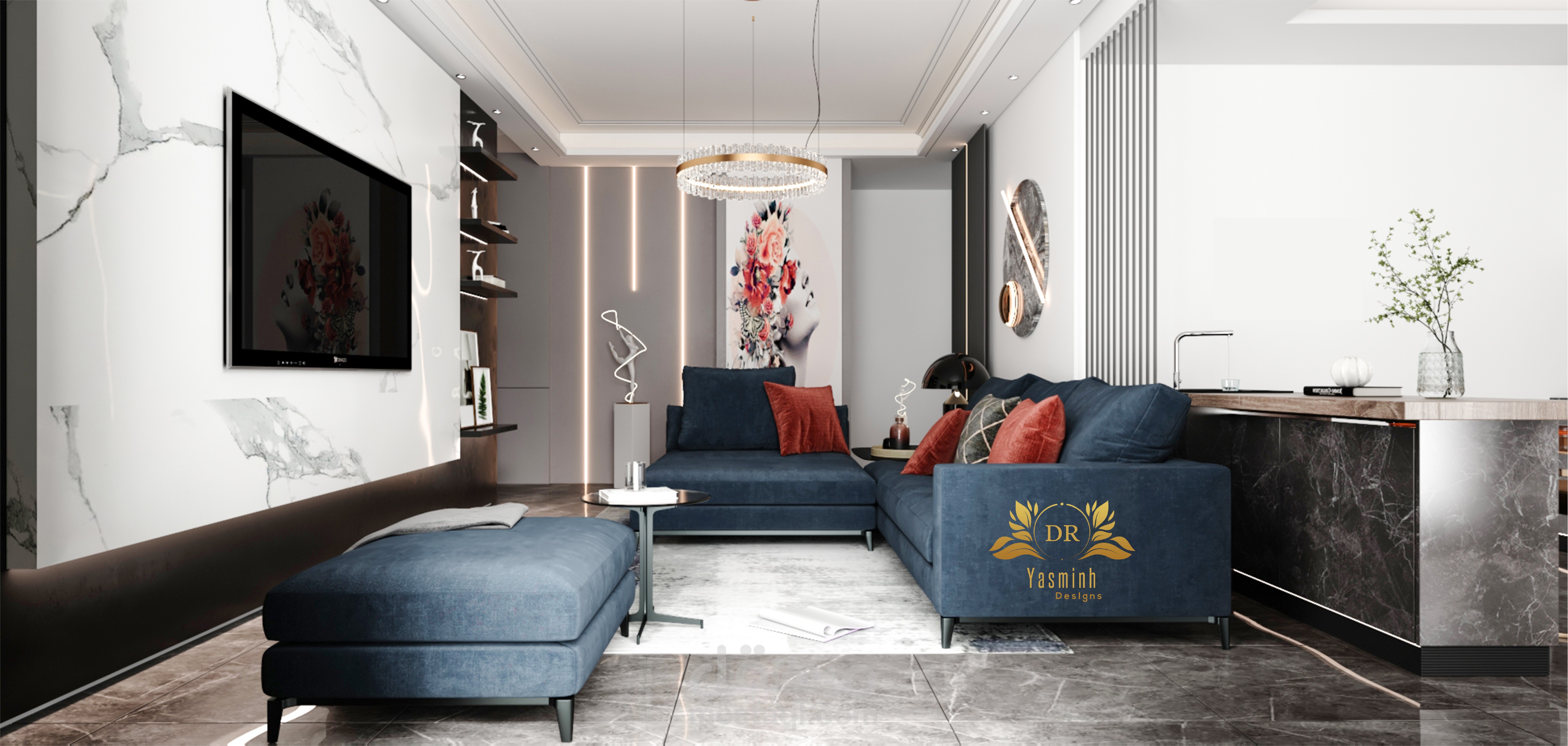 تصميم داخلي مودرن لغرفة معيشة في شقة سكنية في دمشق