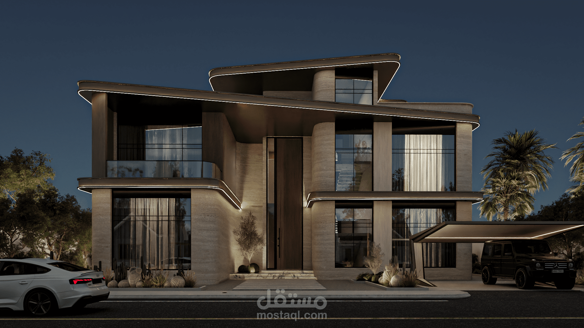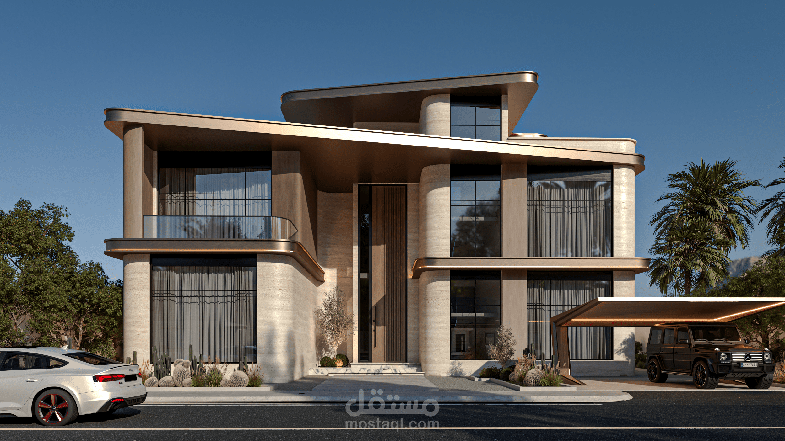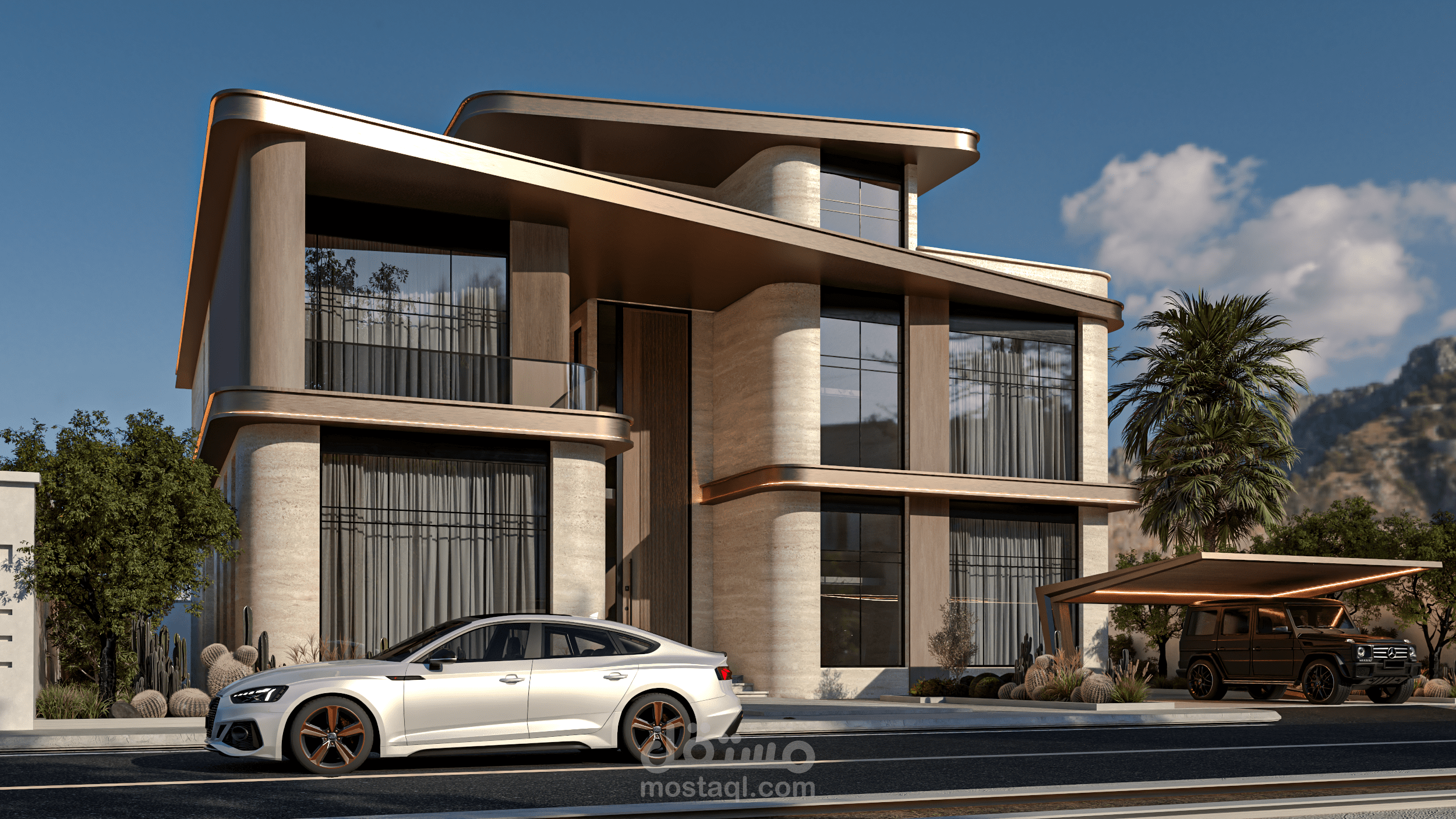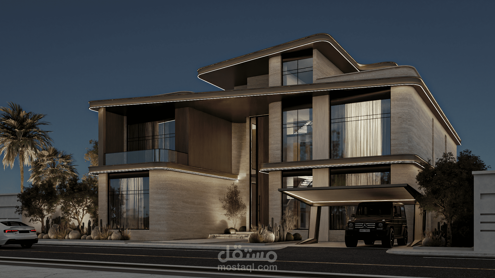 تتميّز الفيلا بتكوين معماري معاصر يعتمد على كتل أفقية متدرجة مع انحناءات ناعمة وأسقف ممتدة، ما يخلق تشكيلًا متوازنًا وأنيقًا.