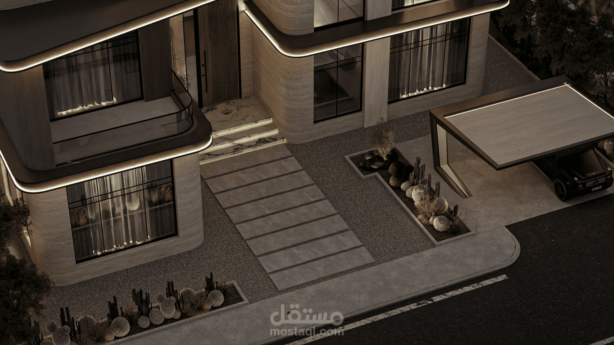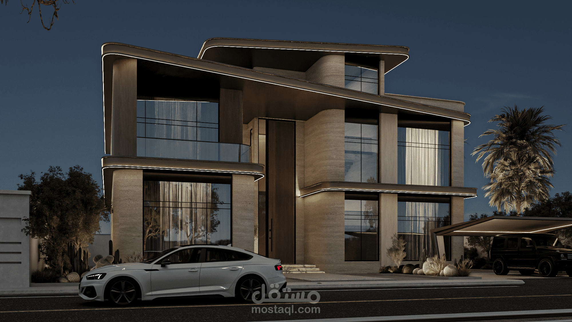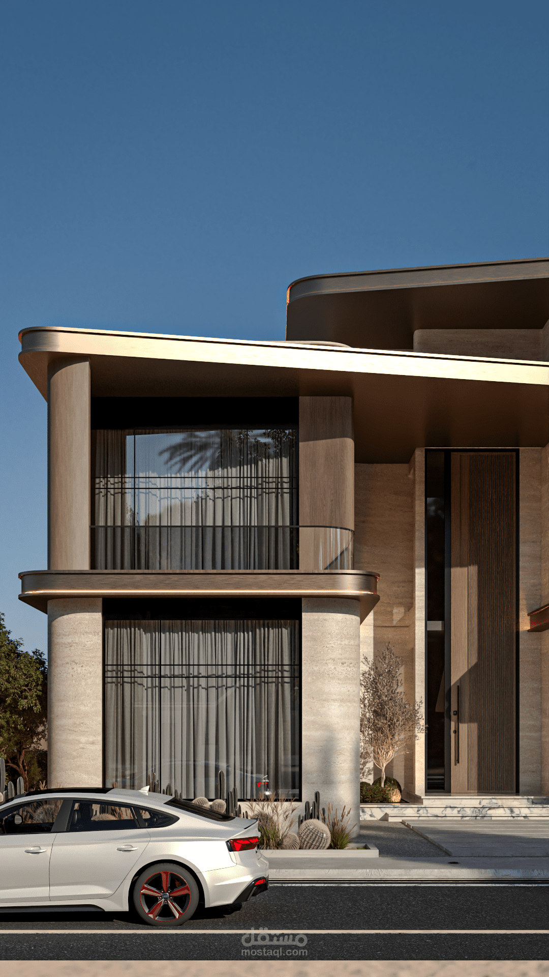 تتميّز الفيلا بتكوين معماري معاصر يعتمد على كتل أفقية متدرجة مع انحناءات ناعمة وأسقف ممتدة، ما يخلق تشكيلًا متوازنًا وأنيقًا.