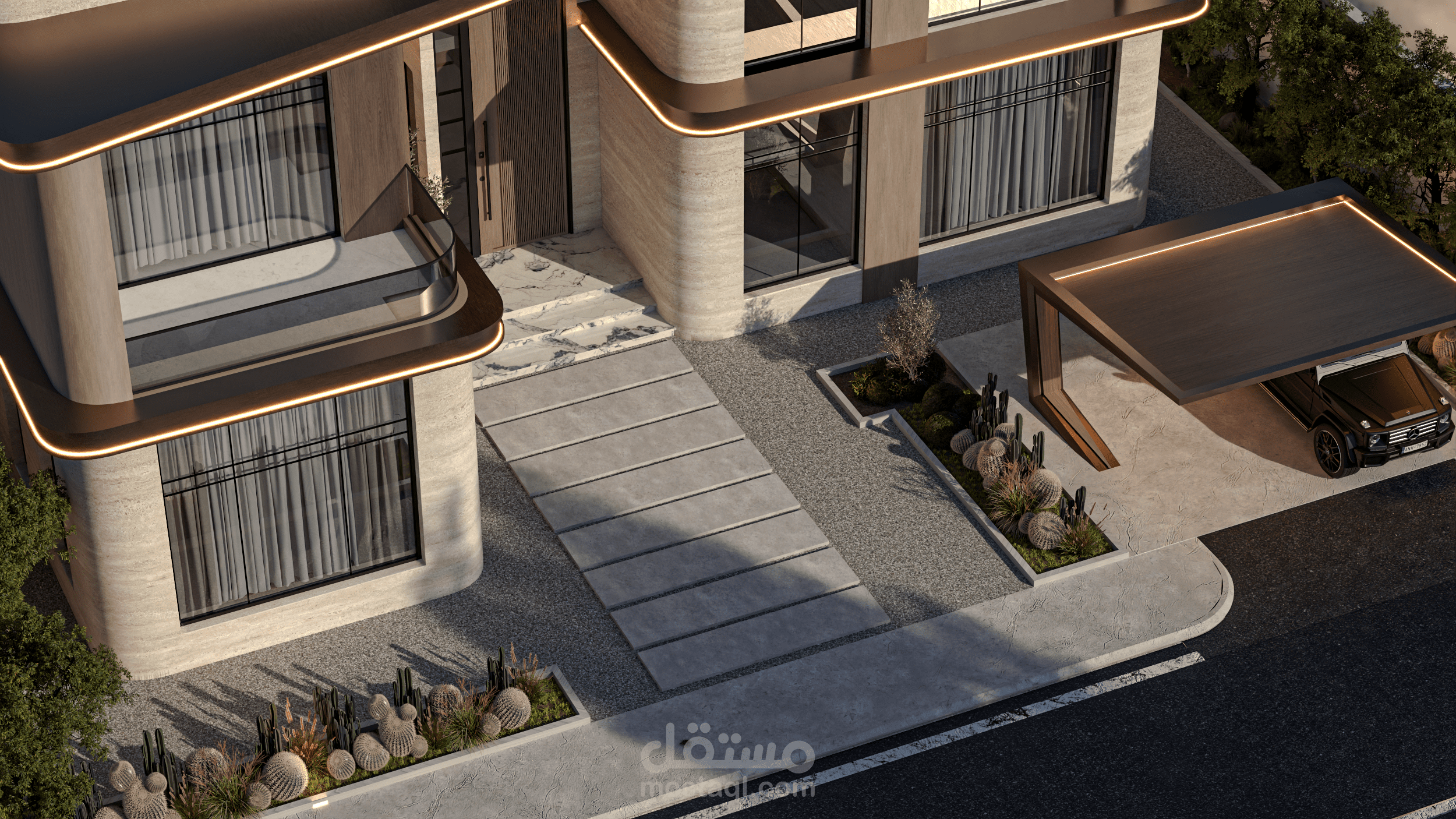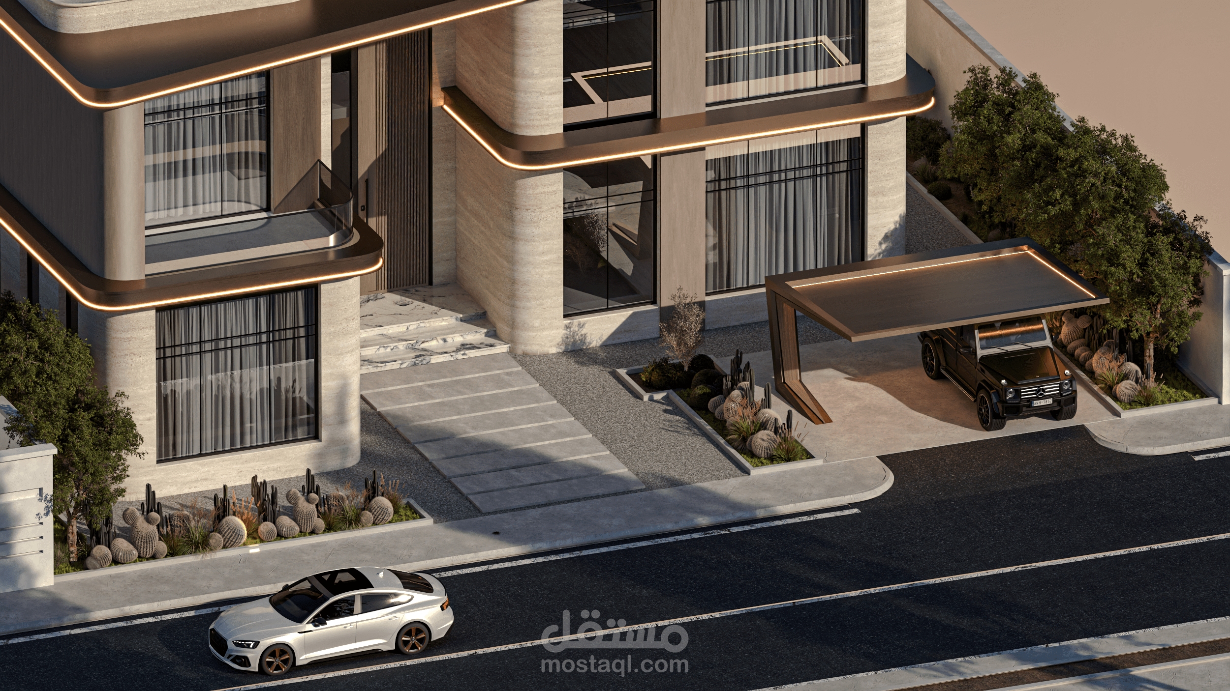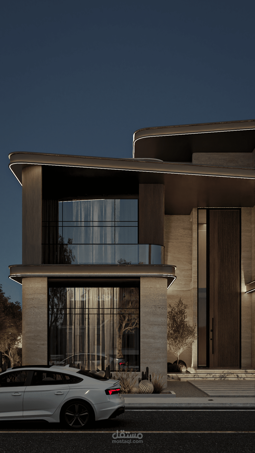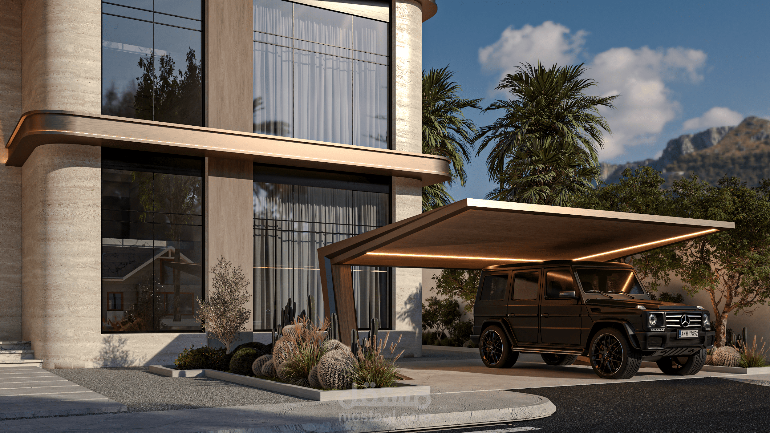 تتميّز الفيلا بتكوين معماري معاصر يعتمد على كتل أفقية متدرجة مع انحناءات ناعمة وأسقف ممتدة، ما يخلق تشكيلًا متوازنًا وأنيقًا.