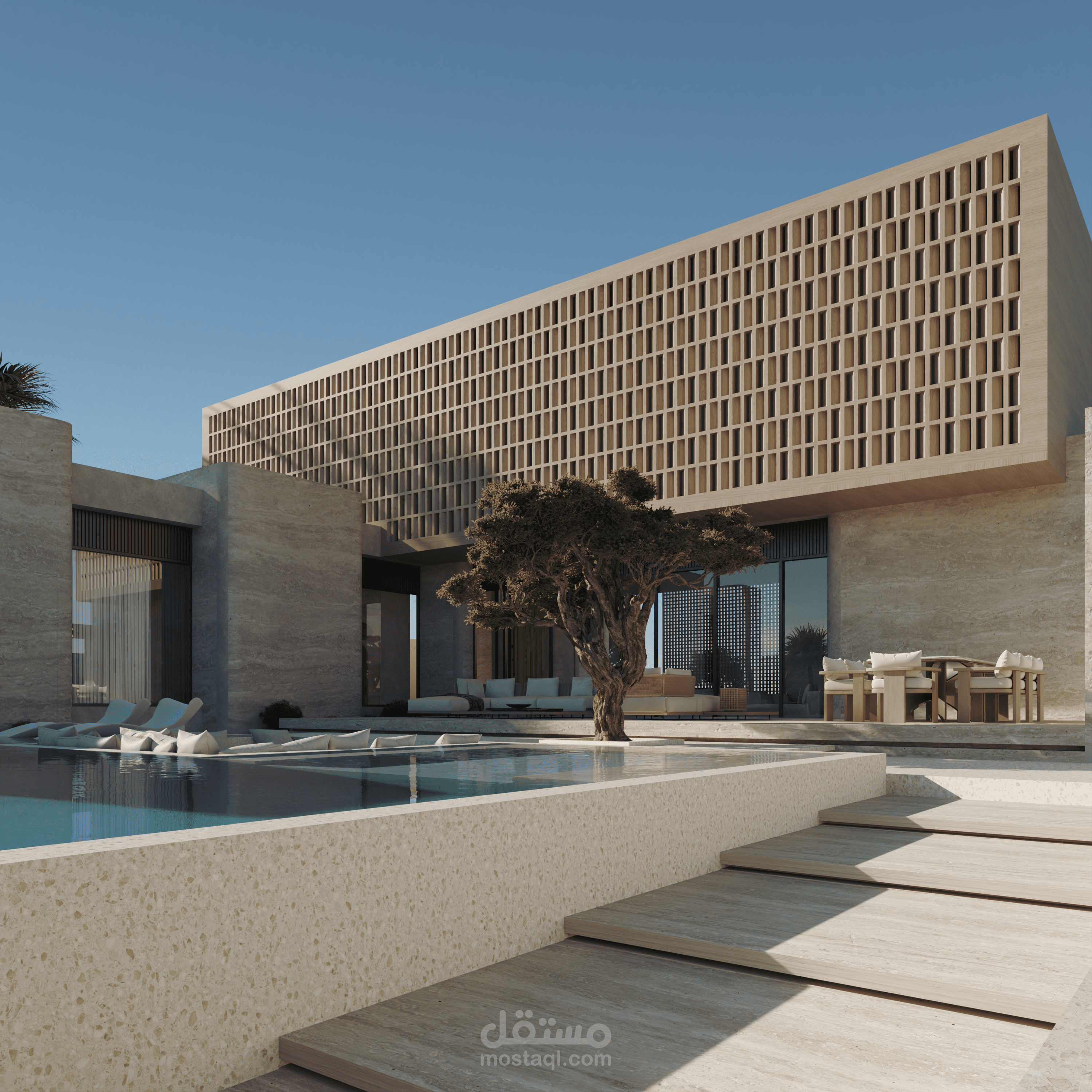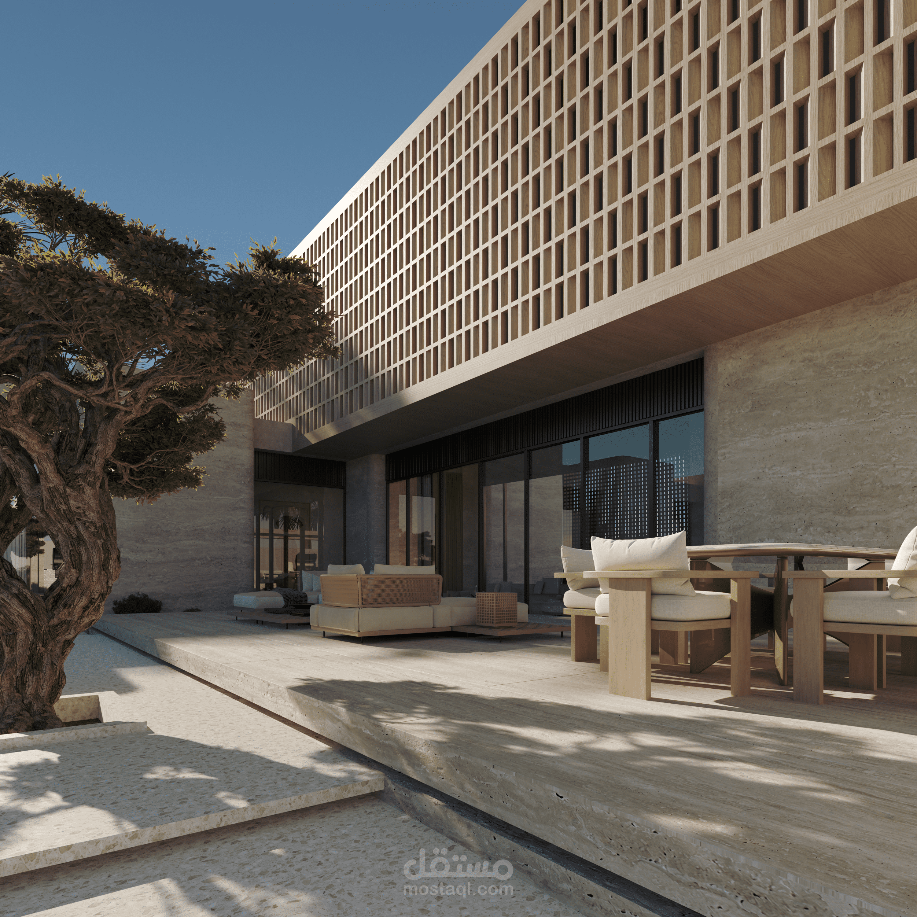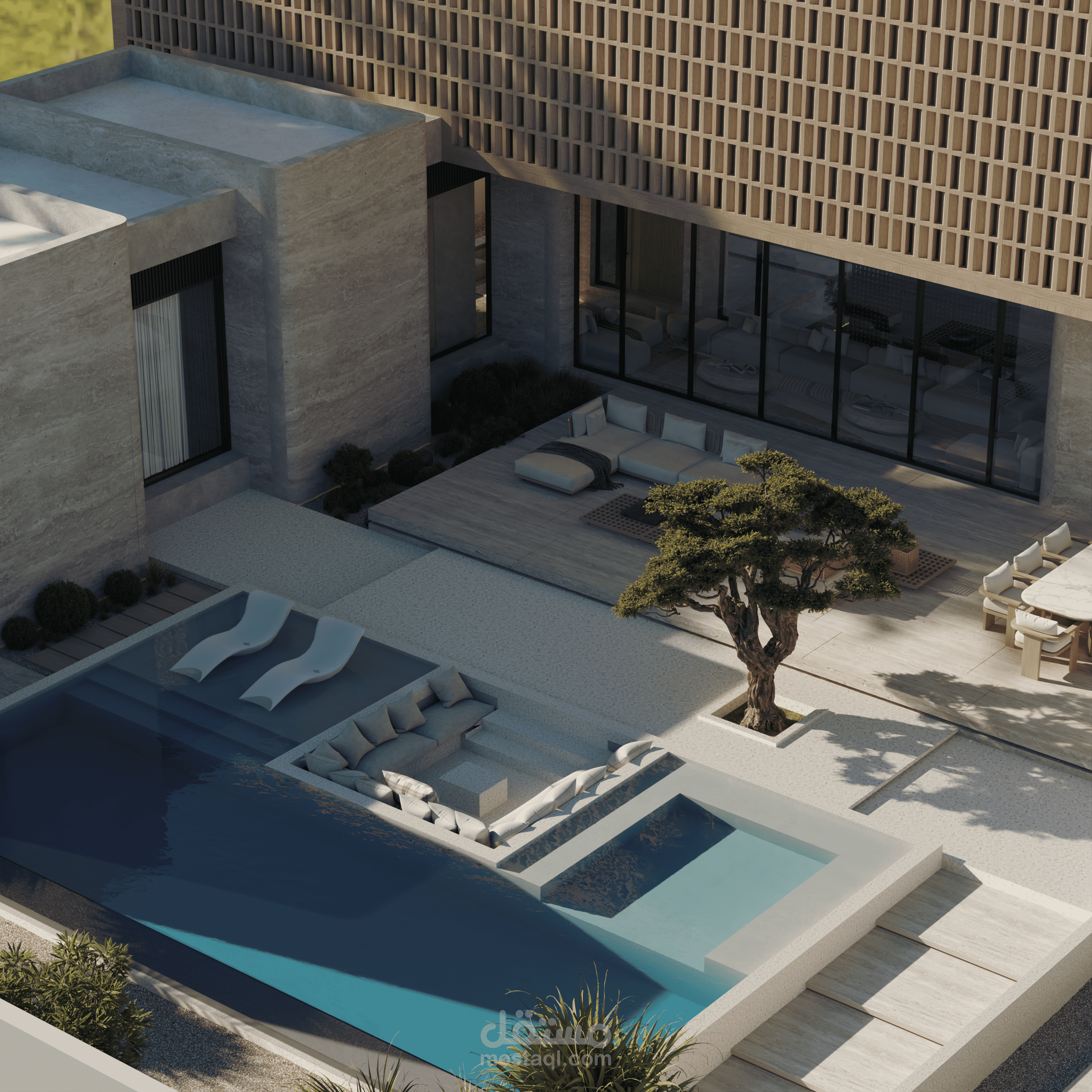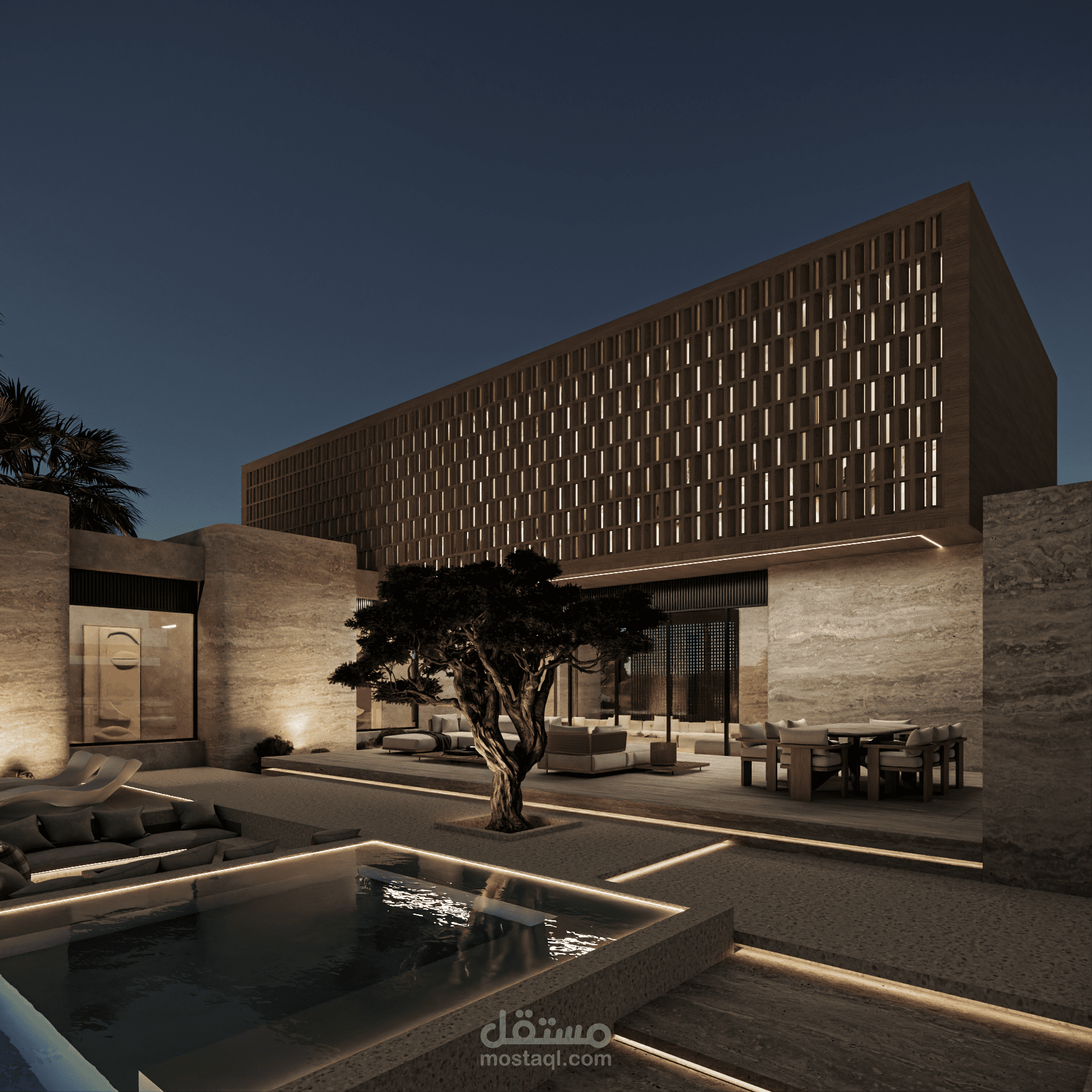 الكونسيبت يرتكز على الهدوء والانعزال الداخلي عبر فناء داخلي (Courtyard) يربط الفراغات بالضوء والطبيعة والماء.