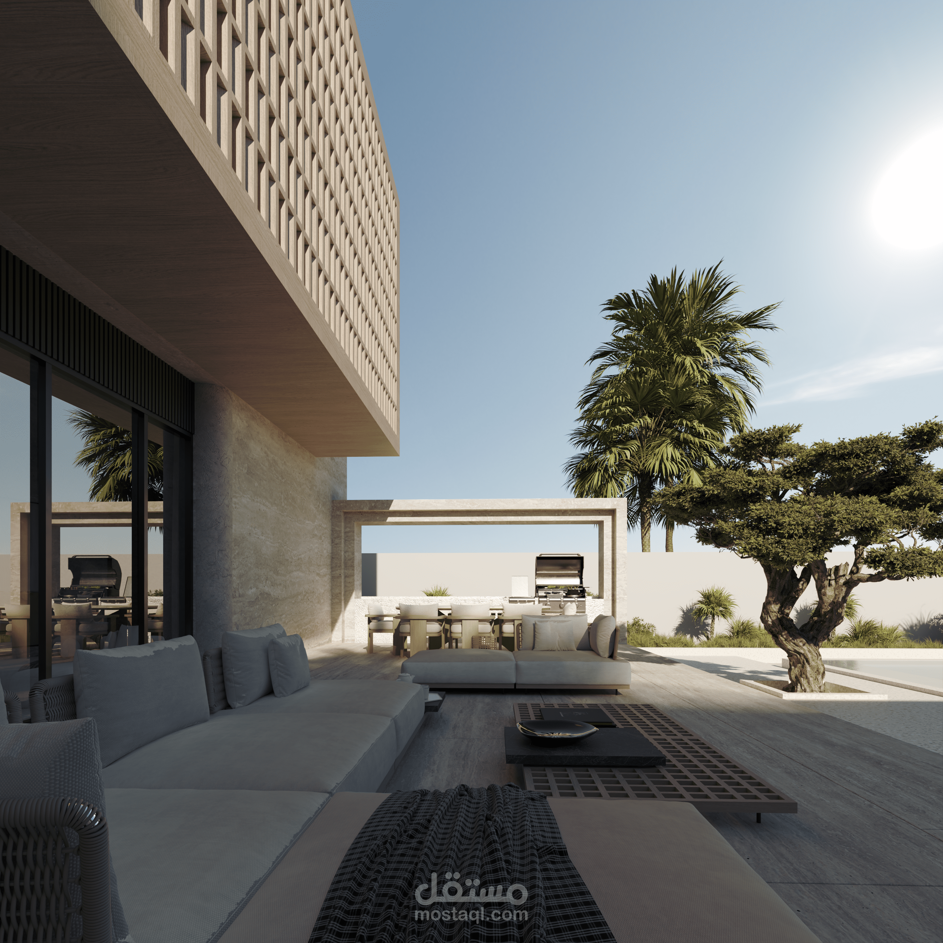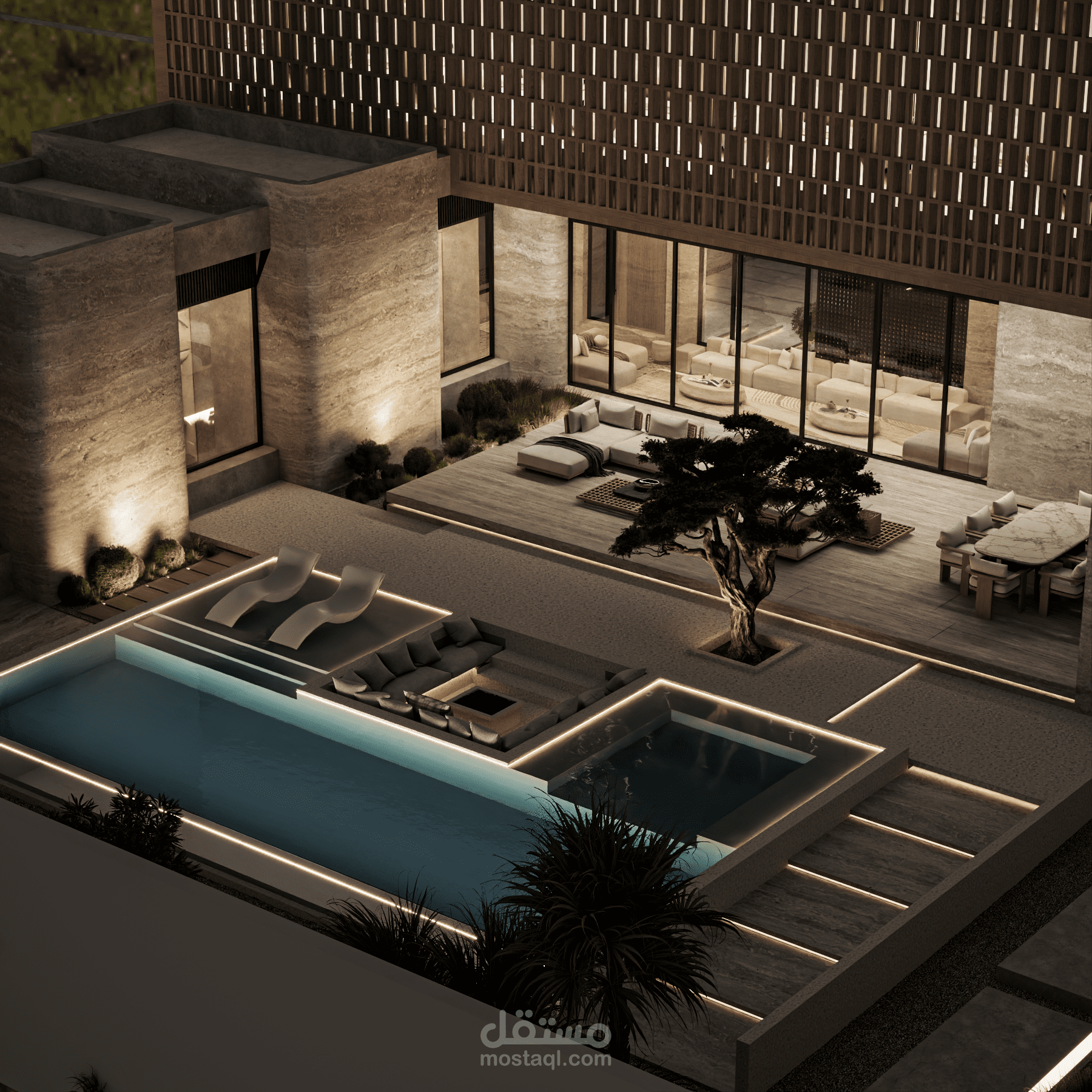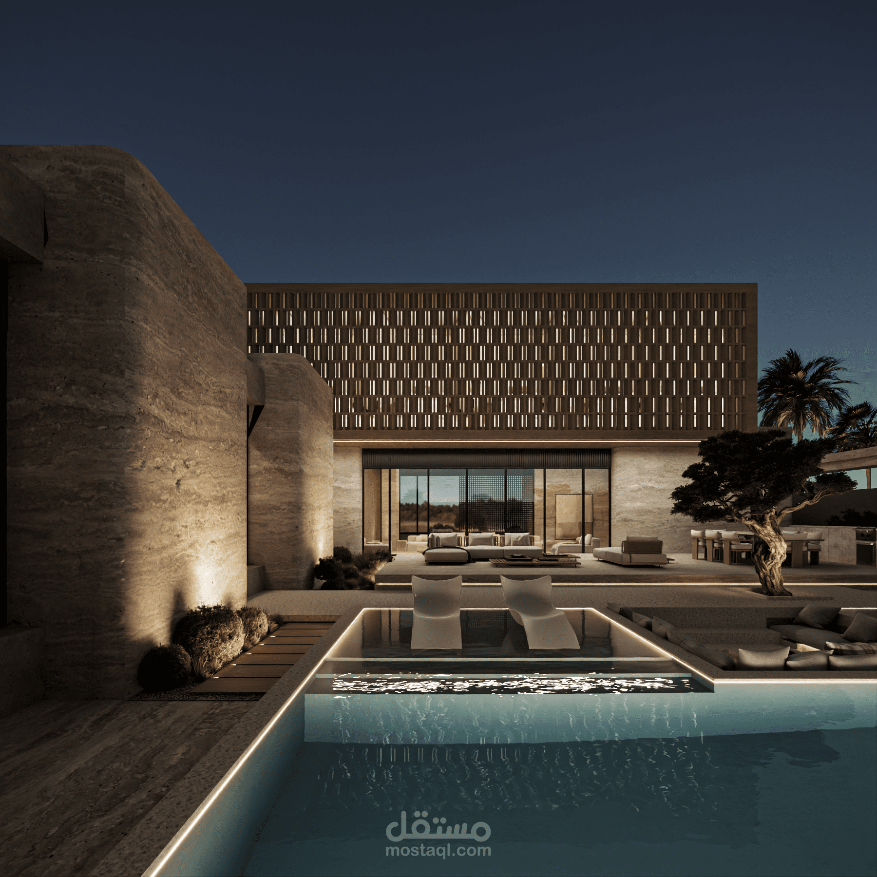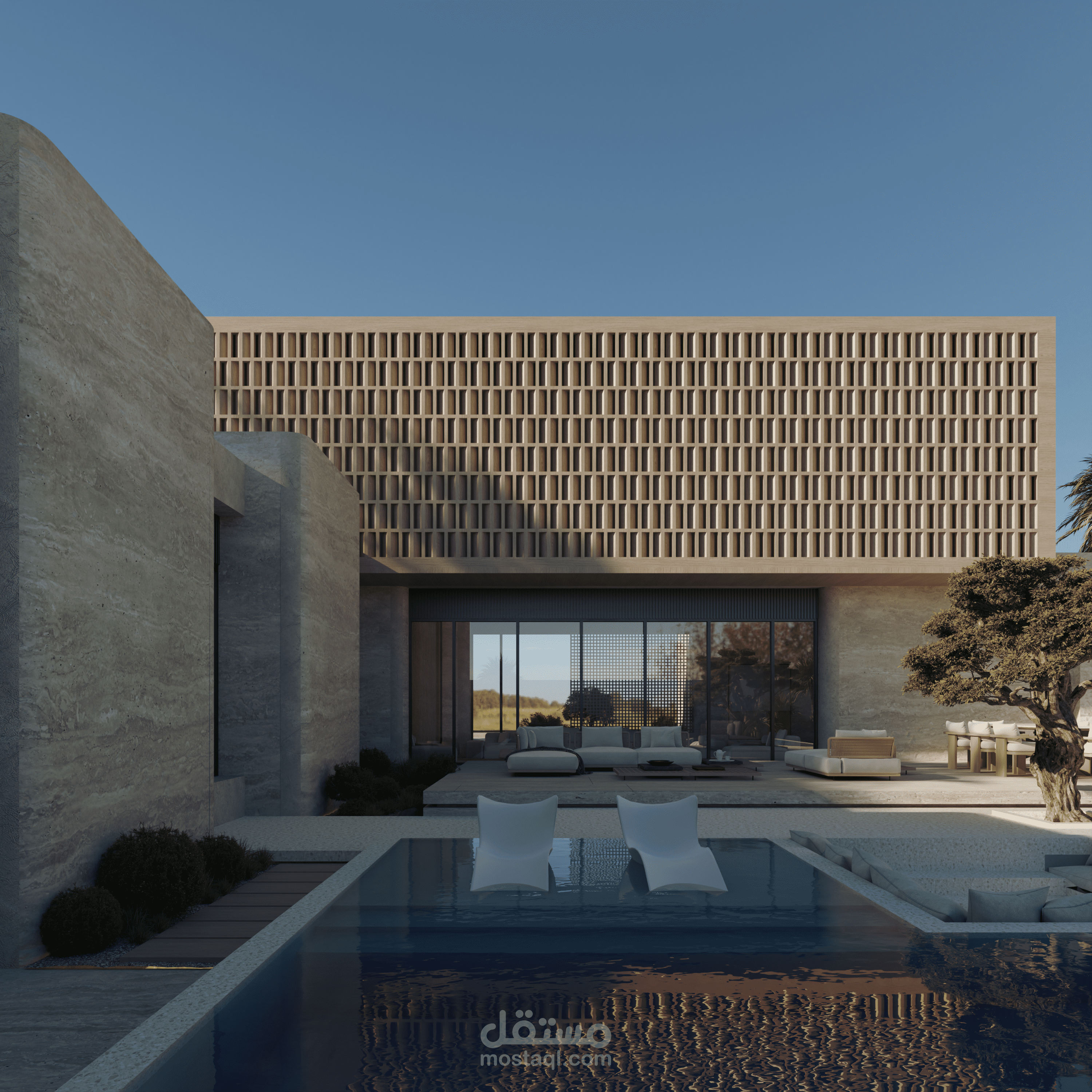 الكونسيبت يرتكز على الهدوء والانعزال الداخلي عبر فناء داخلي (Courtyard) يربط الفراغات بالضوء والطبيعة والماء.