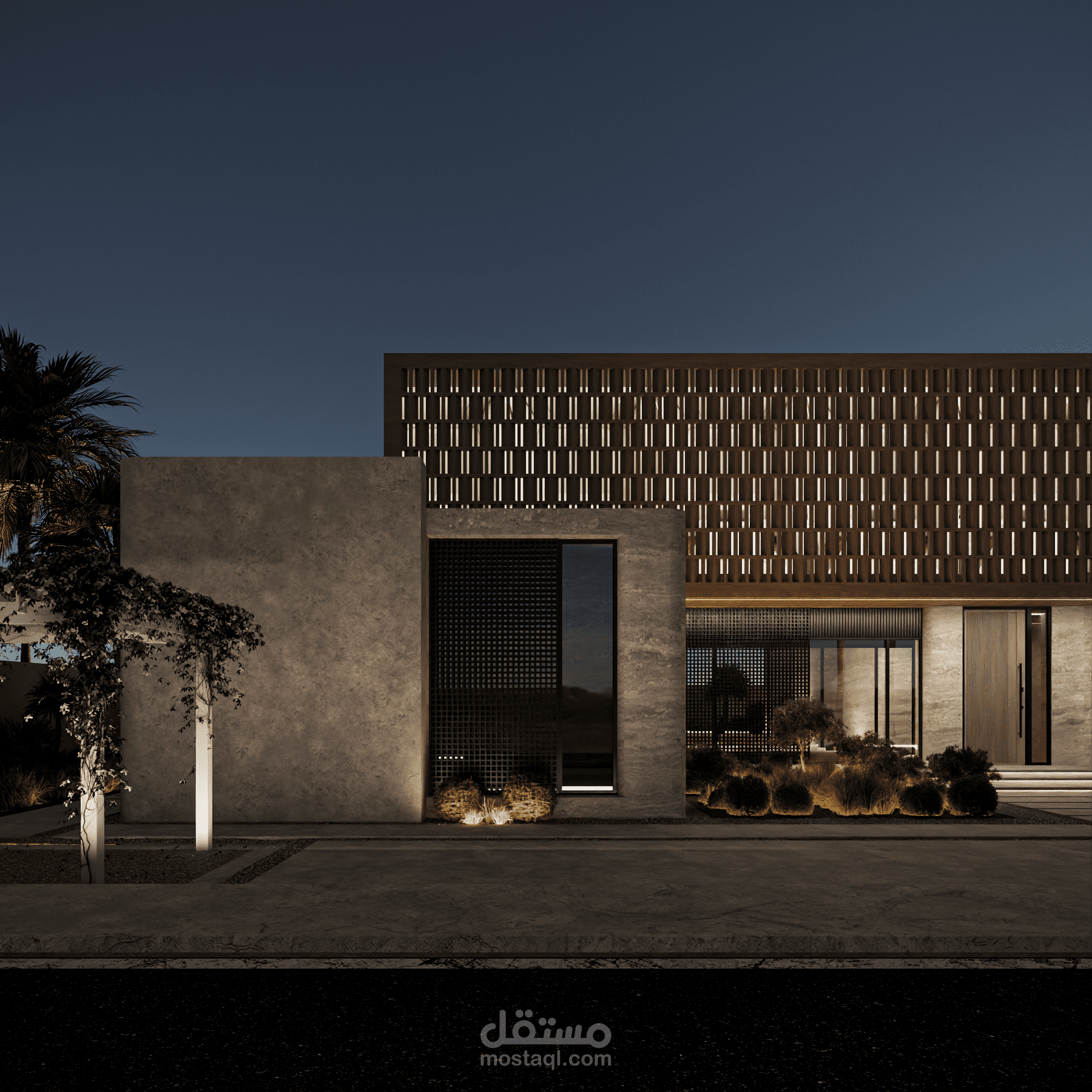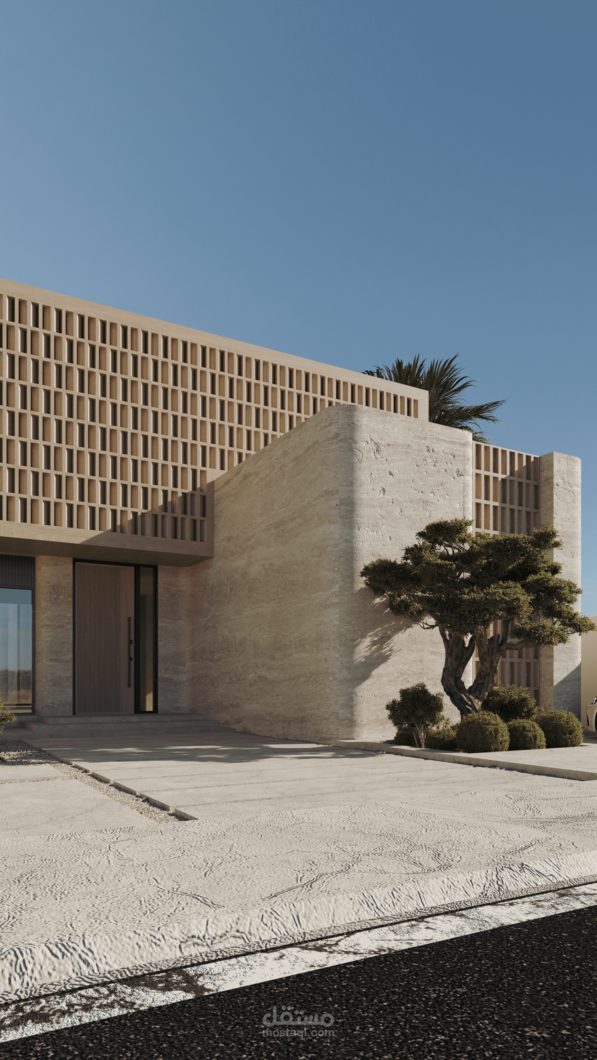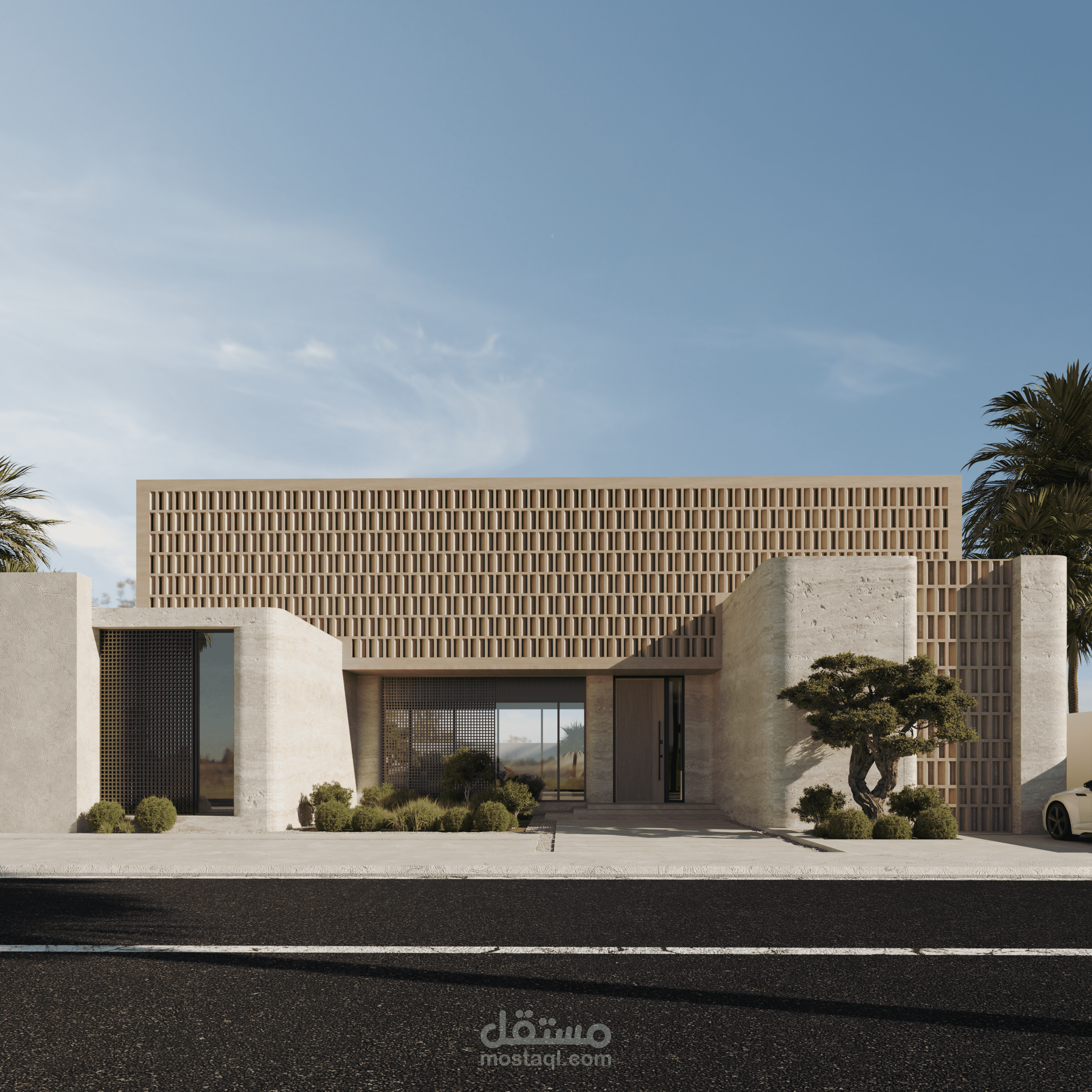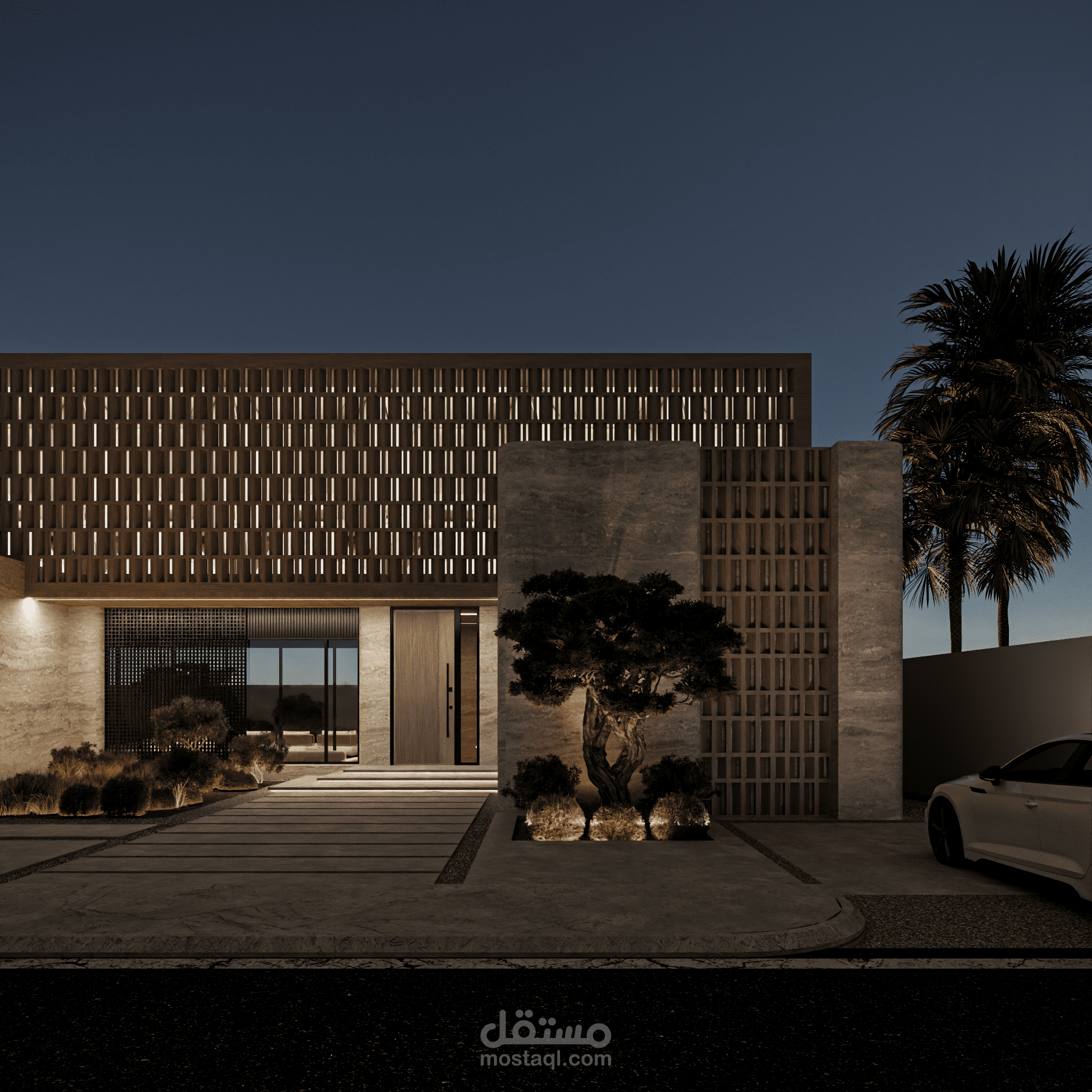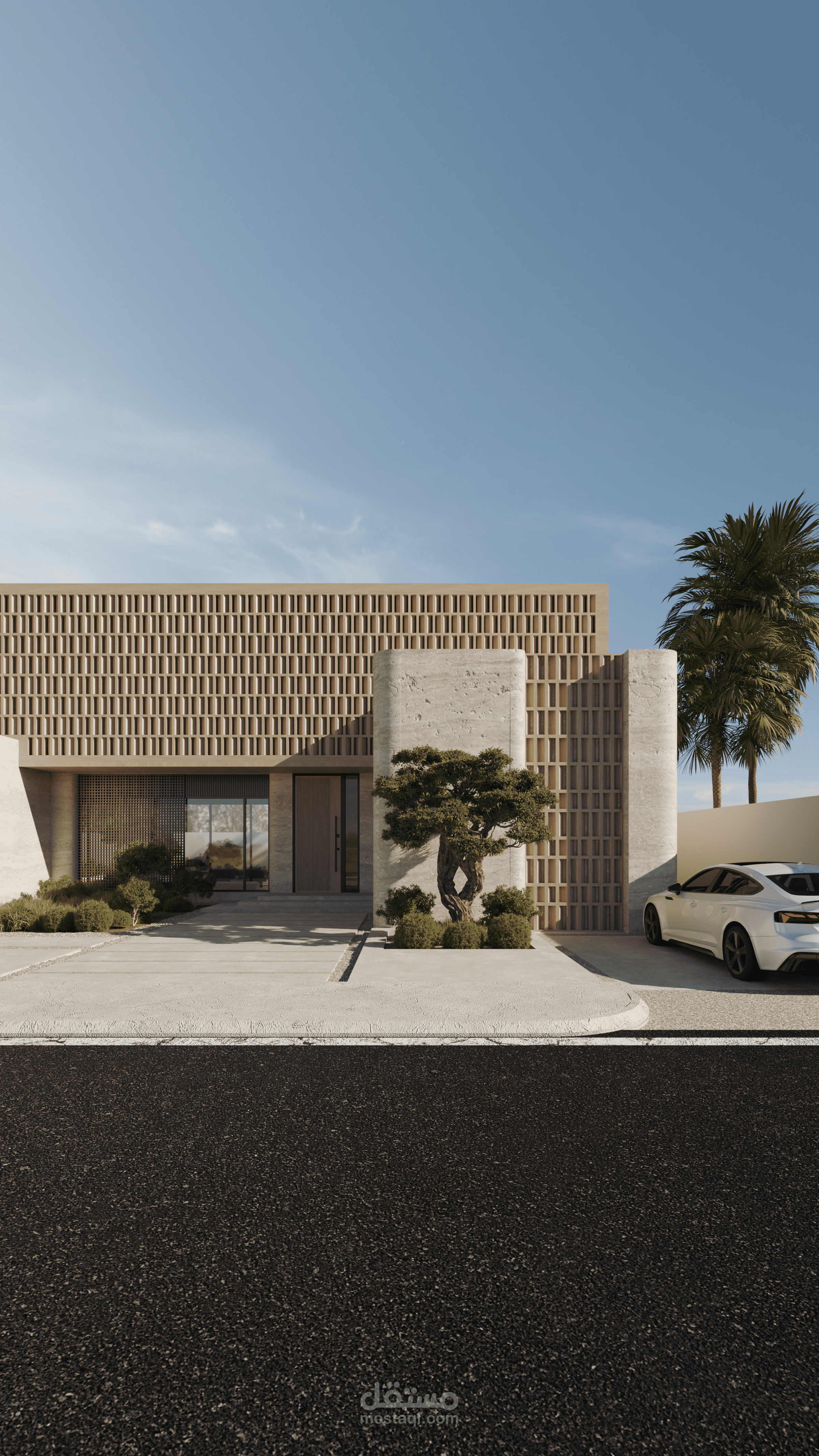 تعتمد الفيلا على تكوين كتلي بسيط وواضح بخطوط أفقية قوية وواجهات شبه مصمتة تعزز الخصوصية.