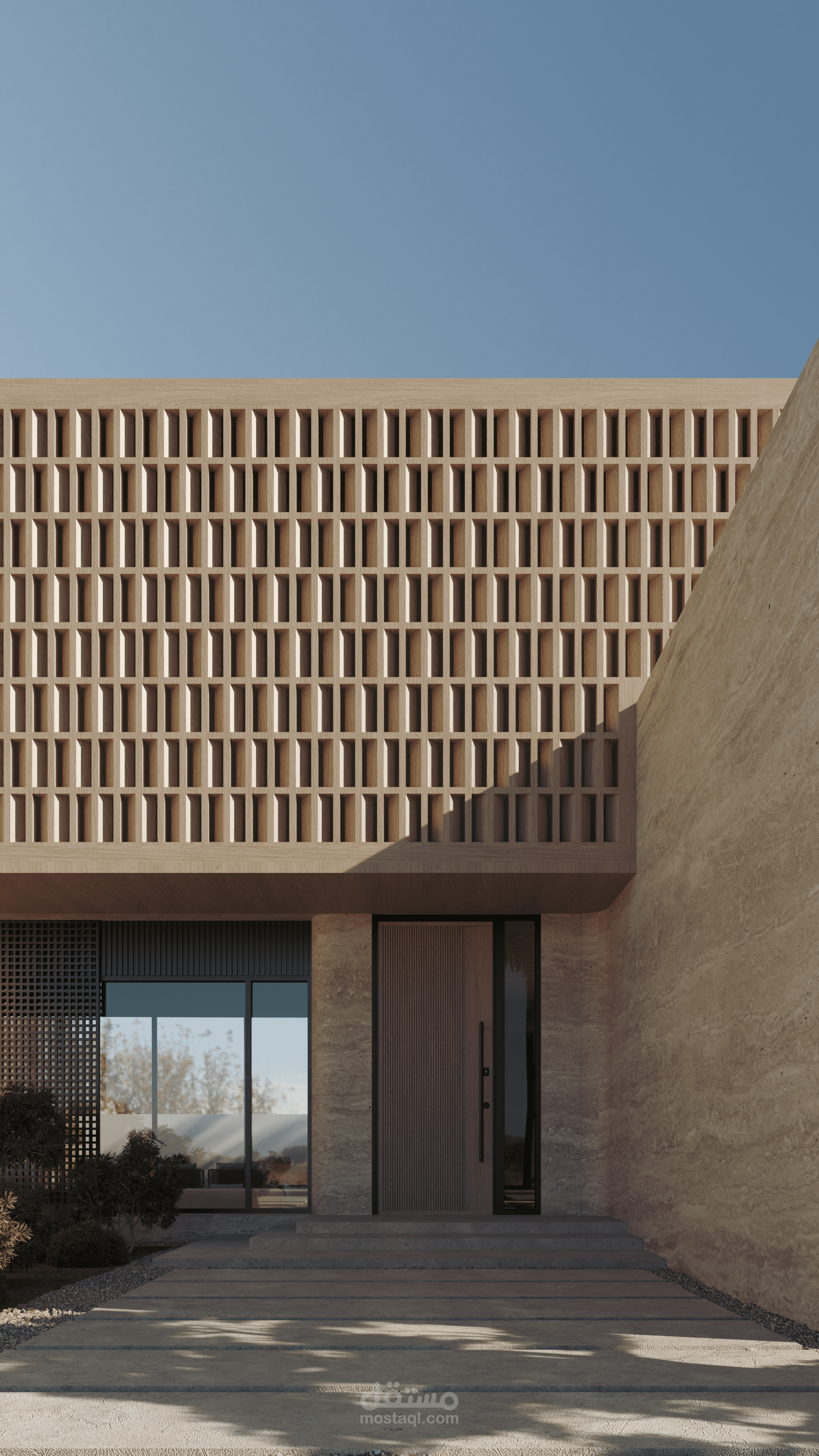 الخامات تشمل الحجر الطبيعي، الشاشات المشربية الخرسانية أو الطينية، الزجاج الكبير، والأرضيات الطبيعية، ما يخلق طابعًا معاصرًا دافئًا ومتوازنًا.