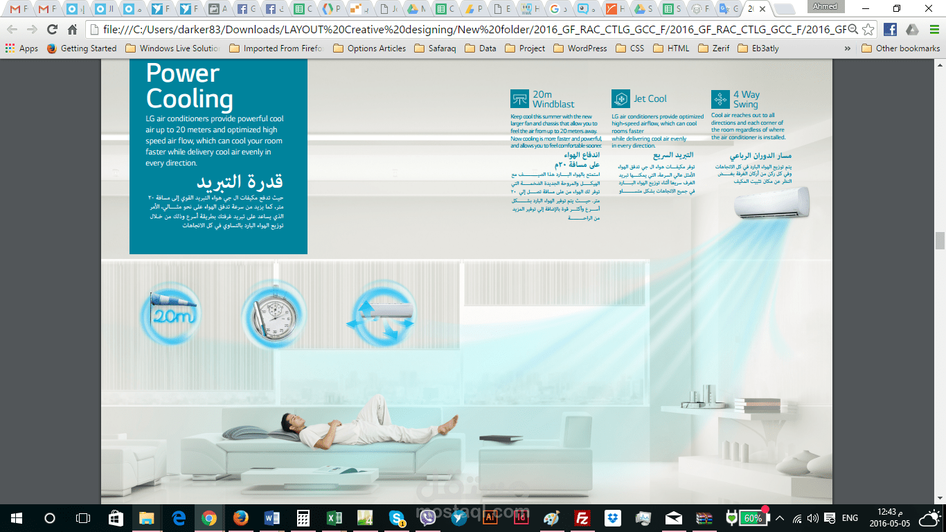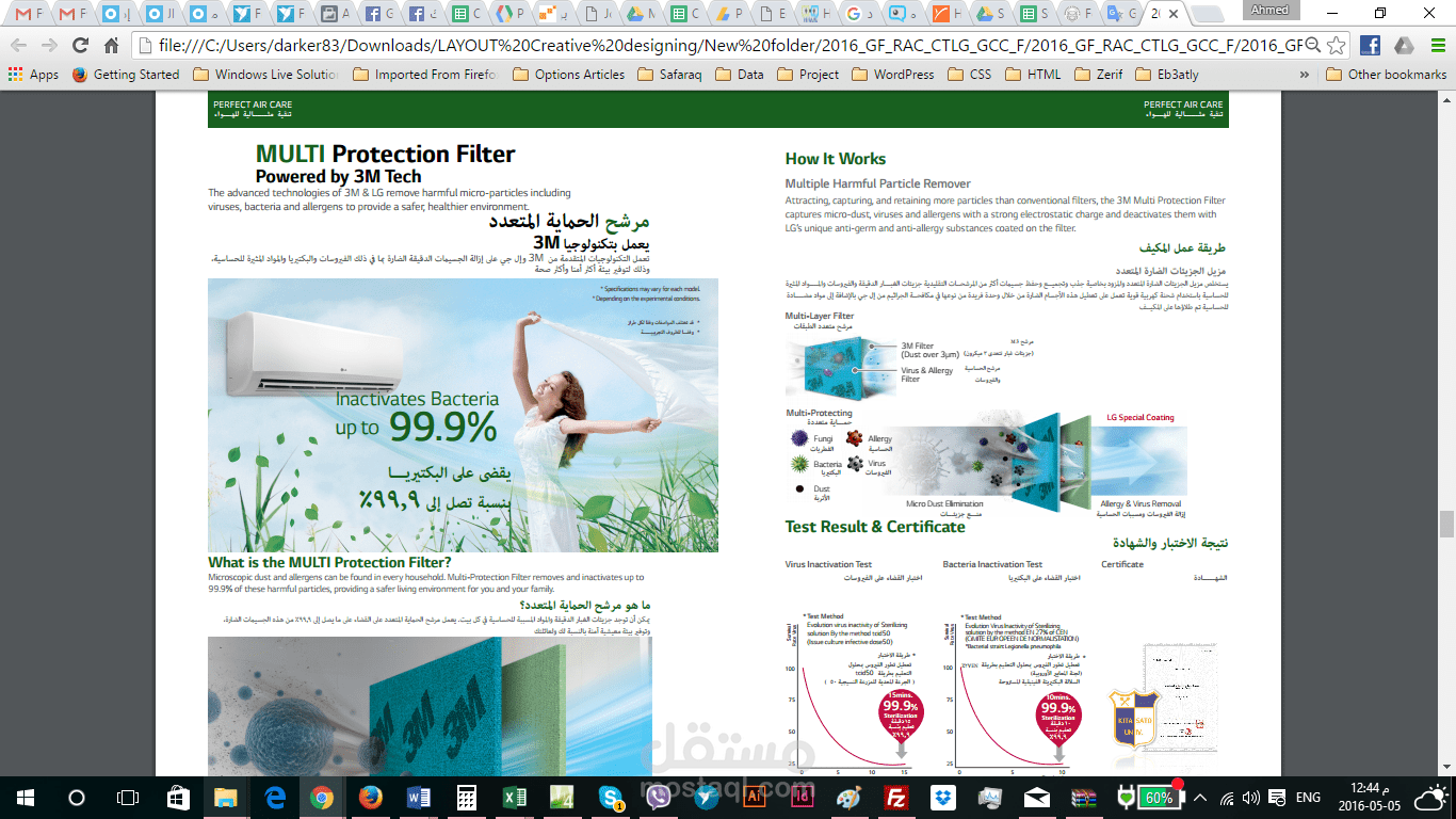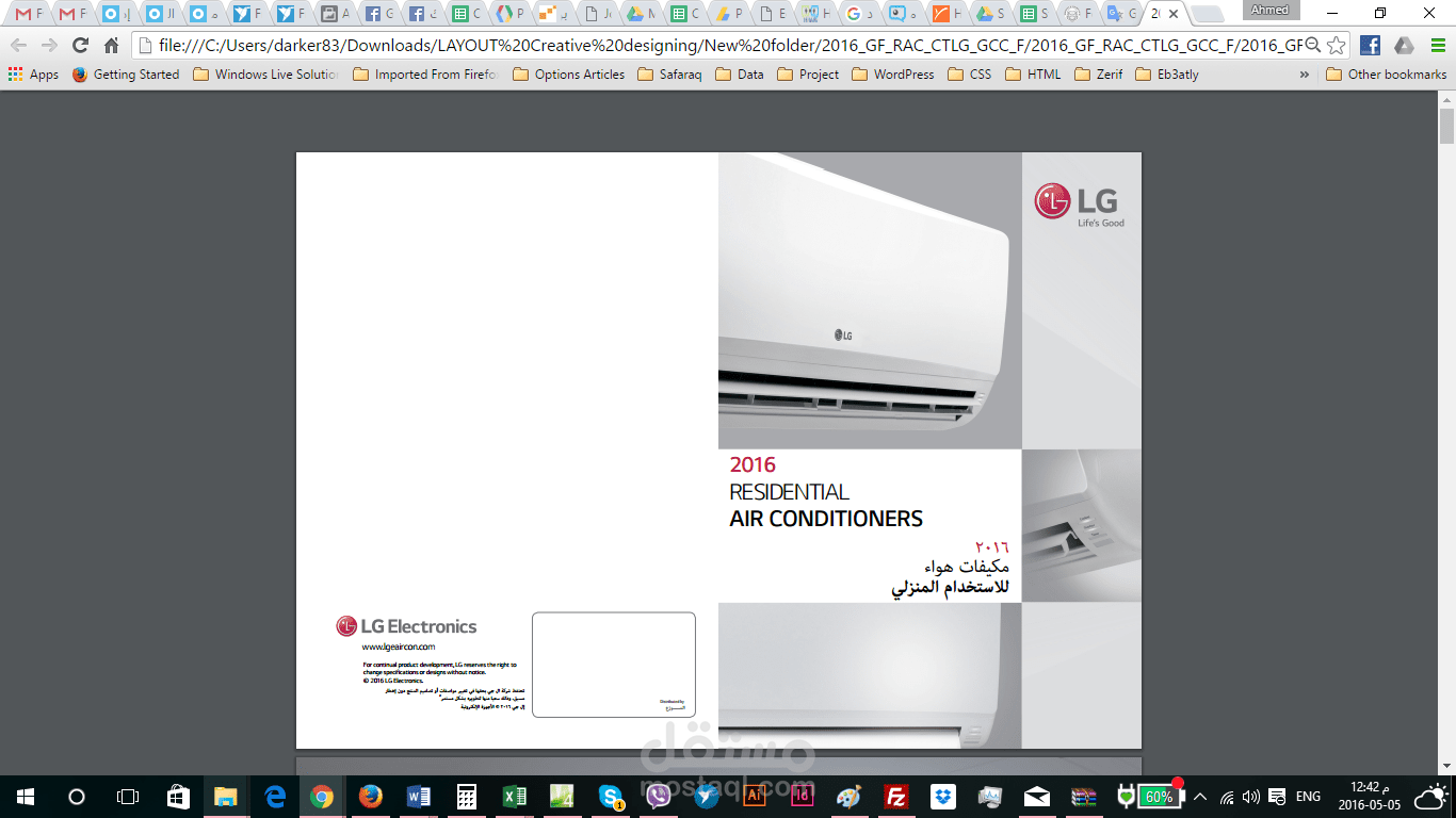 تصميم كتالوجين و عدد 2 بروشور لشركة LG ثنائي اللغة (الكاتالوج يحتوي على اللغة العربية والإنجليزية في نفس التصميم) أجمالي عدد الصفحات كان 109 صفحة، هذا العمل يعد من الأعمال الضخمة في التصميم وقد تم إنجازه مع فريق العمل الخاص بي في حوالي 10 أيام، تم إتمام التصميم باستخدام 3 برامج (Adobe InDesign, Illustrator, Photoshop) العمل على إليستراتور و الفتوشوب كان لإجراء التصميمات والعمل على إن ديزاين لإخراج الملف النهائي بتنسيق إحترافي.