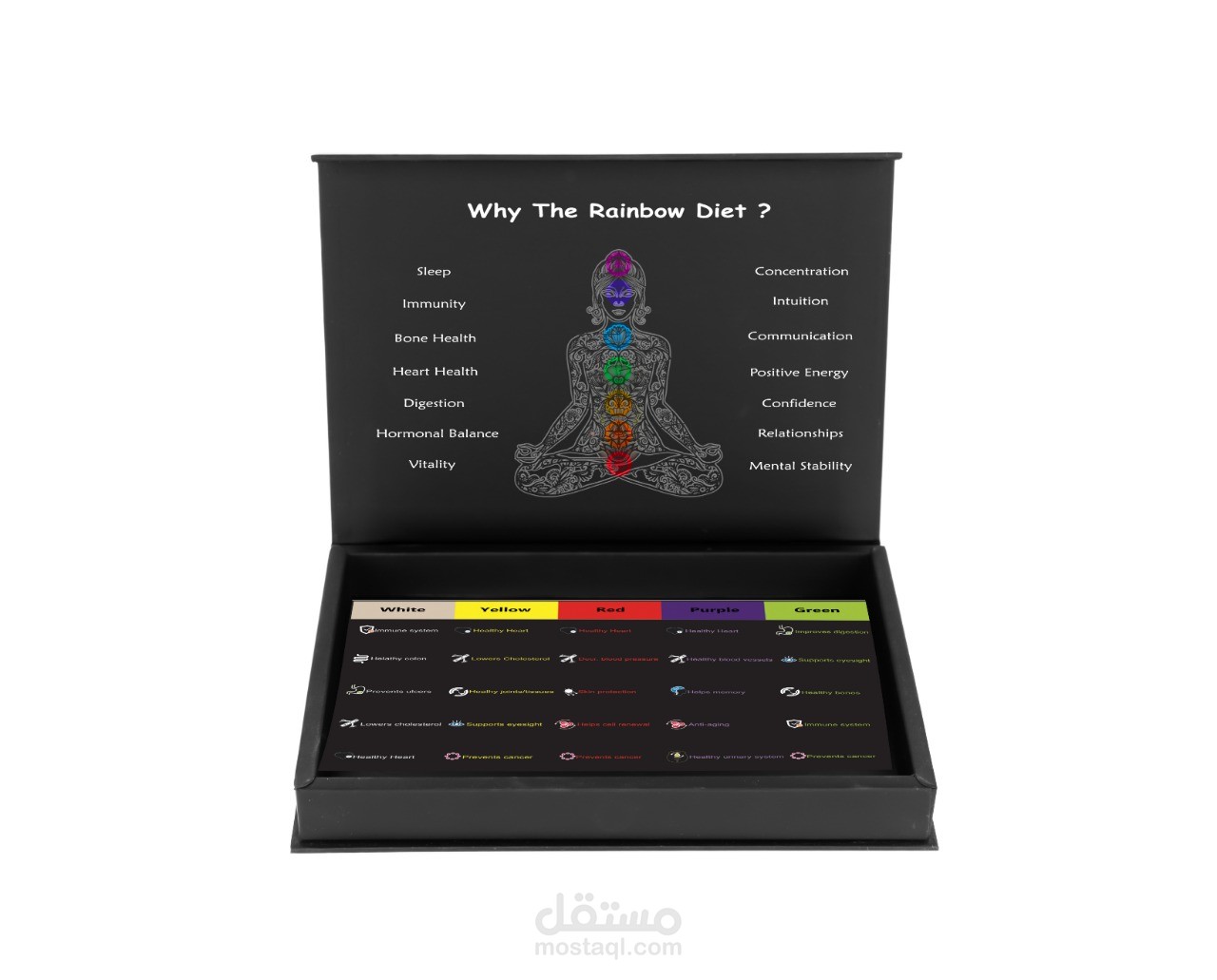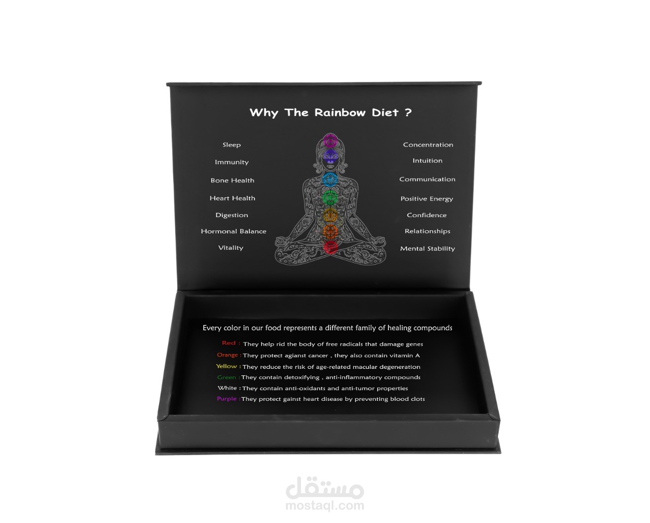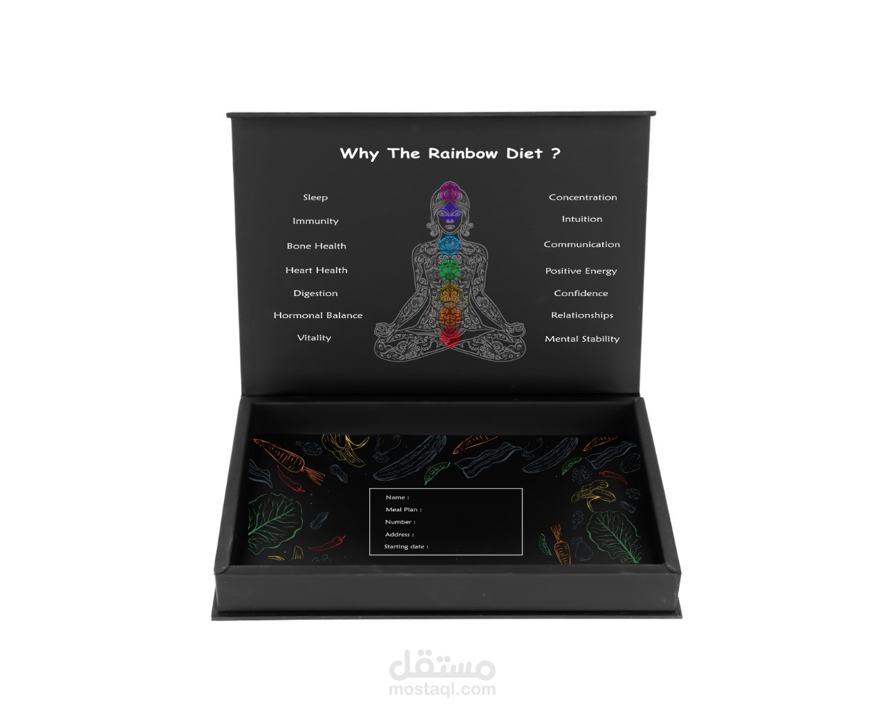 The Client wanted a Meal Box with a design based on a special concept called The Rainbow Diet as well as the Benefits and effects of colour therapy on your body and soul.