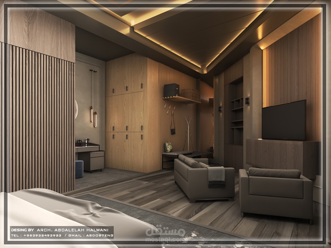 تحتوي الغرفة على ركن جلوس مع شاشة بانورامية بالاضافة الى خزانة ملابس و تسريحة