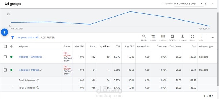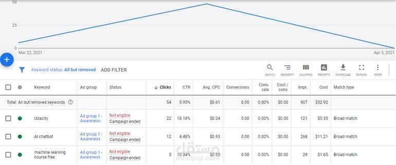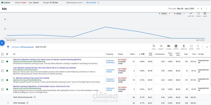 We used Google Ads to create a marketing campaign called “MohamedFawaz-FWD-HodaOsman” for getting traffic to the link of a free course called “Introduction to Machine Learning” offered by Udacity.