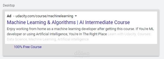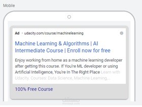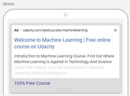 The campaign includes two Ad groups one for awareness called “Ad group 1 – Awareness” with 20 generic keywords related to machine learning, Udacity & AI; the second Ad group is for interest called “Ad group 2 – Interest” with more specific 20 keywords related to the exact course name and related topics that might interest the customer.