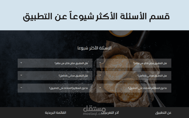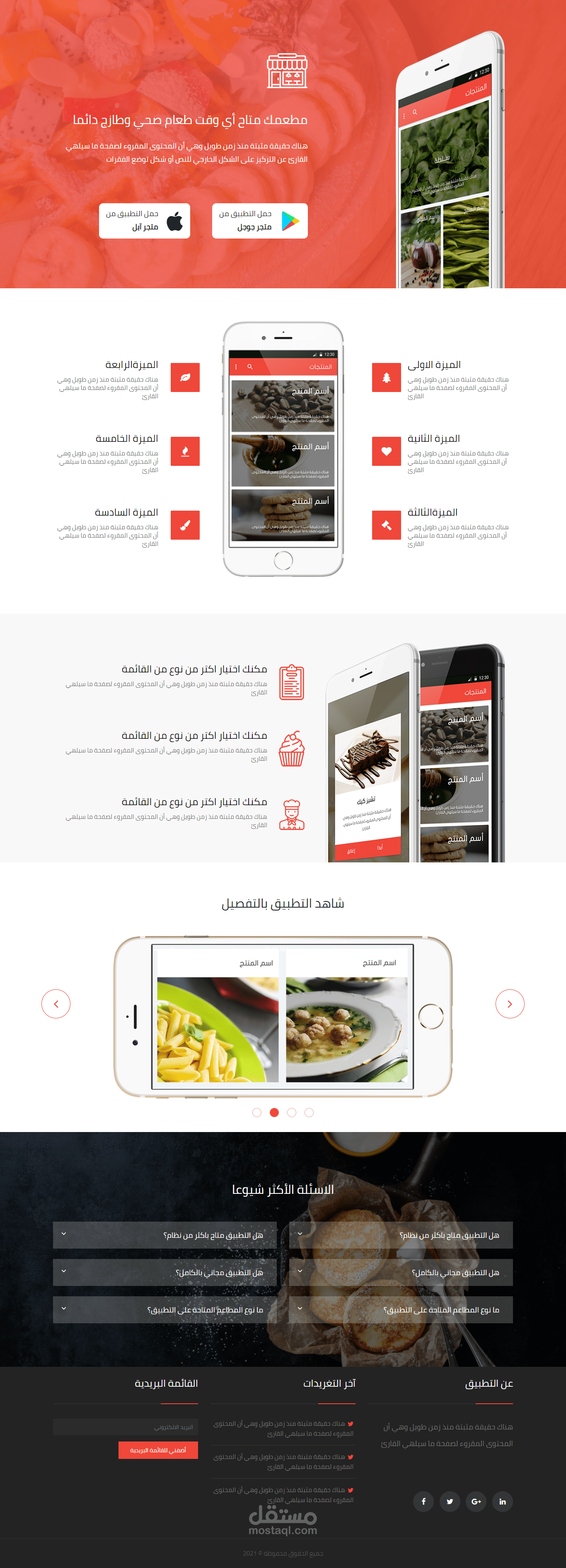 واجهة مستخدم لصفحة هبوط مع تأثيرات تفاعلية, تم تحويلها من PSD الى HTML و CSS, تحتوي على قسم مميزات التطبيق, قسم للأسئلة وقسم للتواصل عبر البريد الألكتروني