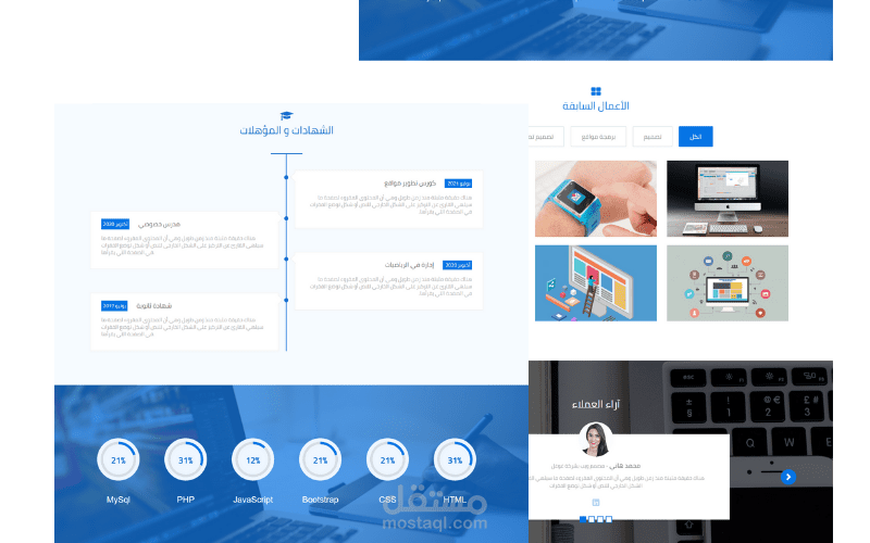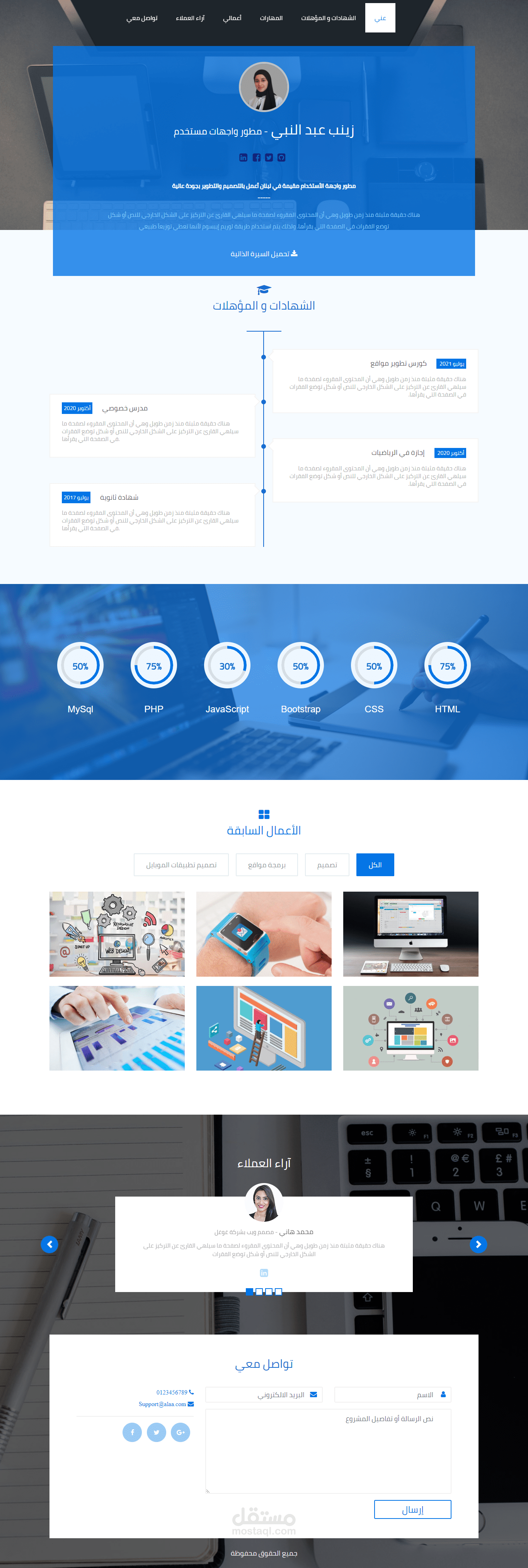 صفحة شخصية تحتوي على معرض أعمال و تسلسل زمني للسيرة الذاتية بالأضافة الى إمكانية تحميل السيرة الذاتية, وقسم آراء العملاء