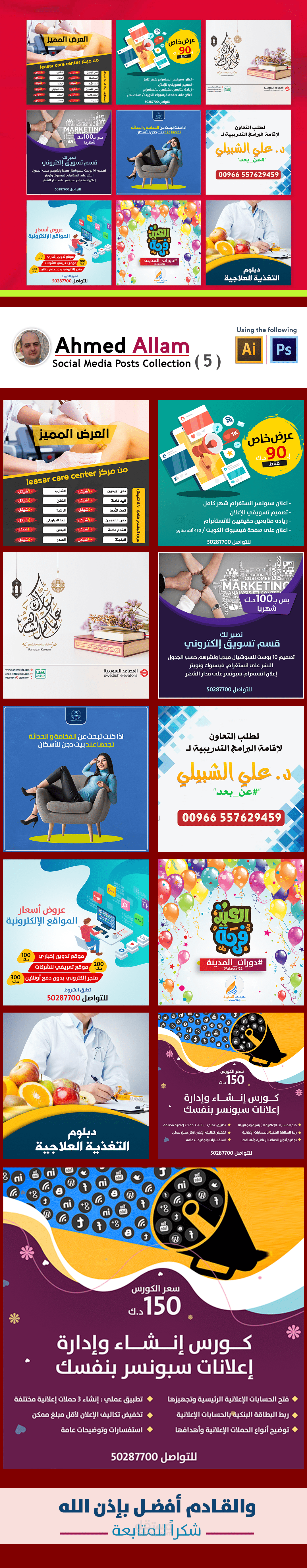 من الاعمال التي تشرفت بالعمل بها مع عملائي الكرام وأفخر بالعمل معهم وهذه الاعمال متنوعة في المجالات المختلفة وتستخدم لغرض التسويق الالكتروني والدعاية والاعلان. وقد تم بفضل الله نشر هذه التصاميم على حسابات السوشيال ميديا وحازت على رضا اصحاب الصفحات وحقق نتائج ممتازة ولله الحمد.