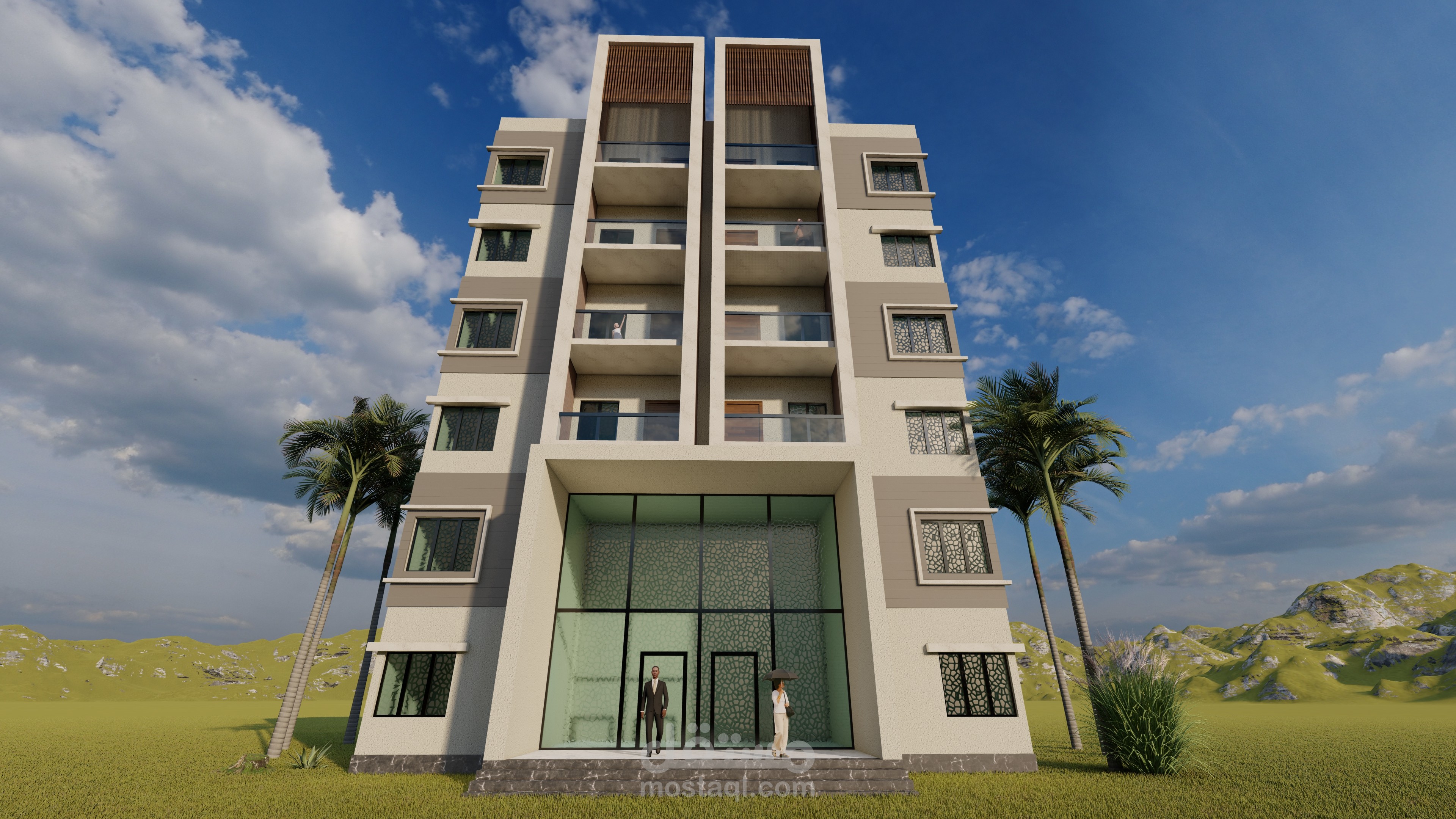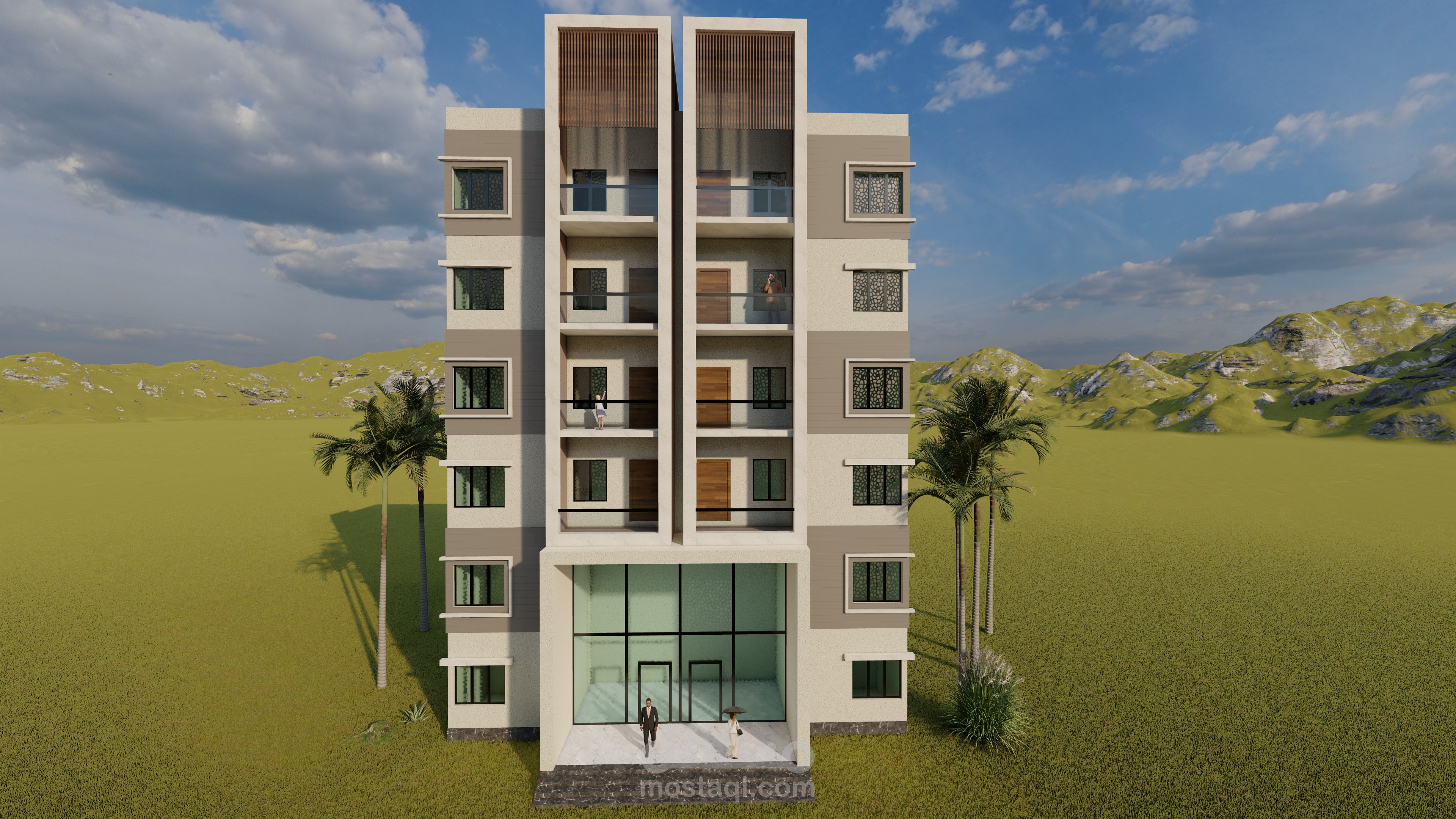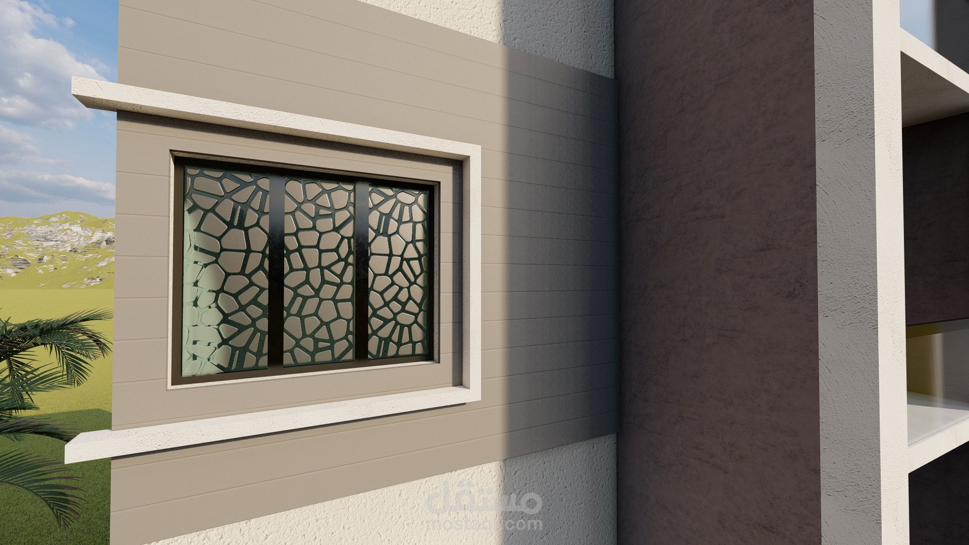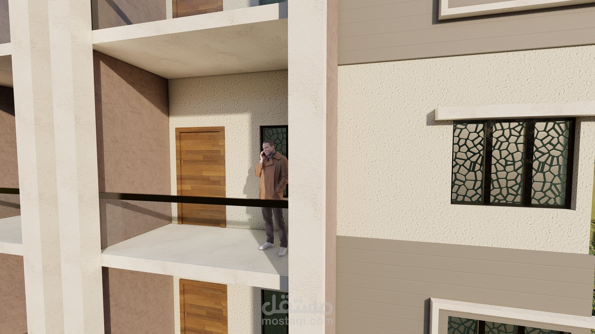 تصميم واجهة خارجية لعمارة سكنية باستخدام برنامج اوتوكاد 3D وتم وضع الخامات و الريندر باستخدام برنامج لميون