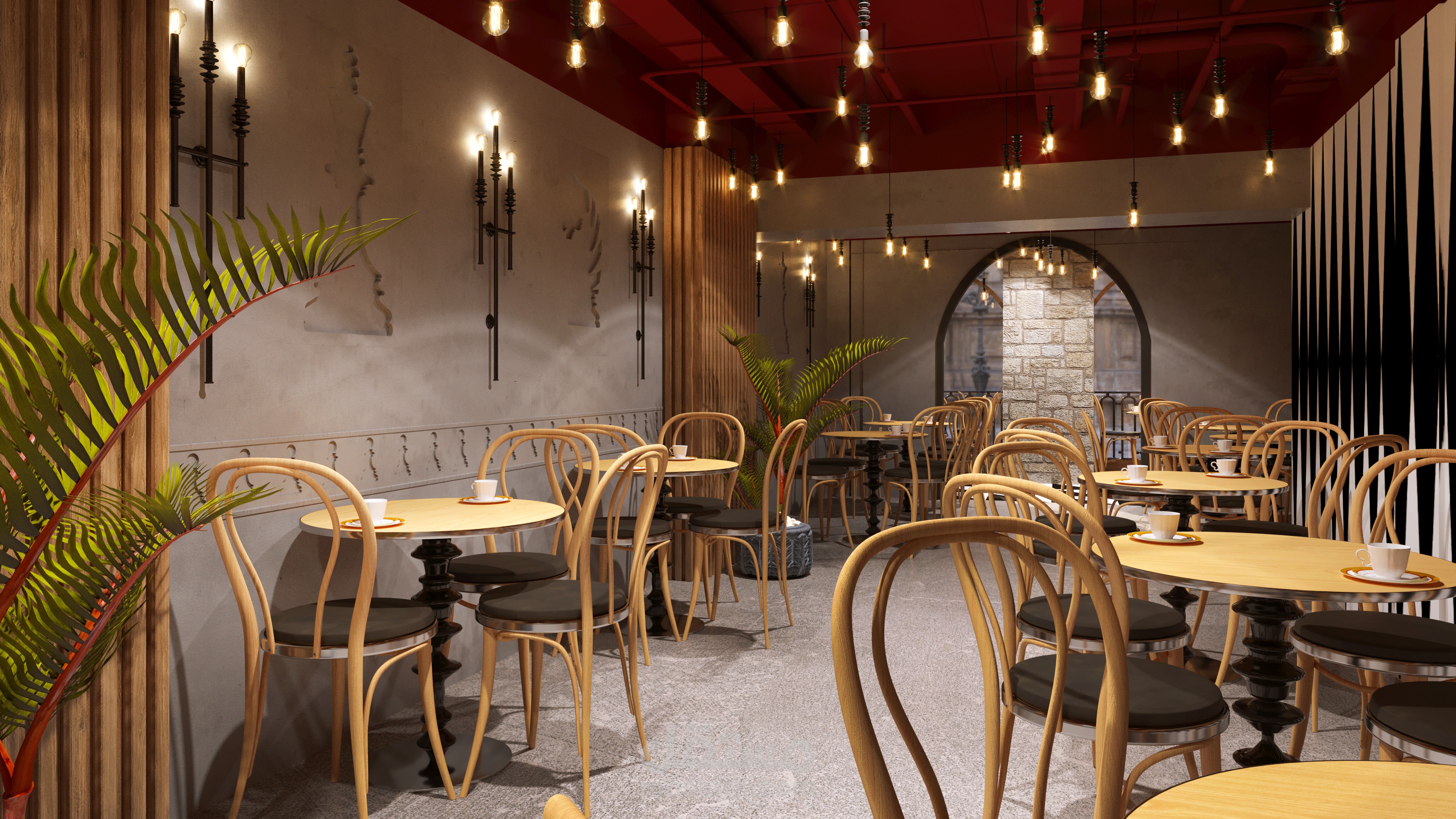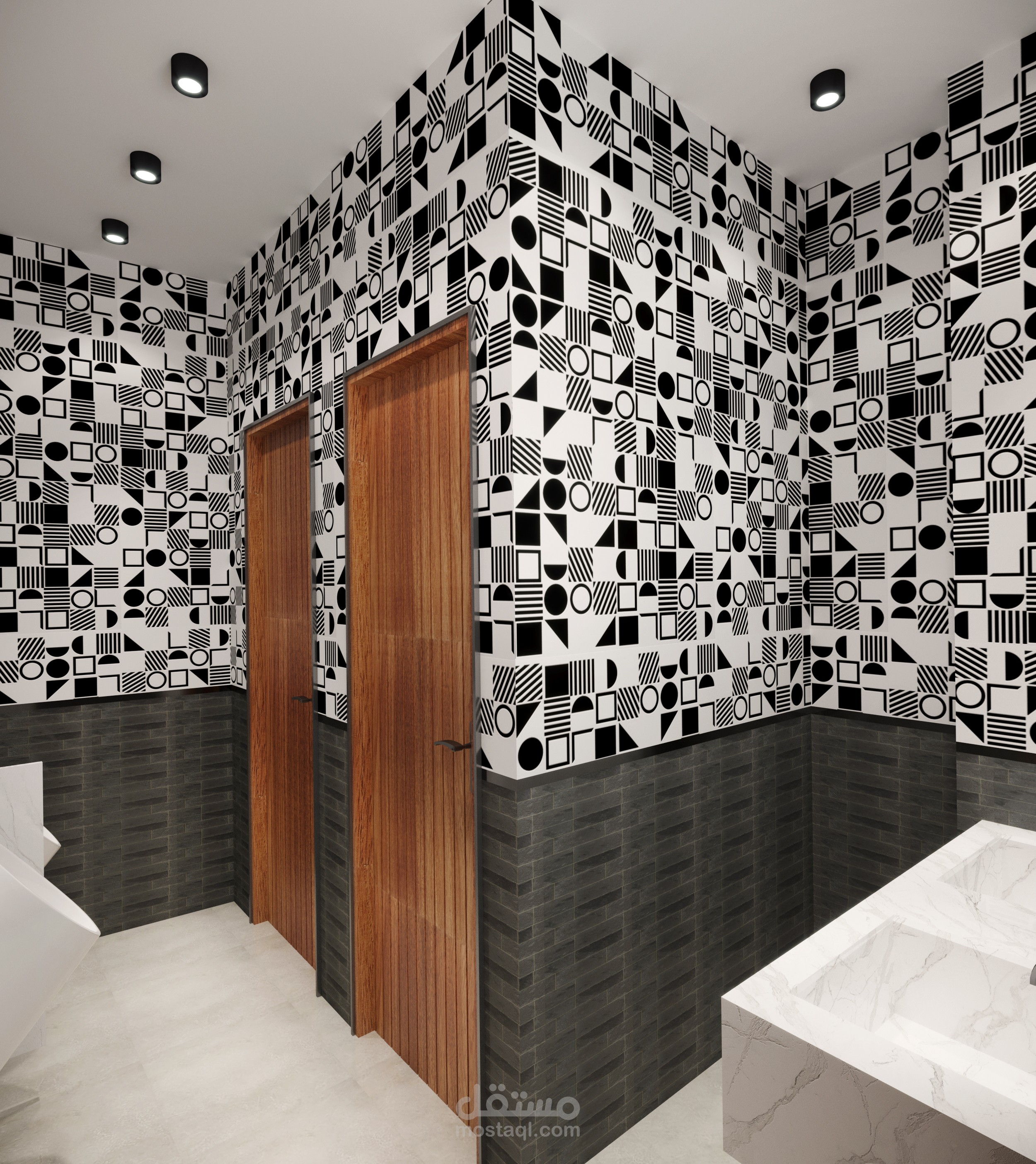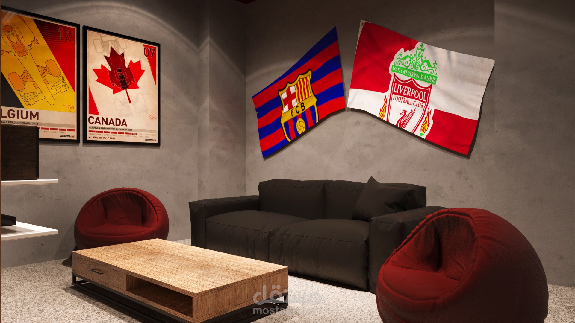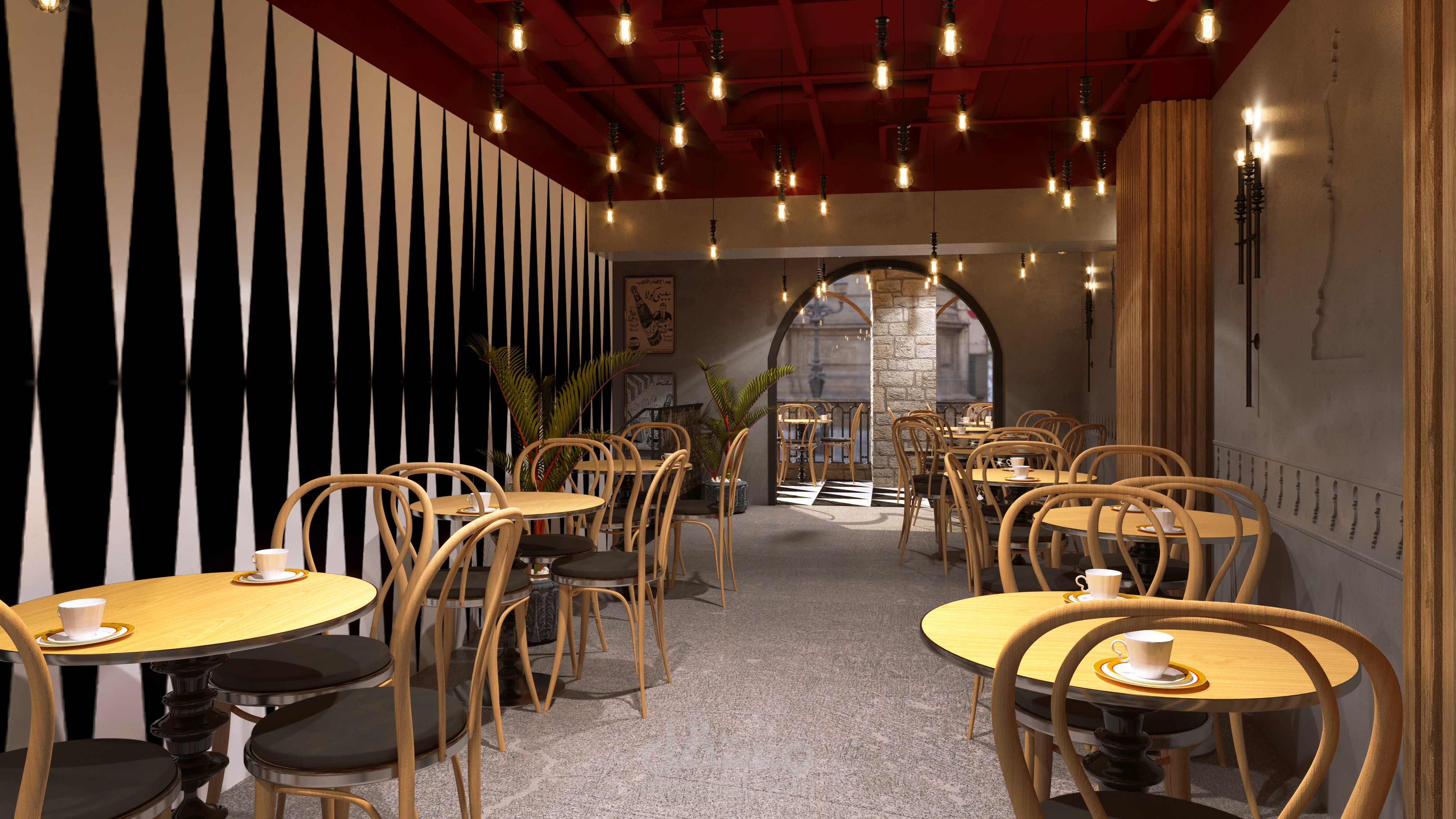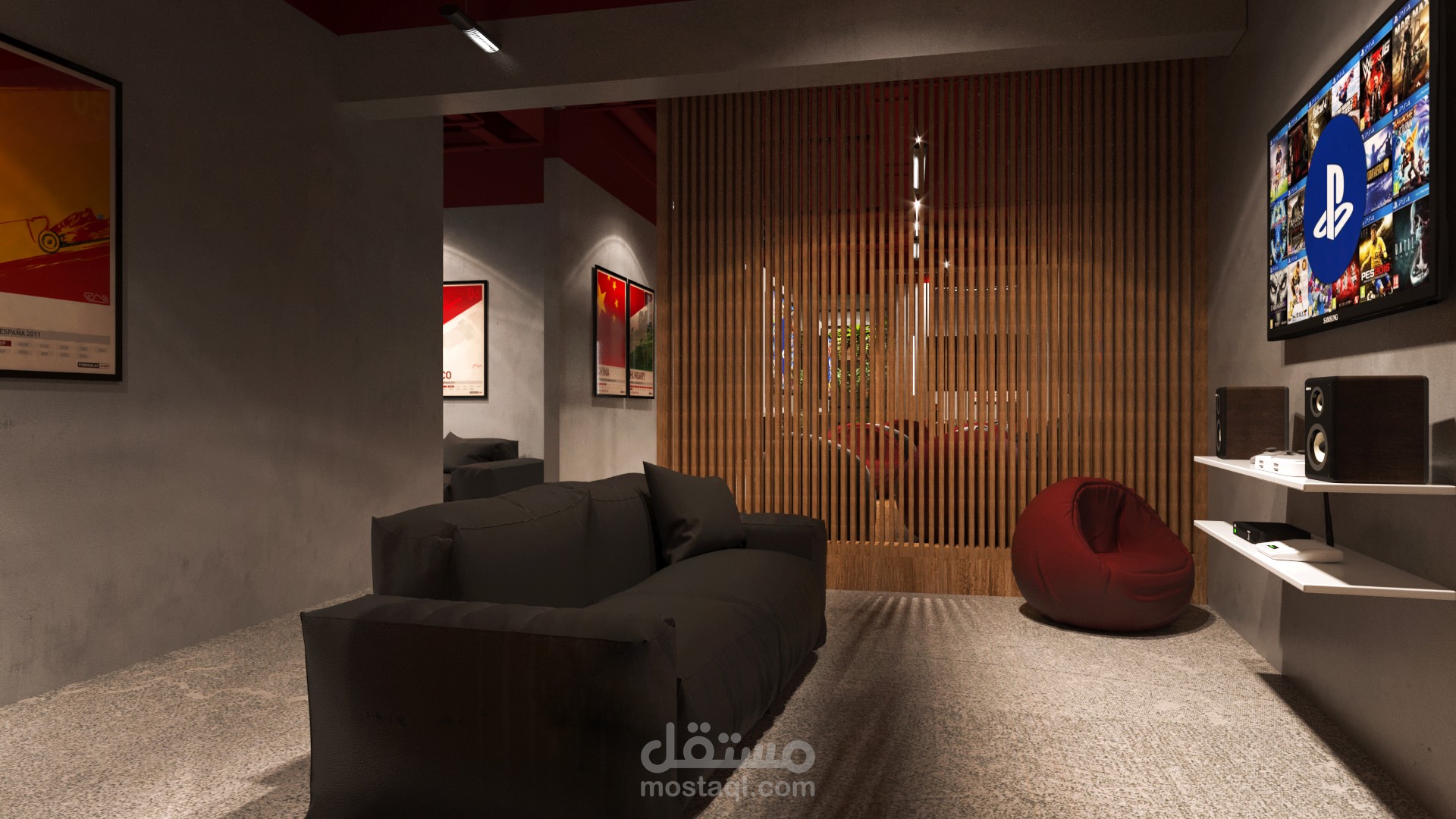 checkered pattern appears here in various shapes and matches with a red ceiling