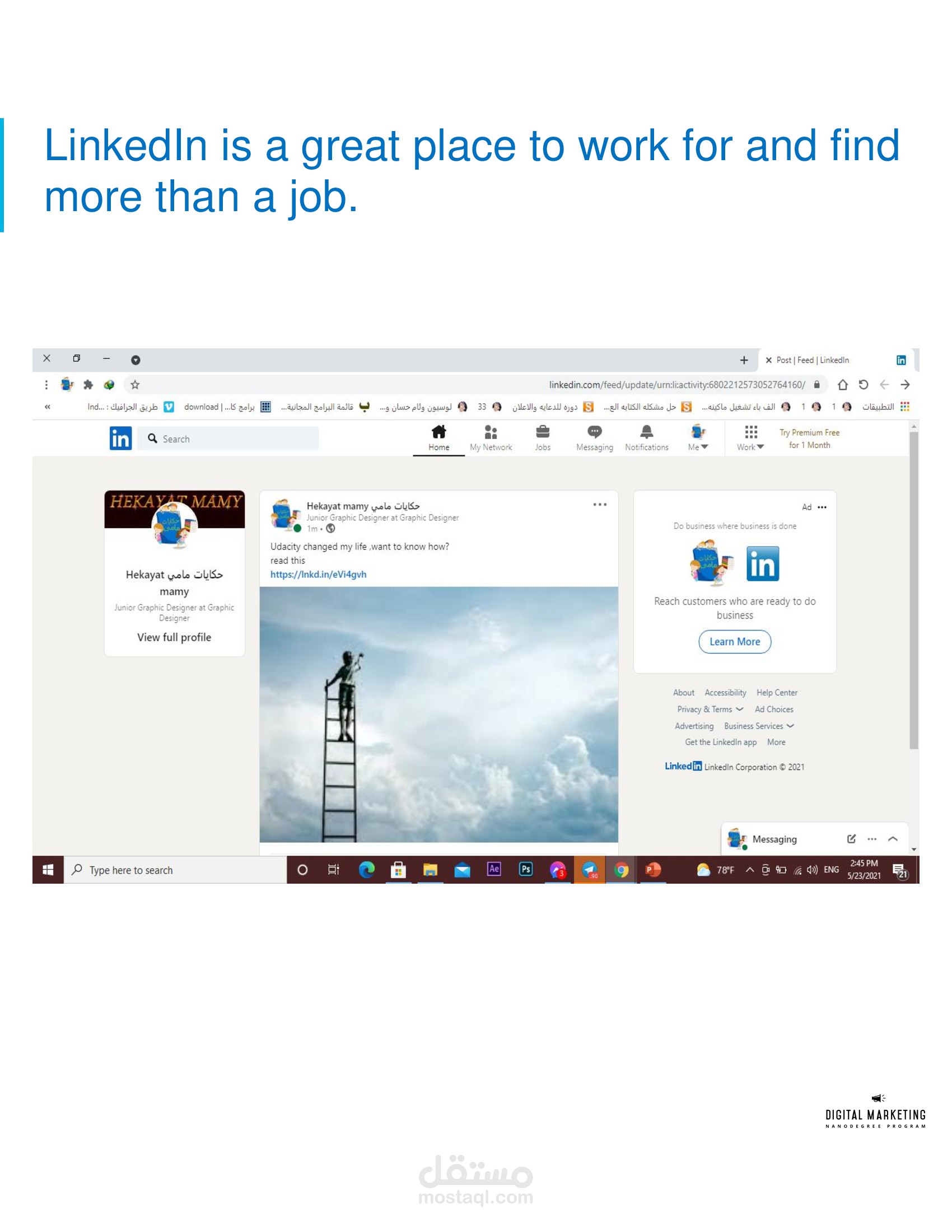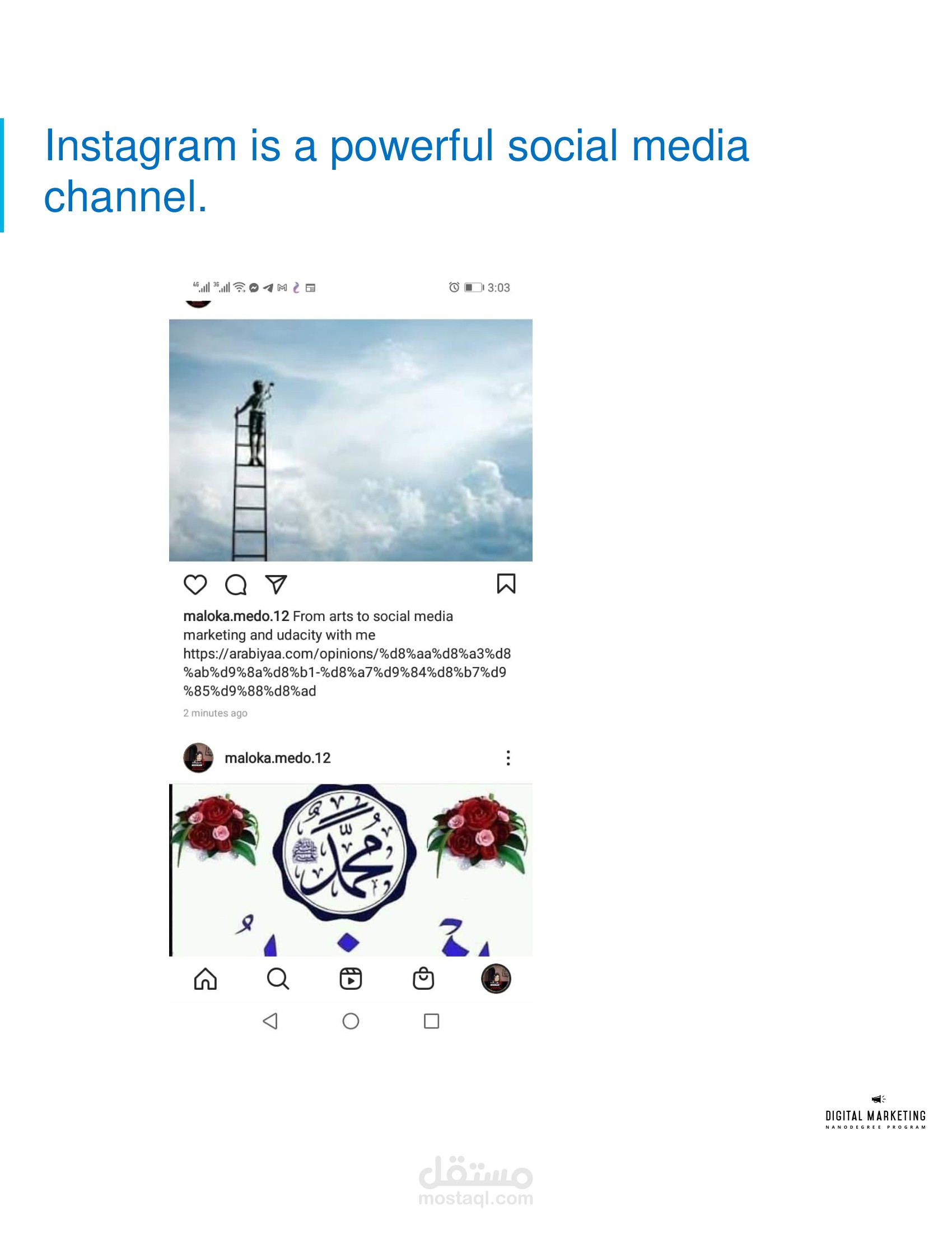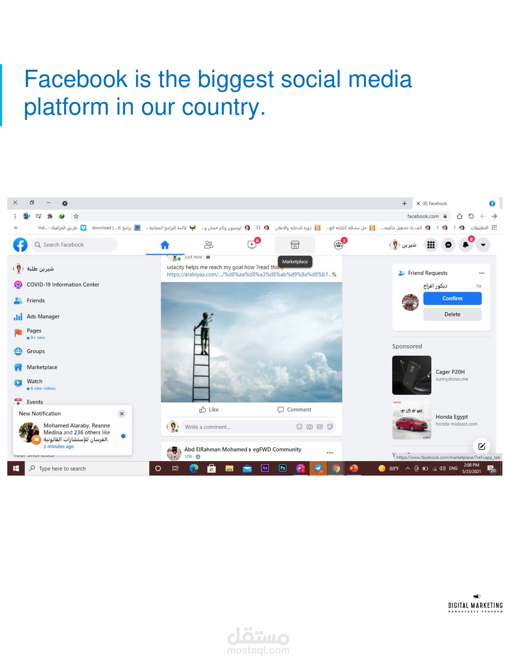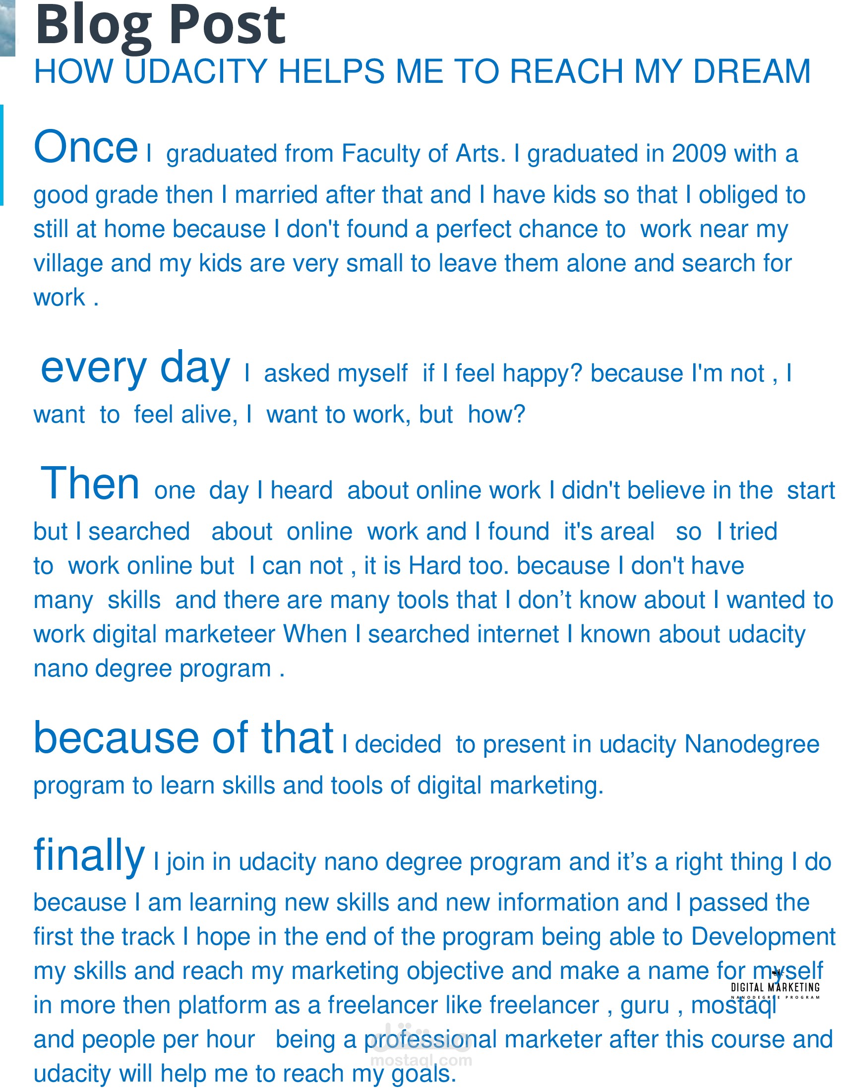 I am learning Digital Marketing from UDACITY and I am now able to manage various digital marketing campaigns & techniques , able to think like a freelancer and better attract new customers, as well I passed the challenger track in UDACITY