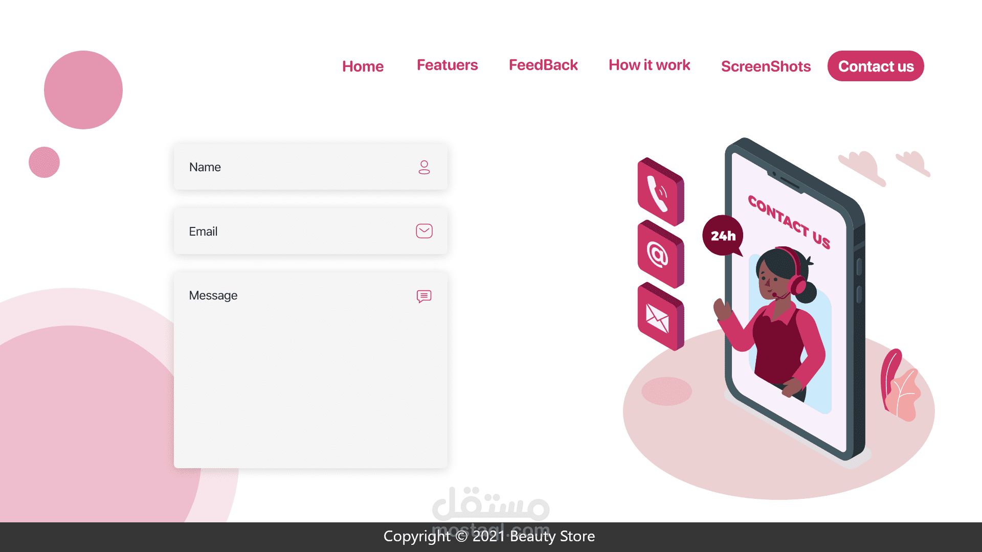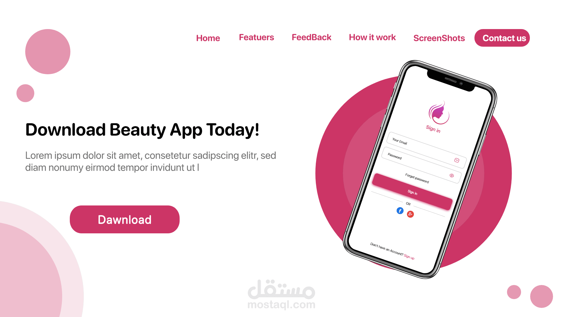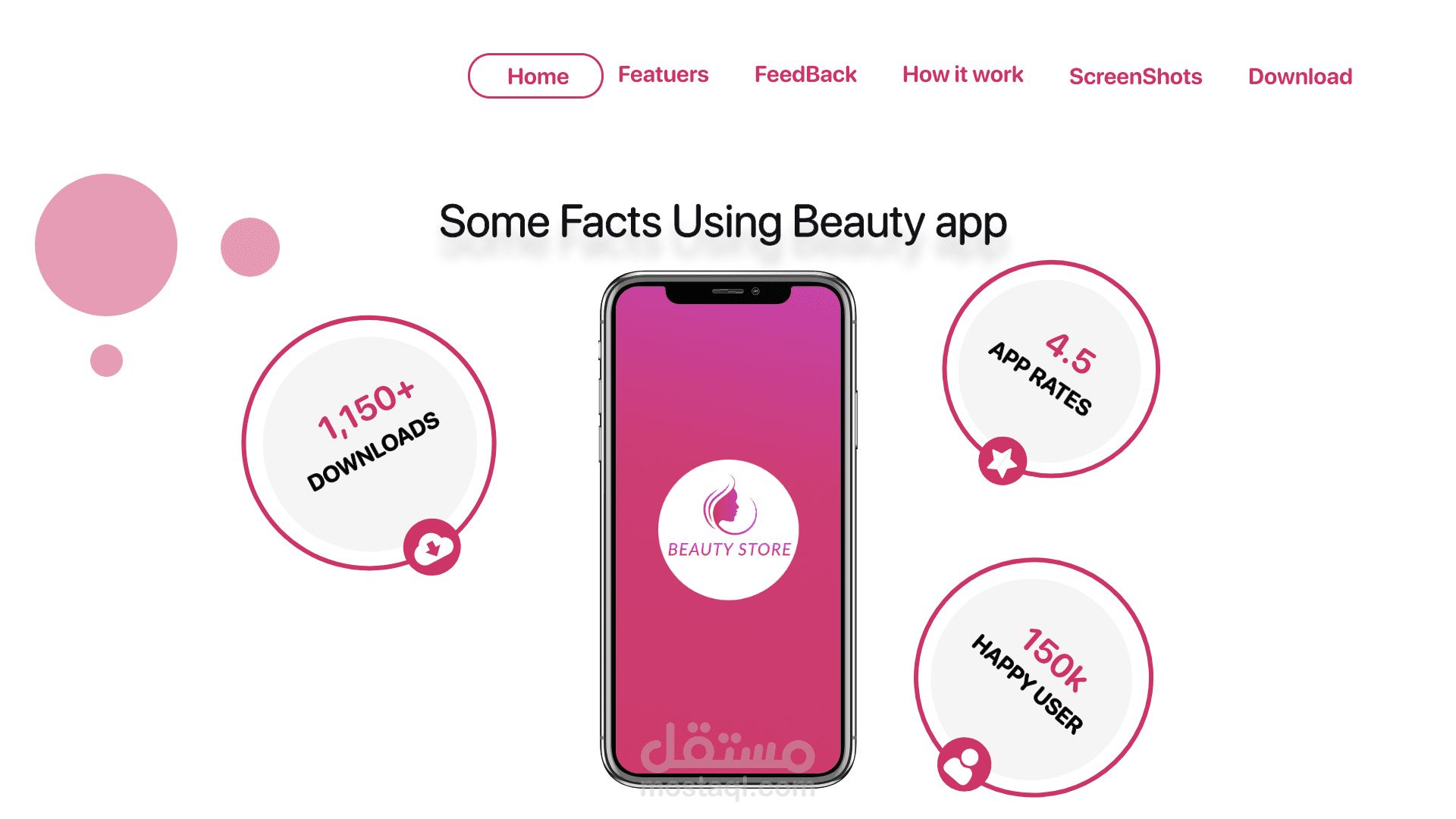 landing page for makeup App صفحة هبوط لتطبيق متجر لبيع المكياج حيث تشكل اعلان للتطبيق وتتضمن ما فائدة التطبيق وكم عدد المستخدمين وآراء المستخدمين عن التطبيق طريقة تنزيل التطبيق ومميزات التطبيق وصفحة تواصل معنا