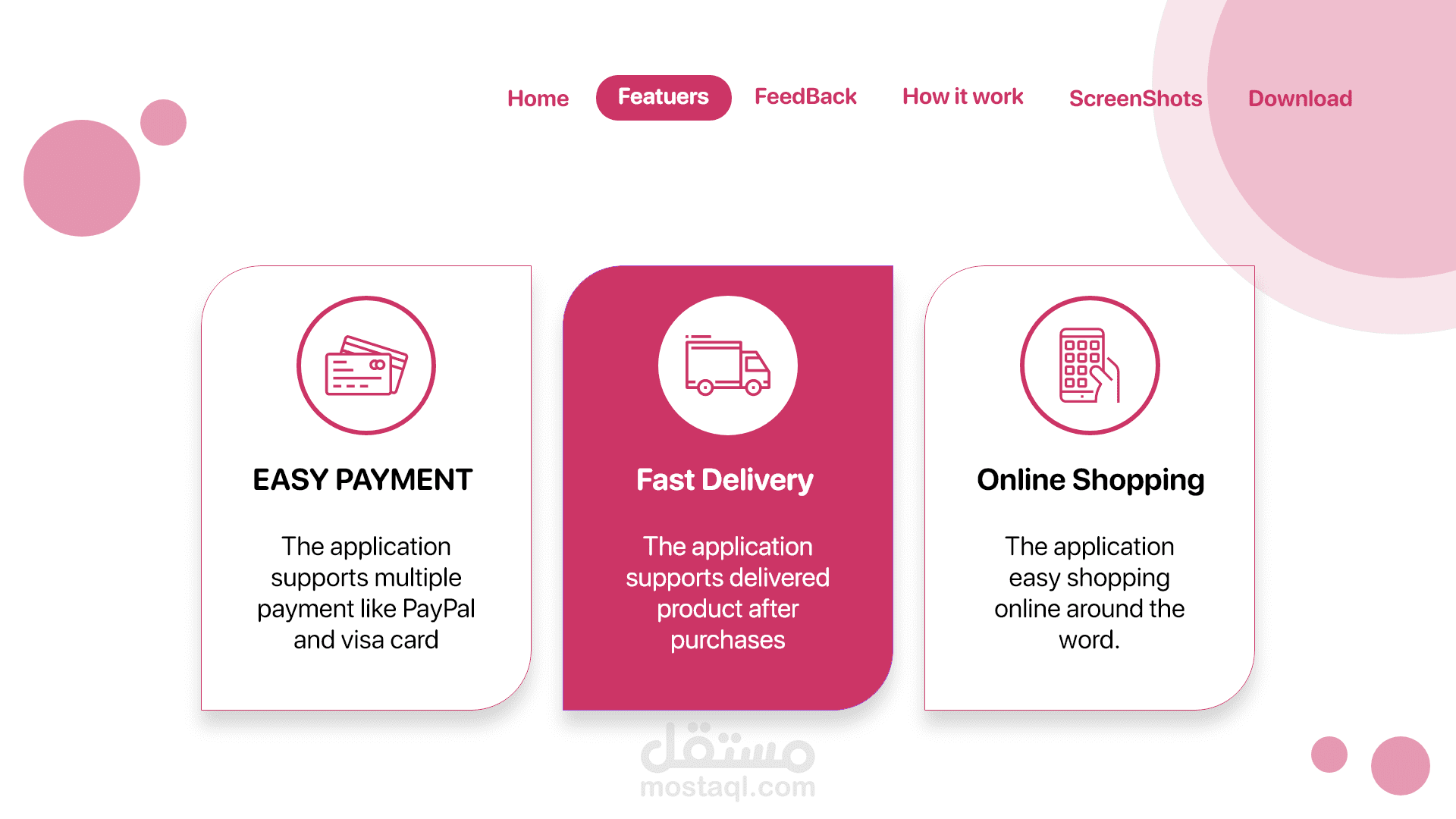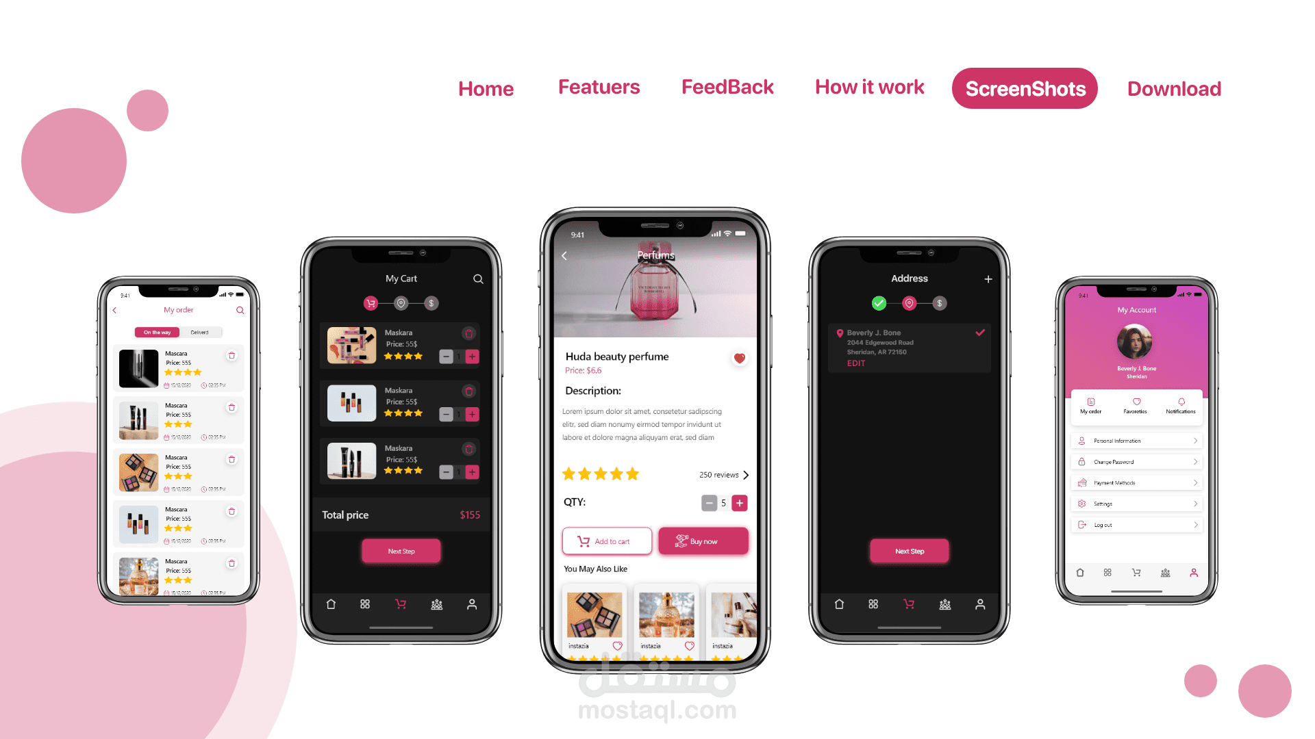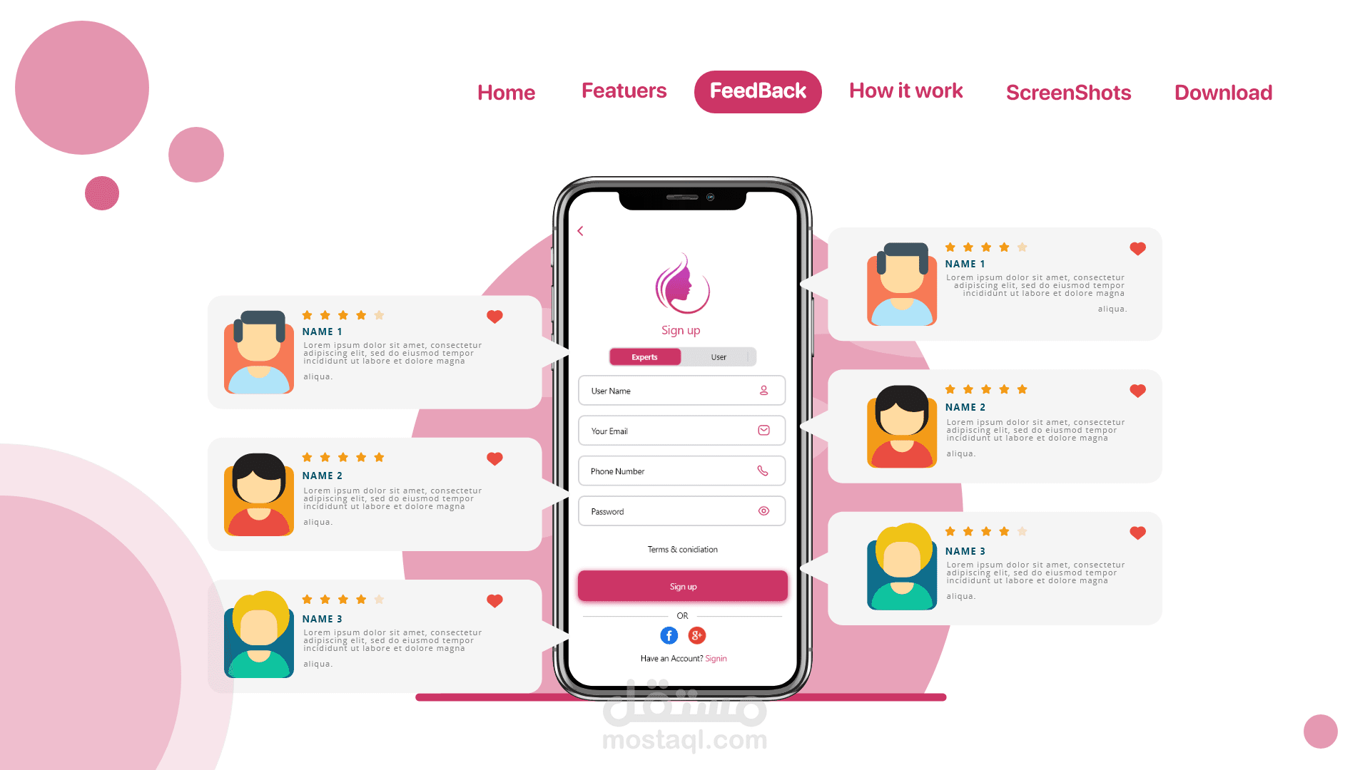 landing page for makeup App صفحة هبوط لتطبيق متجر لبيع المكياج حيث تشكل اعلان للتطبيق وتتضمن ما فائدة التطبيق وكم عدد المستخدمين وآراء المستخدمين عن التطبيق طريقة تنزيل التطبيق ومميزات التطبيق وصفحة تواصل معنا
