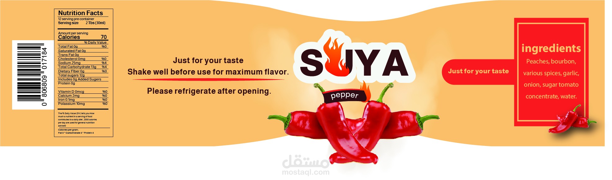تصميم الملصق بشكل غير تقليدي حيث اعتمد تم اضافة الفلفل والنار لدلالة على نوعية المنتج وهو فلفل صويا.