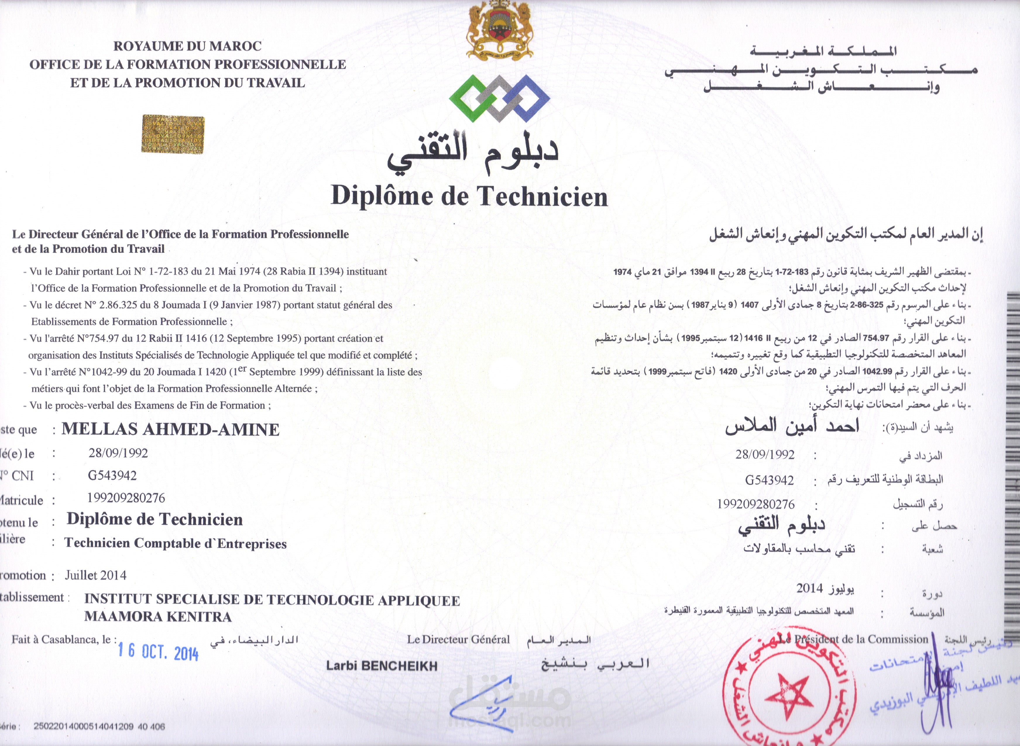 DIPLOME TECHNICIEN COMPTABLE D'ENTREPRISES