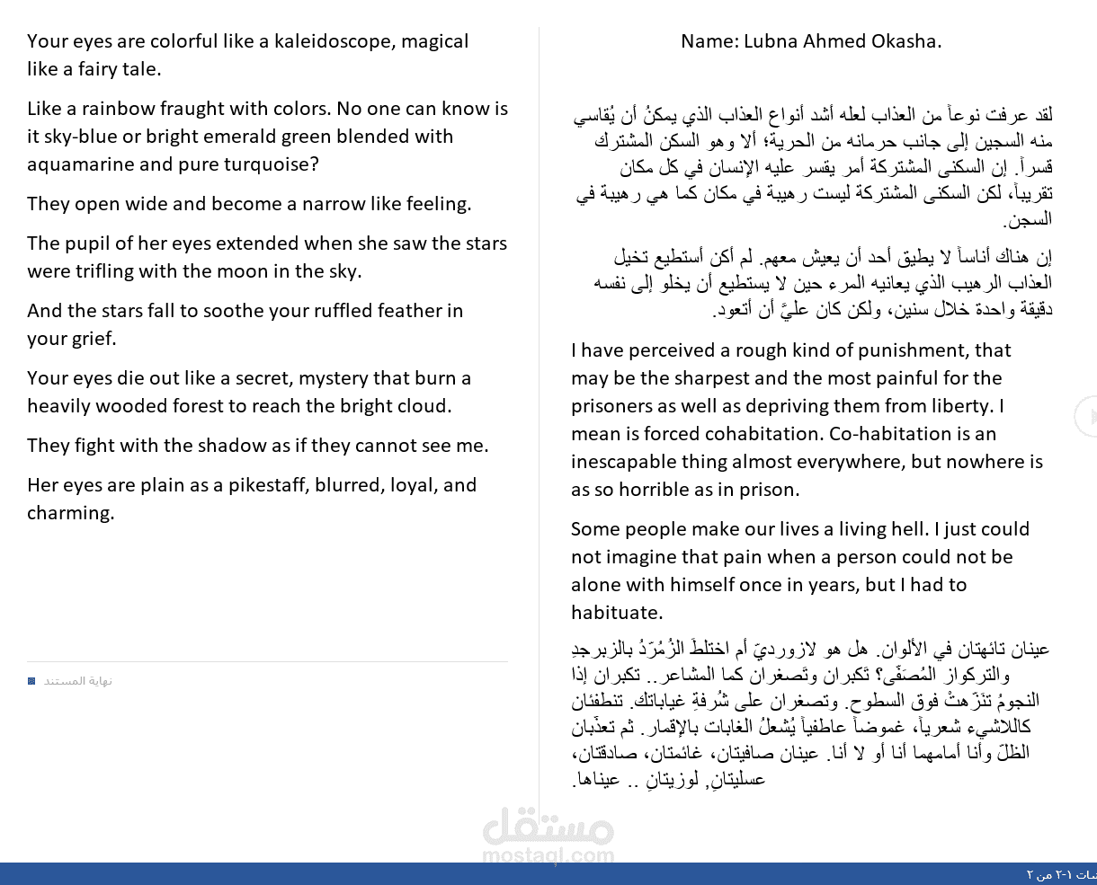 ترجمة فقرة من رواية من روايات الأديب فيودور دوستويفسكي و فقرة من شعر الشاعر الفلسطيني محمود درويش