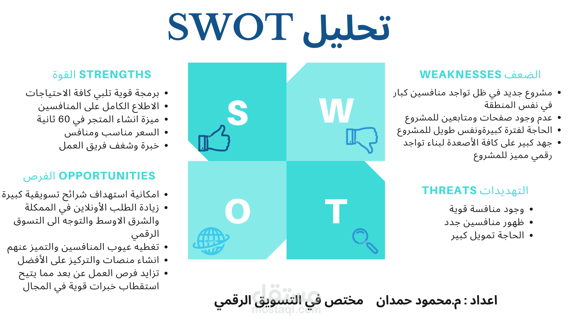 قمت بعمل تحليل رباعي SWOT مفصل بكل المعلومات المهمة والتي يجب أن تؤخد بعين الاعتبار من أجل تطوير وتحسين الصفحات حيث تم دراسة المشروع بشكل كامل في البداية ووضع النقاط العامة ثم تحديد جميع نقاط :