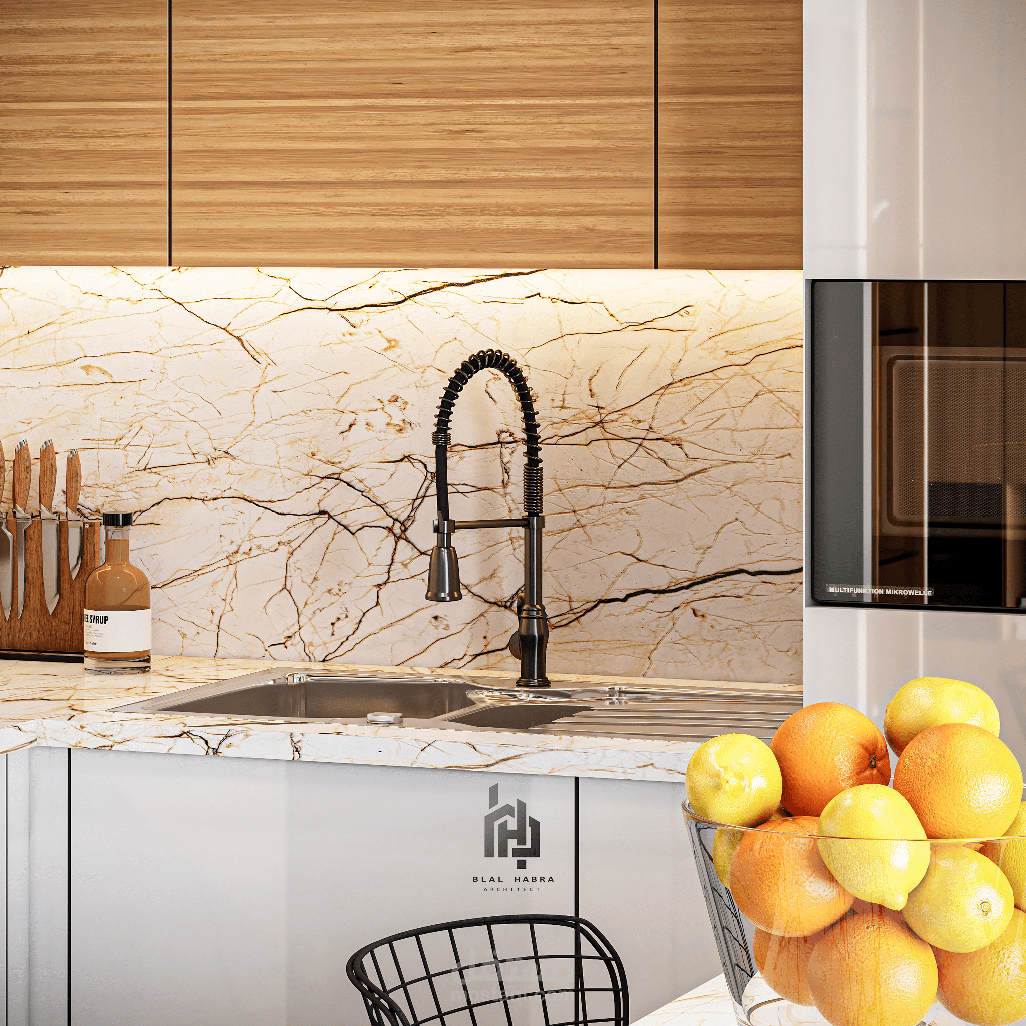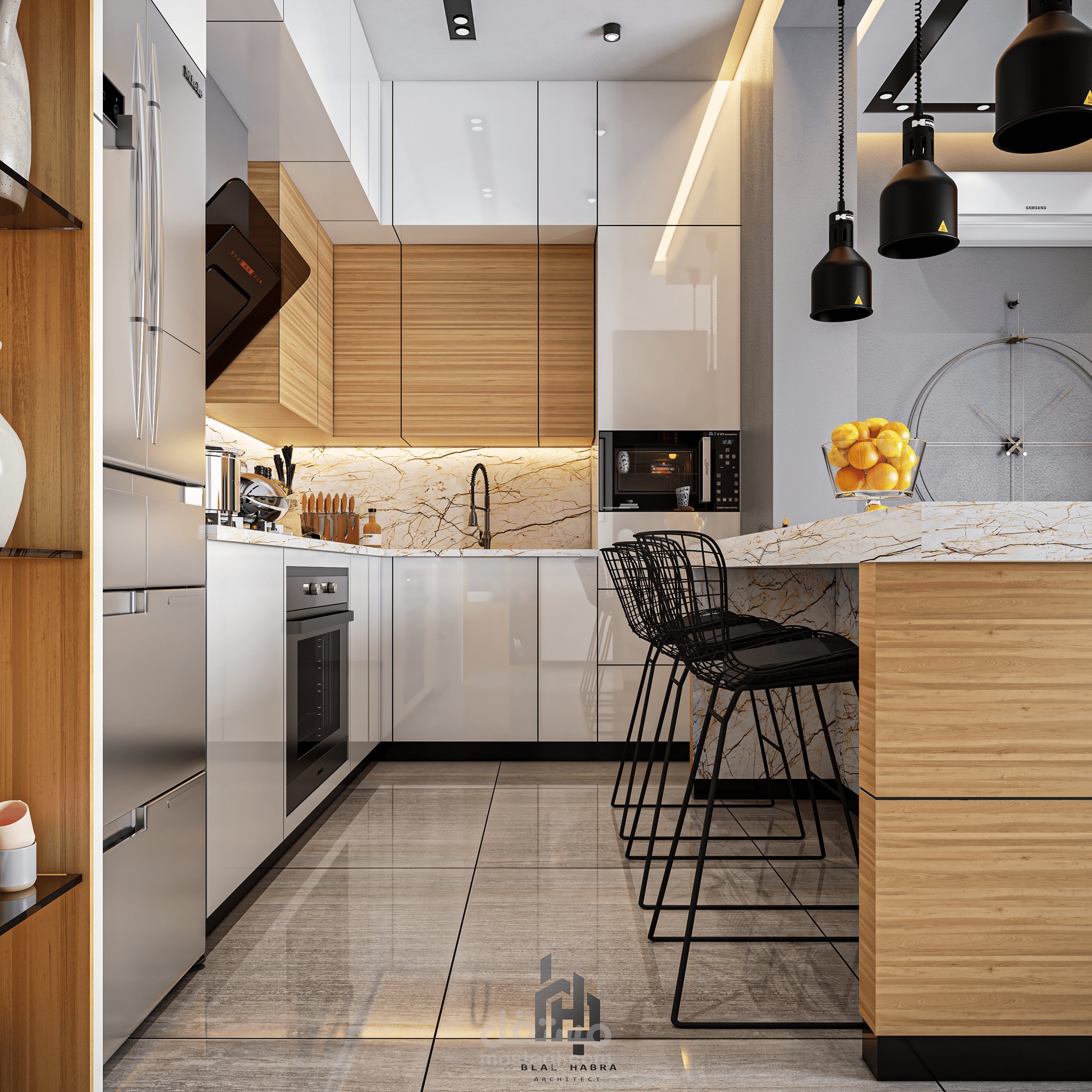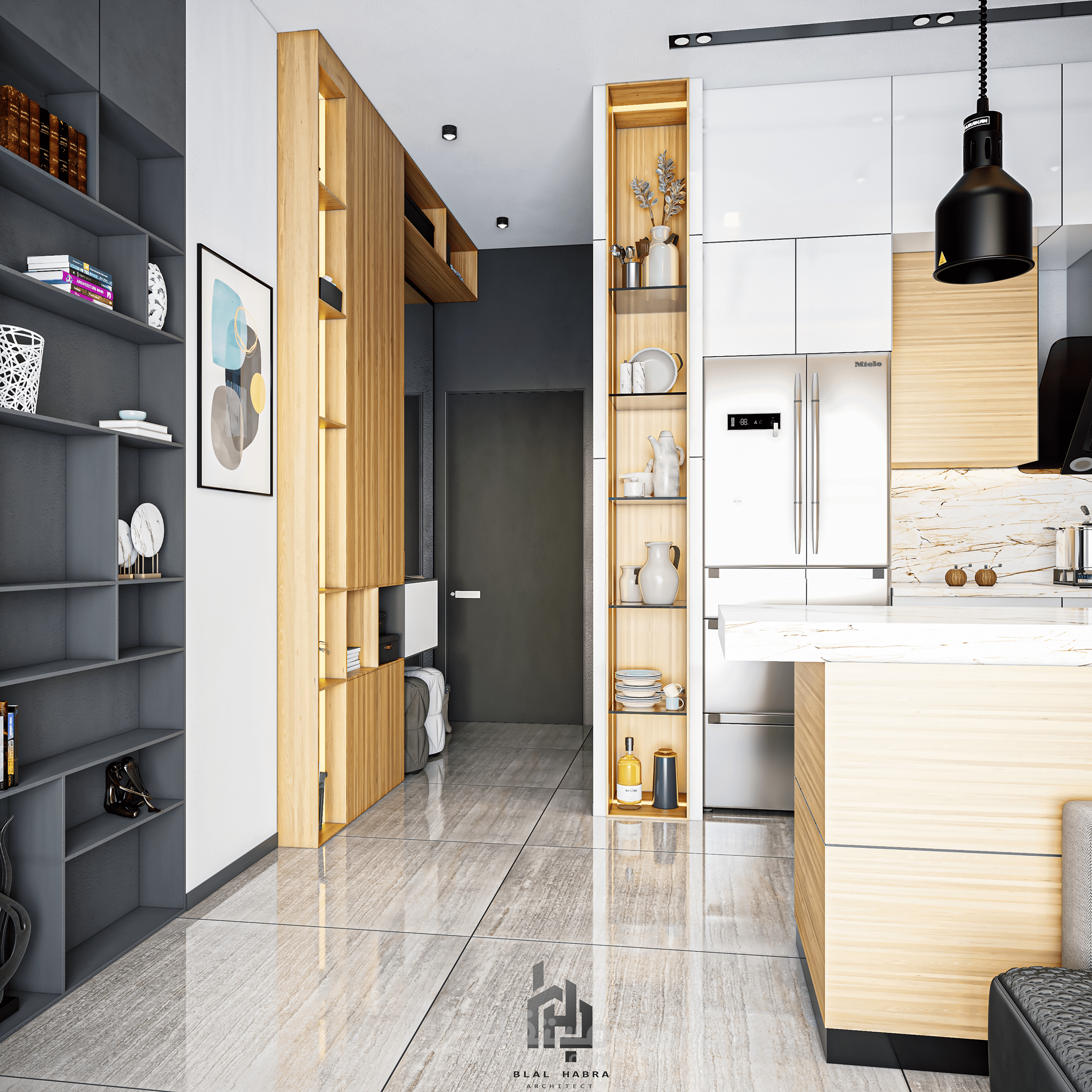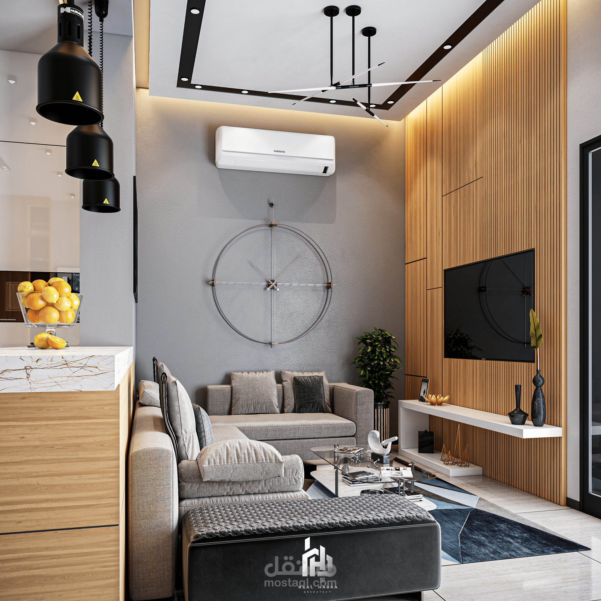 تصميمي لغرفة معيشةومطبخ ضمن شقة على الطراز المودرن