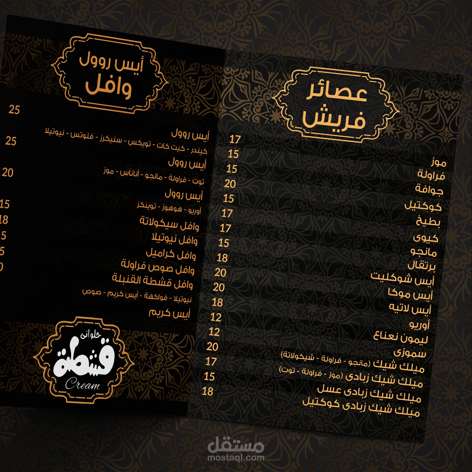 منيو صالة لمحل حلوانى ومشروبات قشطة