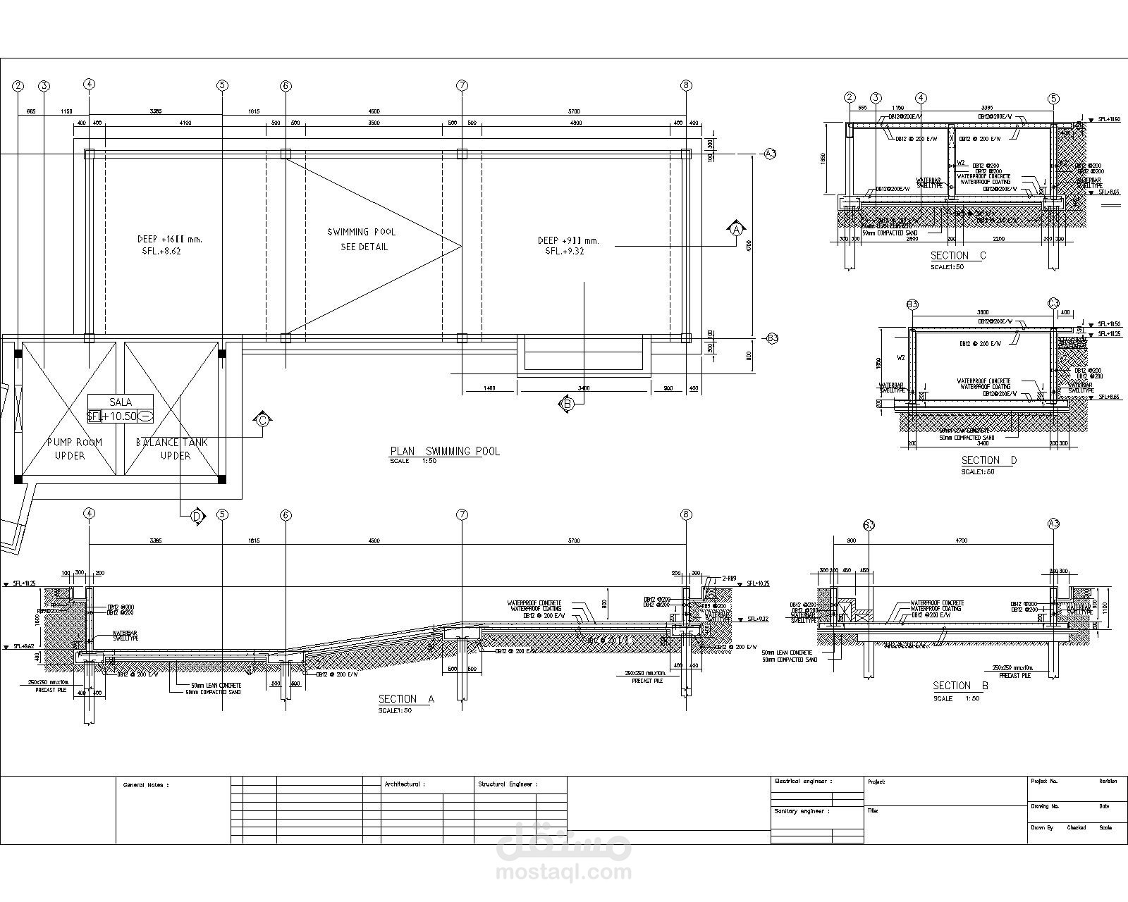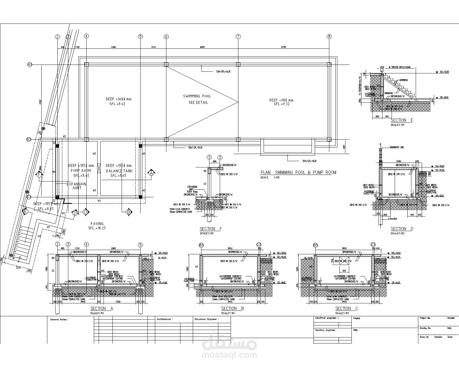 تصميم انشائية خرساني تفصيلي لمسبح تحت أرضي ، وإعداد النوتة الحسابية المطلوبة للجهات المختصة ، وقد تم التصميم استناداً إلى الكود الأمريكي AIC 318-14 مع كافة التفاصيل الانشائية التي تضمن حسن التنفيذ.