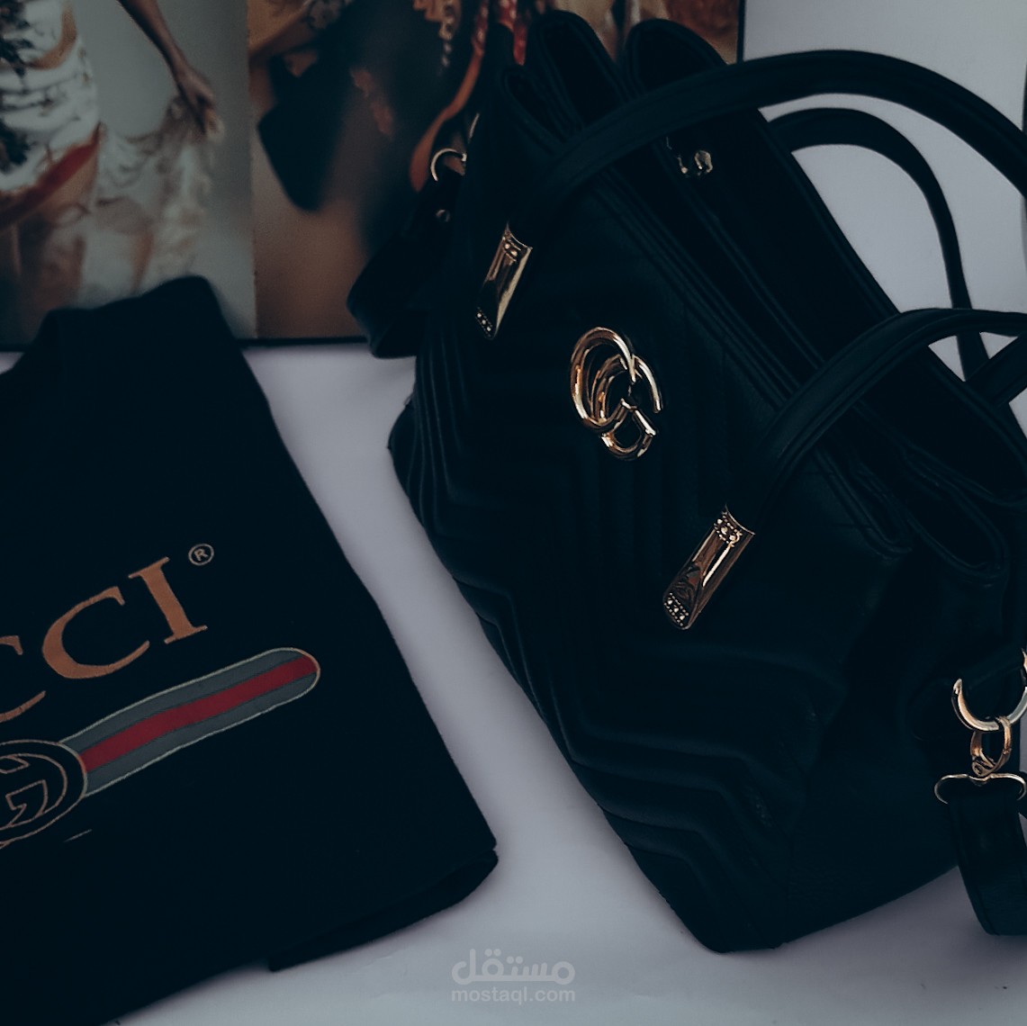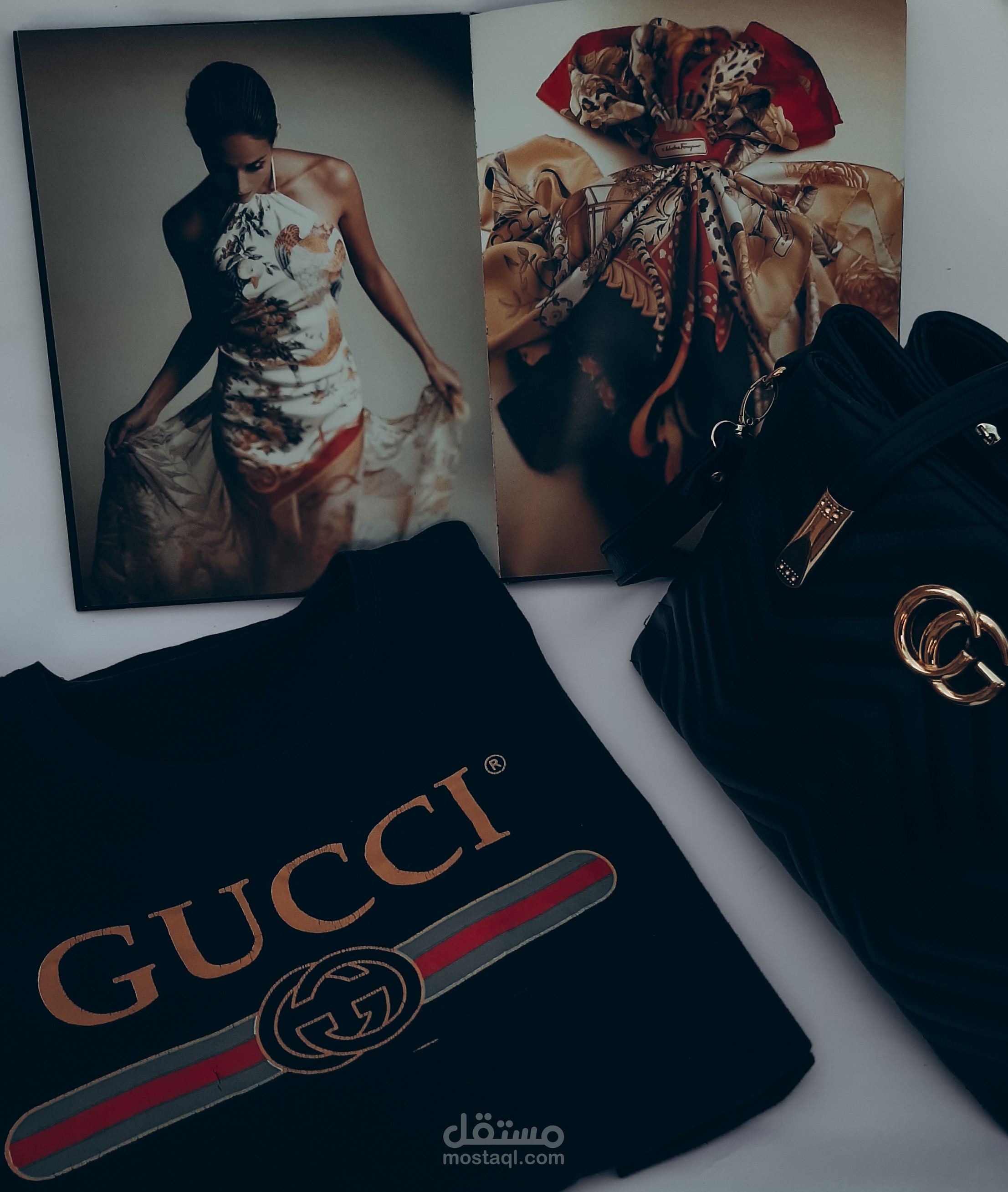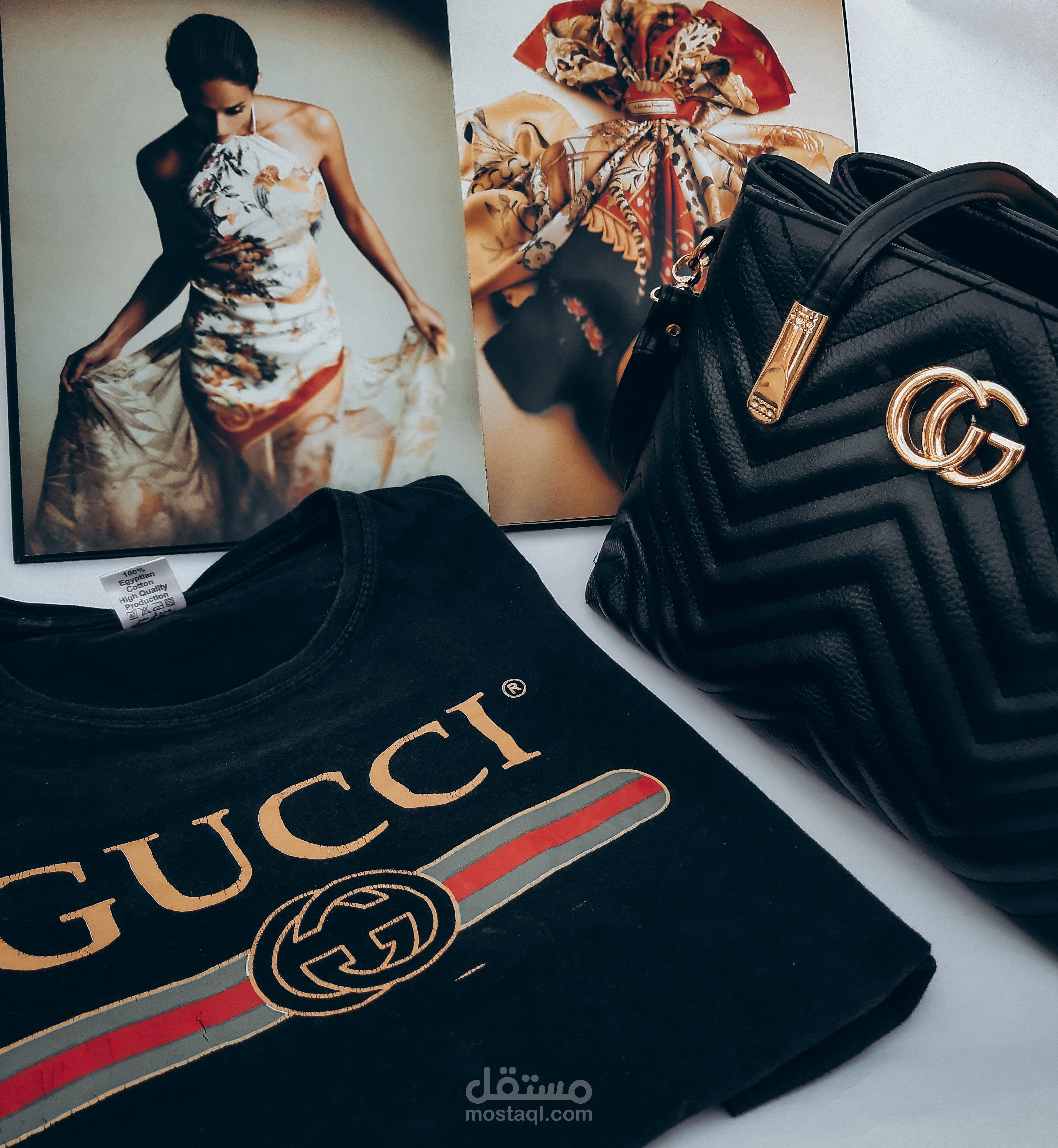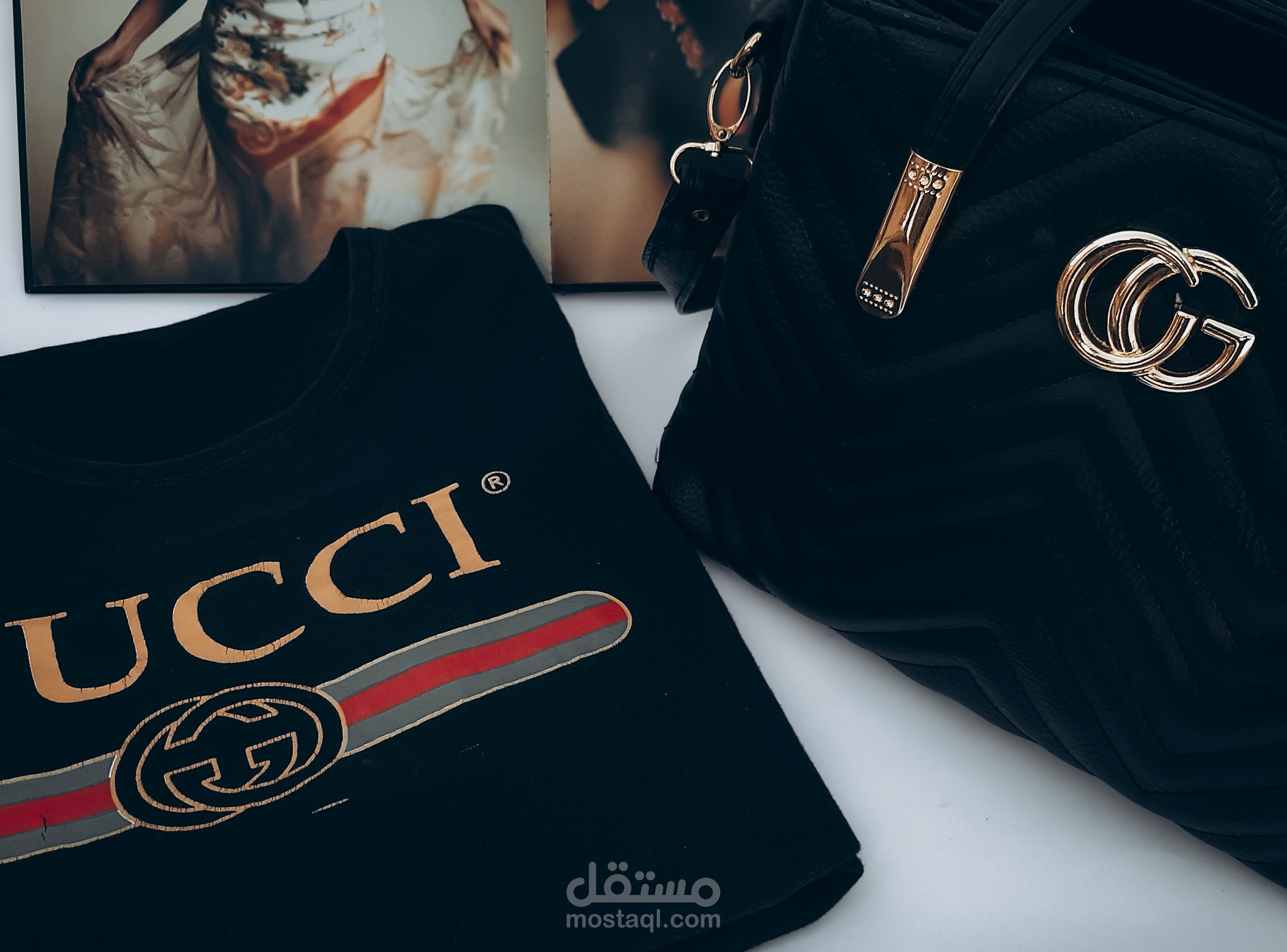 تعاون مع شركة الملابس العالمية GUCCI للترويج لحقيبة وتيشيرت