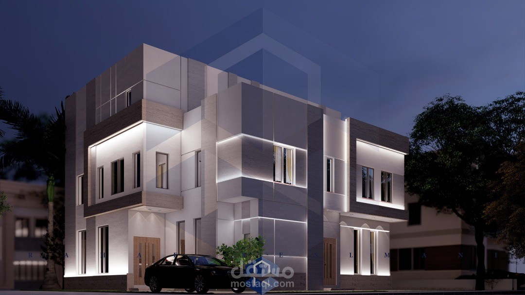 تصميم خارجي لفيلا مودرن مكونة من دورين وملحق بالوان هادئة وباستخدام بعض البروزات التزيينية