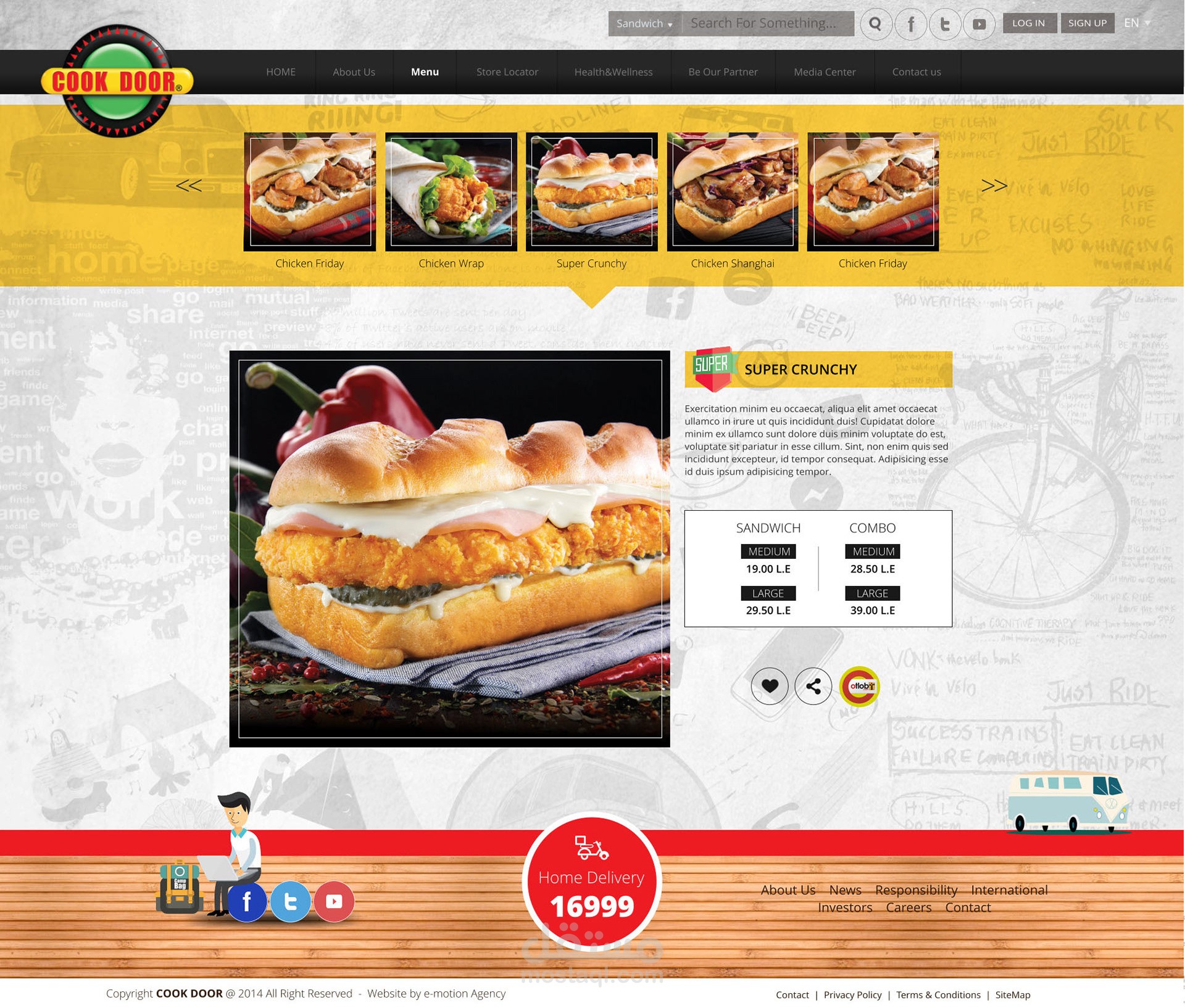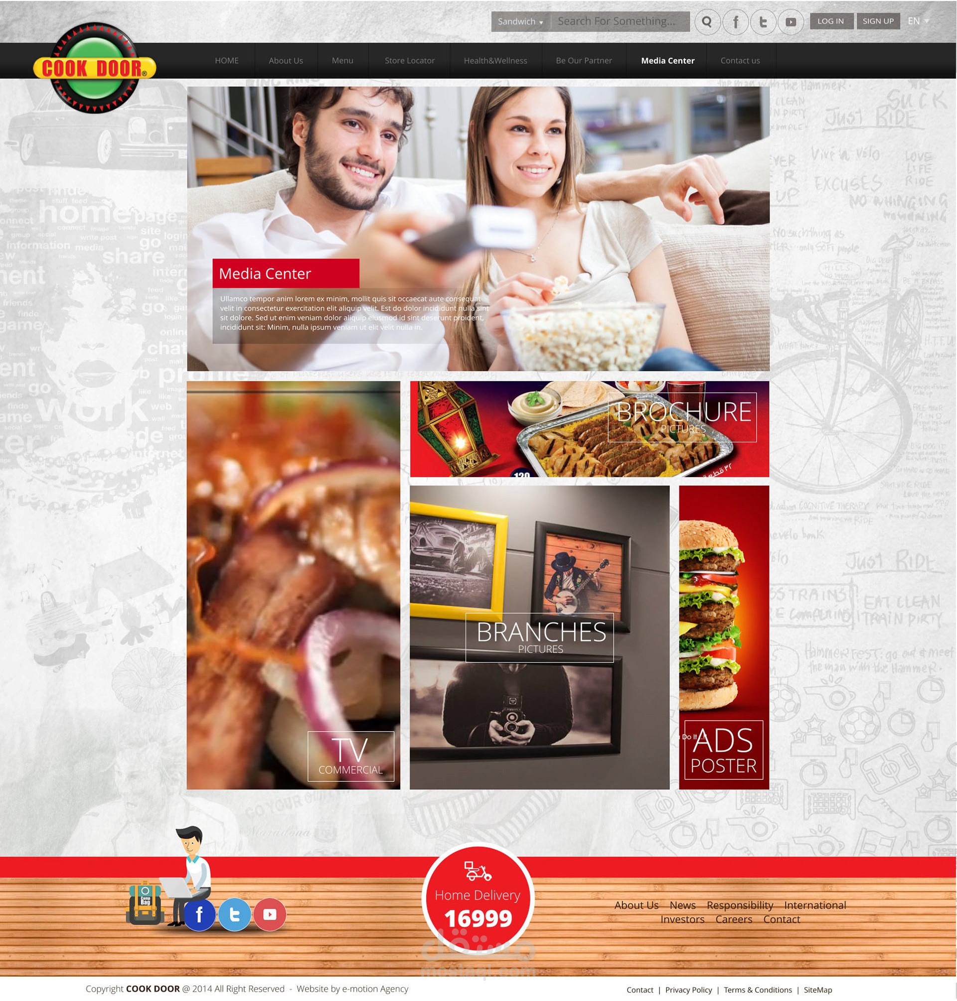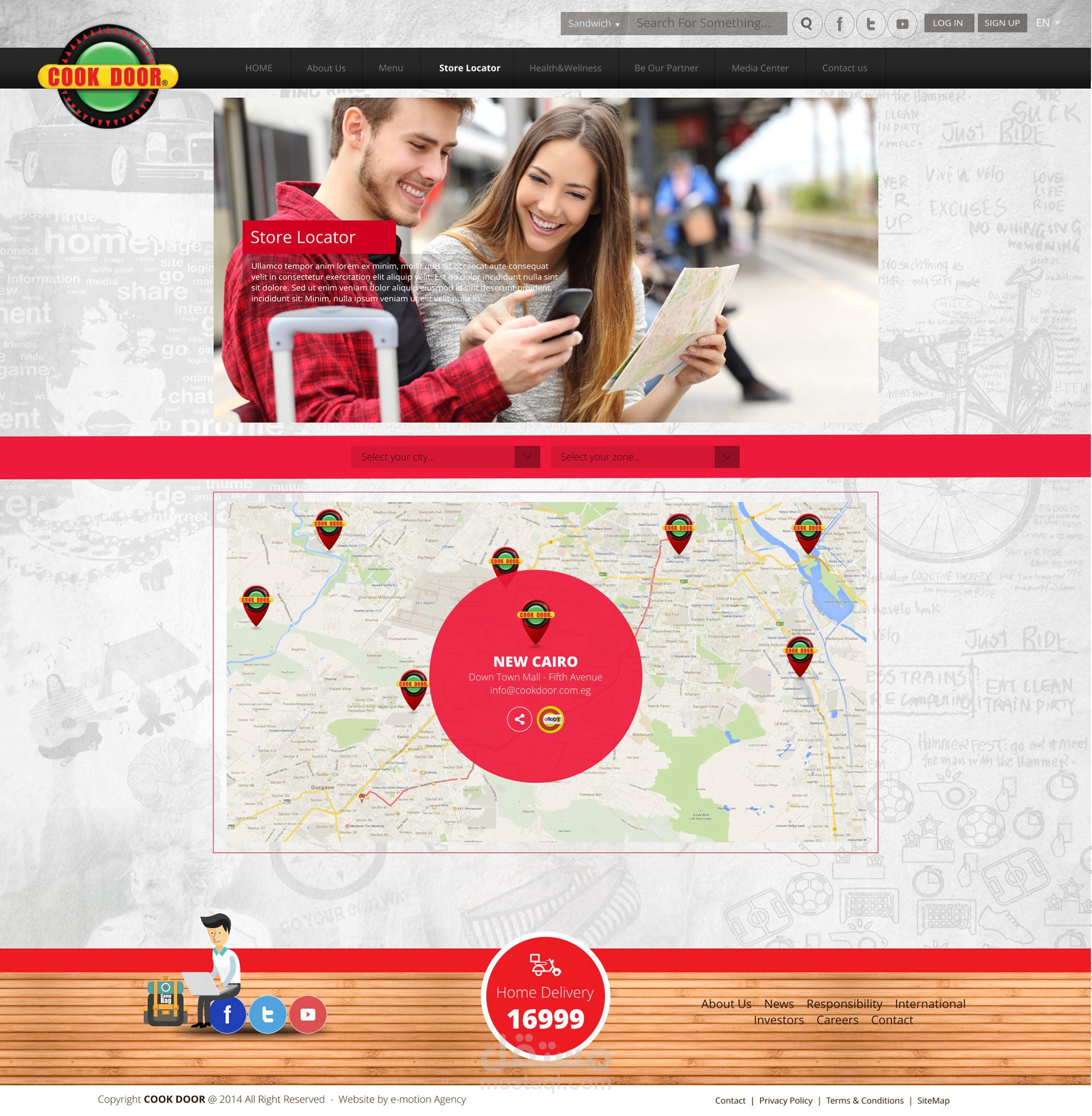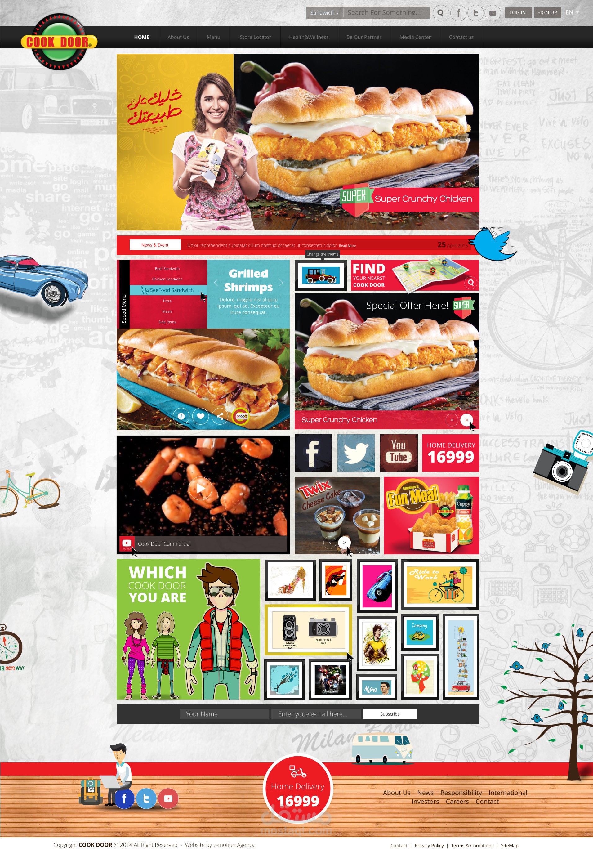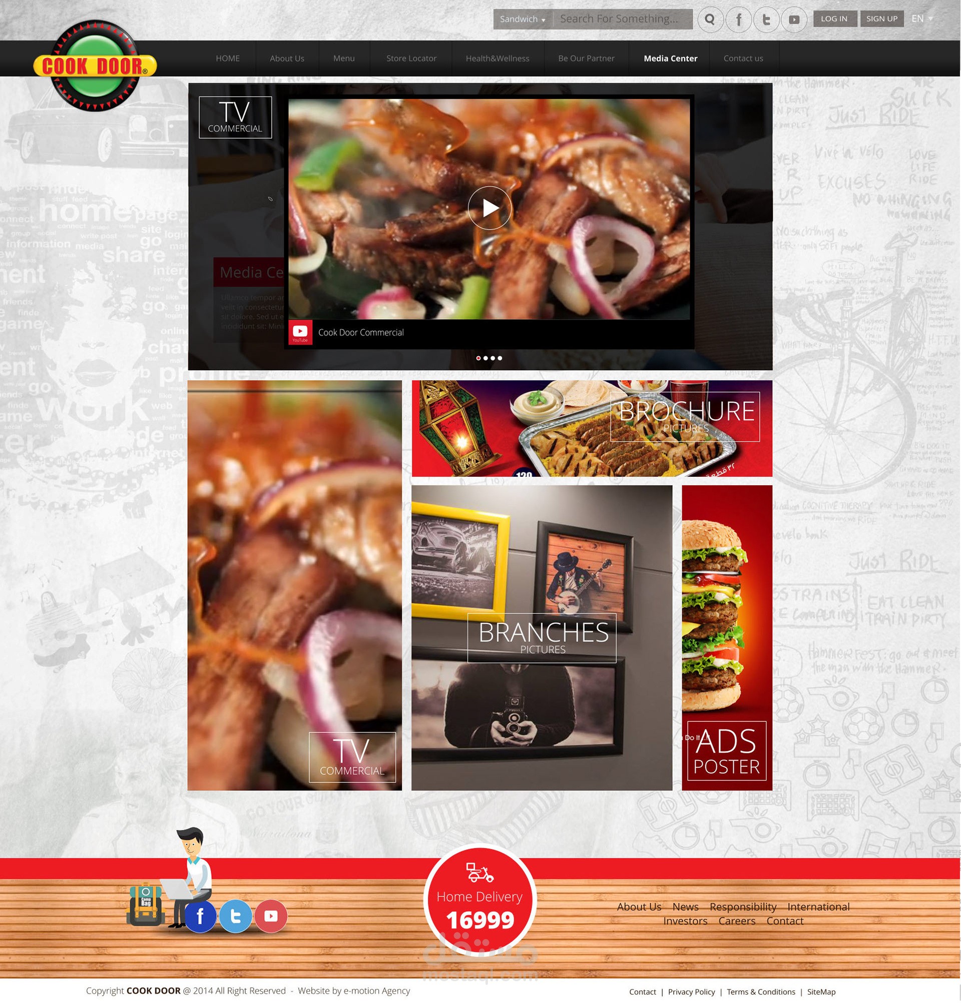 تصميم ويب سايت مطعم كووك دوور الحالي بإستخدام الهوية الخاصة به حيث كانت قائمة علي الأهتمامات الخاصة بالعملاء وربطها بالفروع مثال هناك من يحب كرة القدم فكانت هناك فروع لها طابع كره القدم من بوسترات ودعاية وأخري تصوير او سوشيال