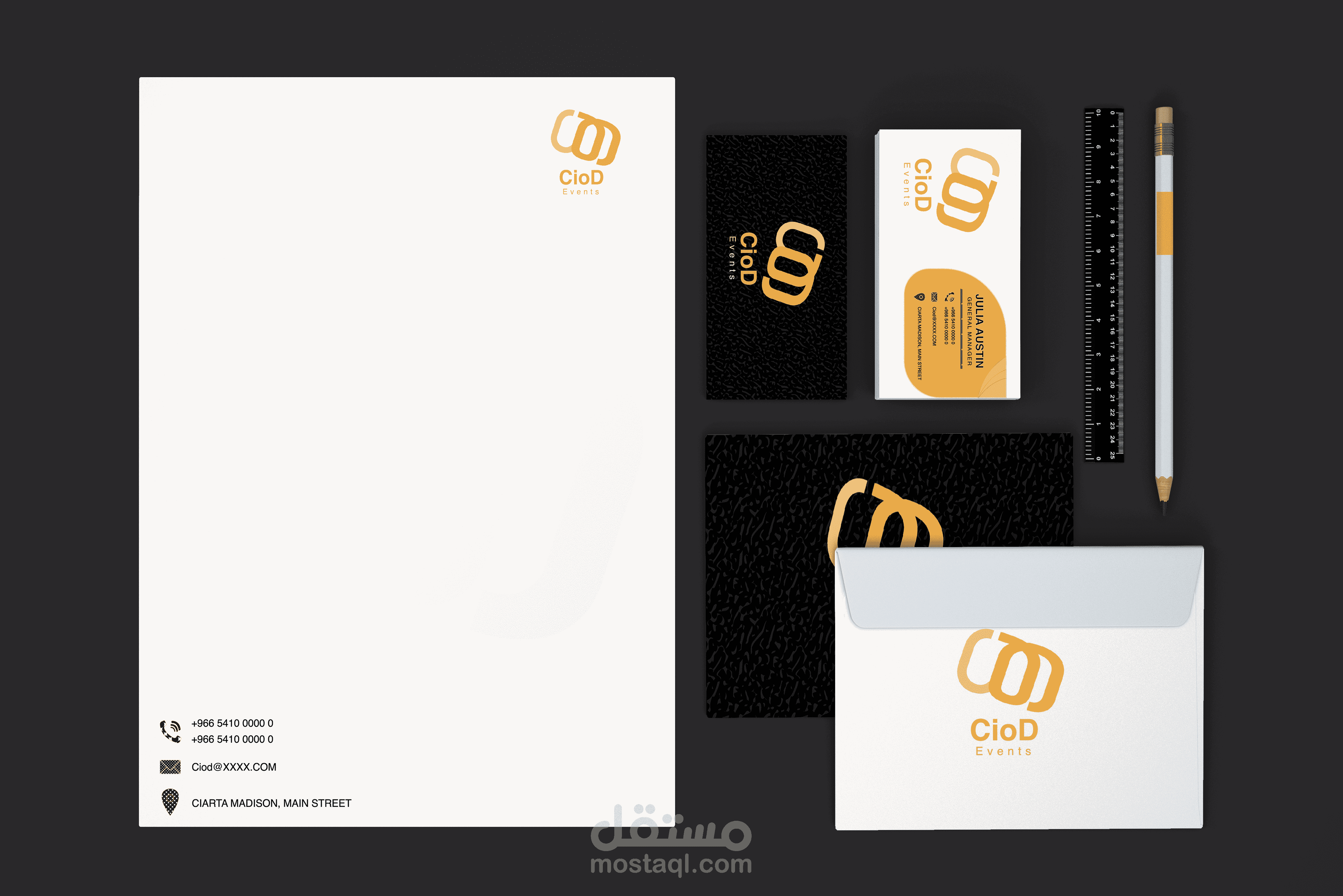 Ciod Company هي شركة إيفينتات وتنظيم العروض يشمل هل التصميم 1- البطاقة الشخصية 2- ورقة خطاب الشركة 3- بطاقة المدير