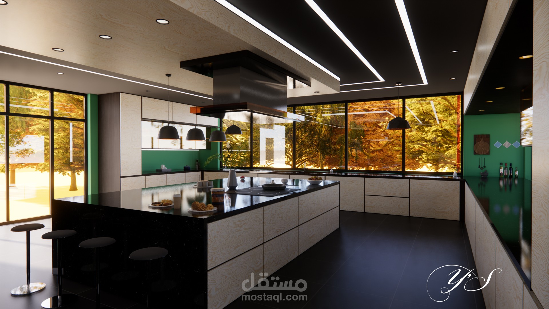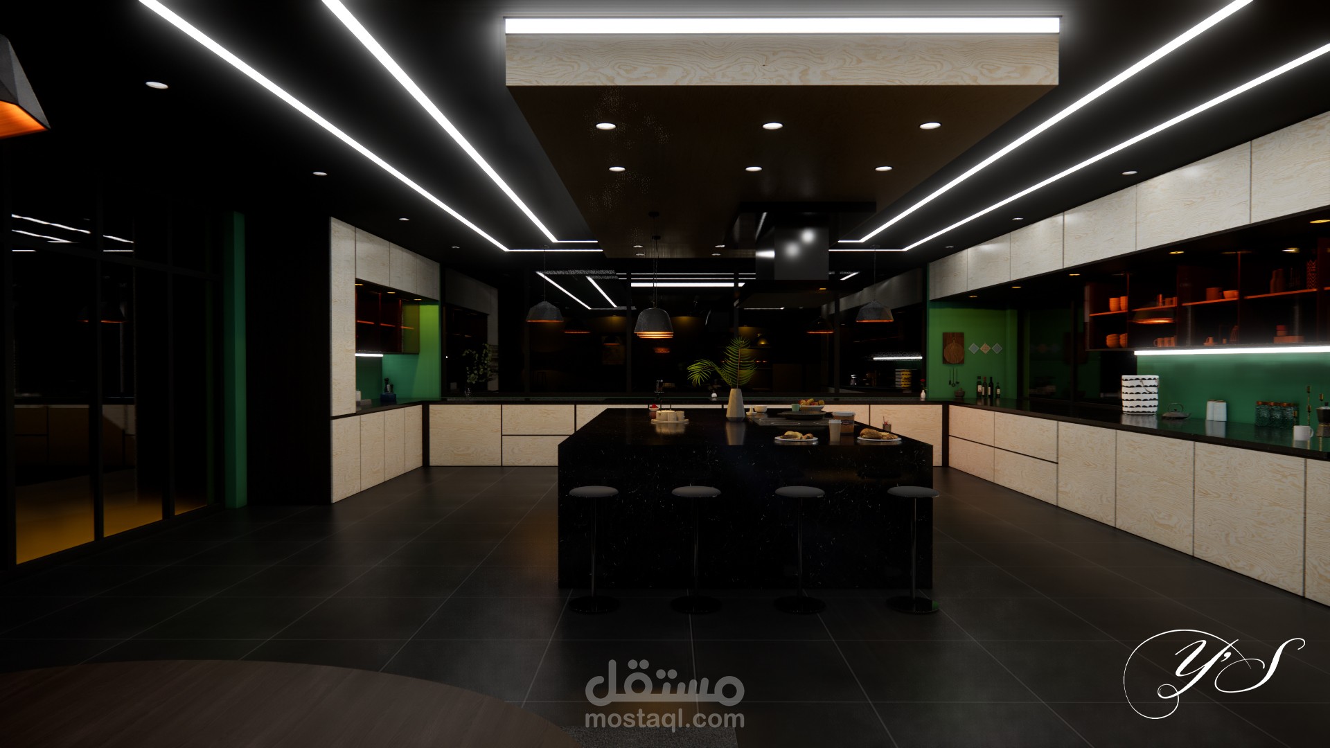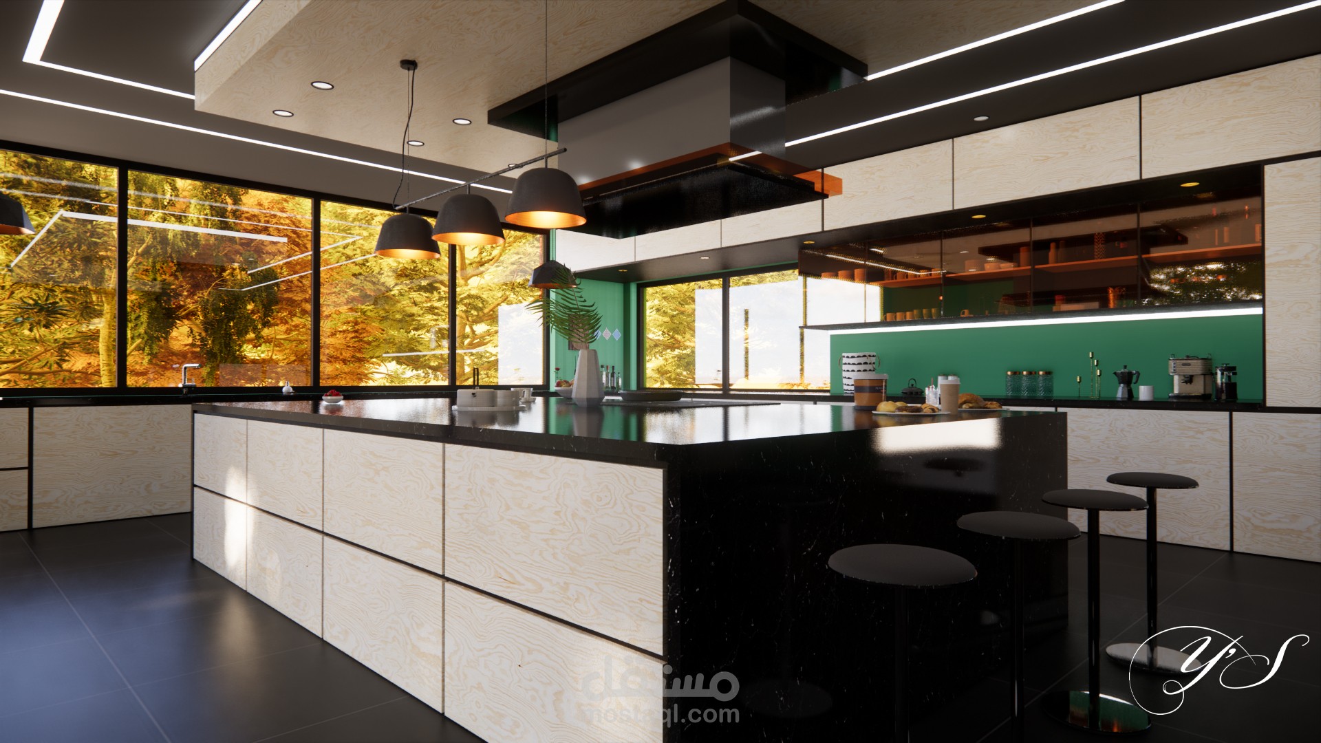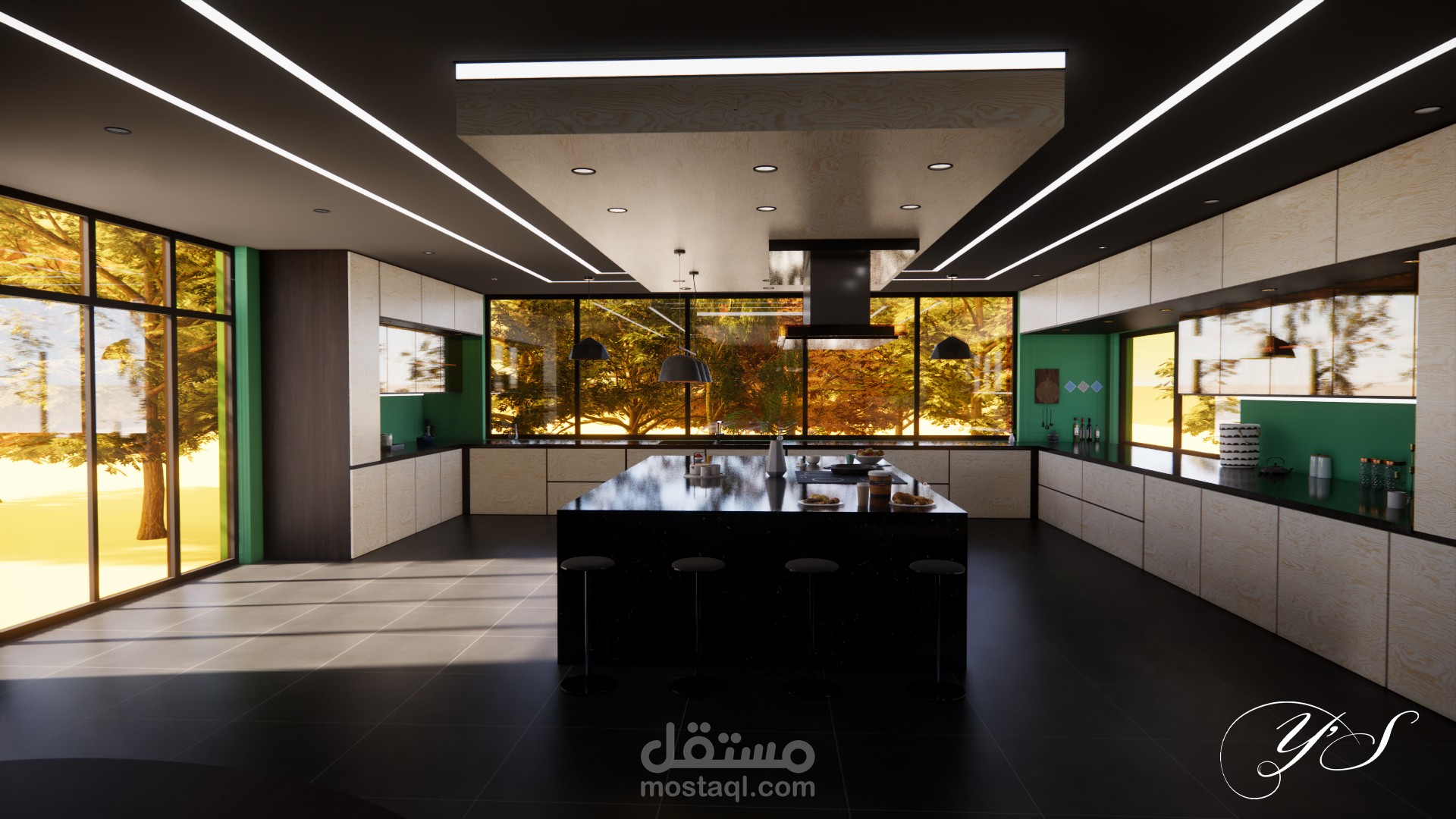 تصميم مطبخ كبير الحجم مع منطقة جلوس صغيرة