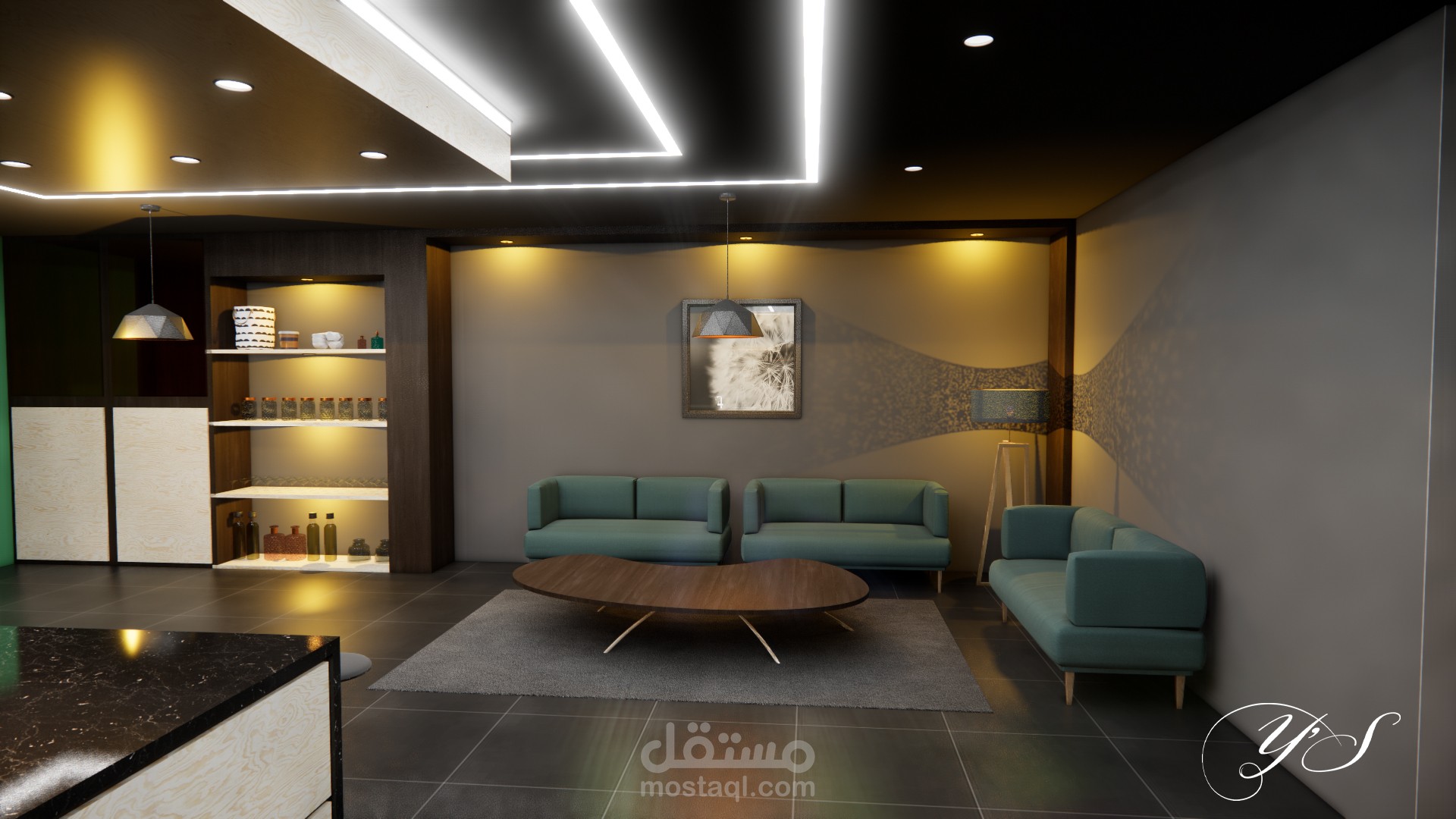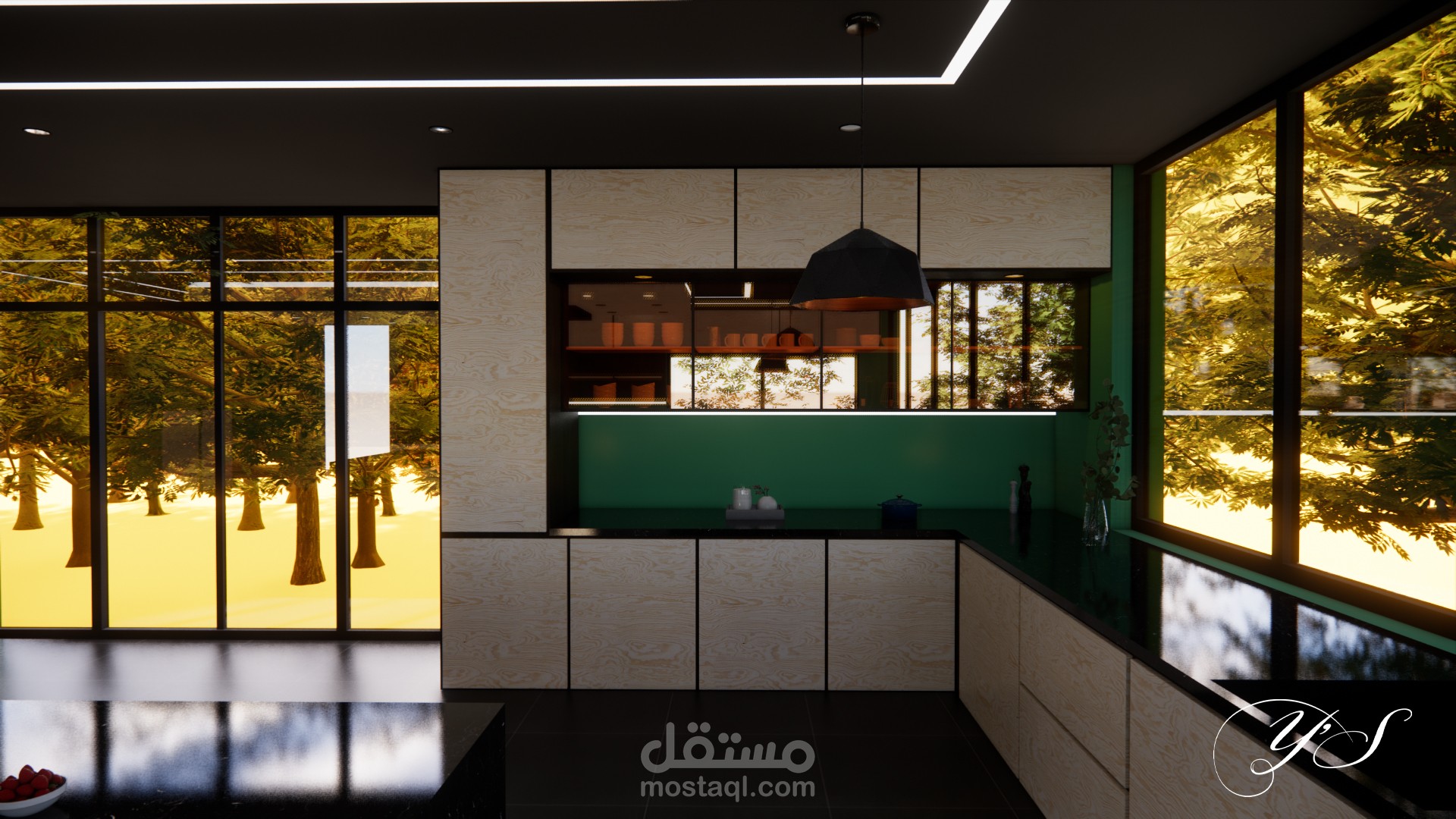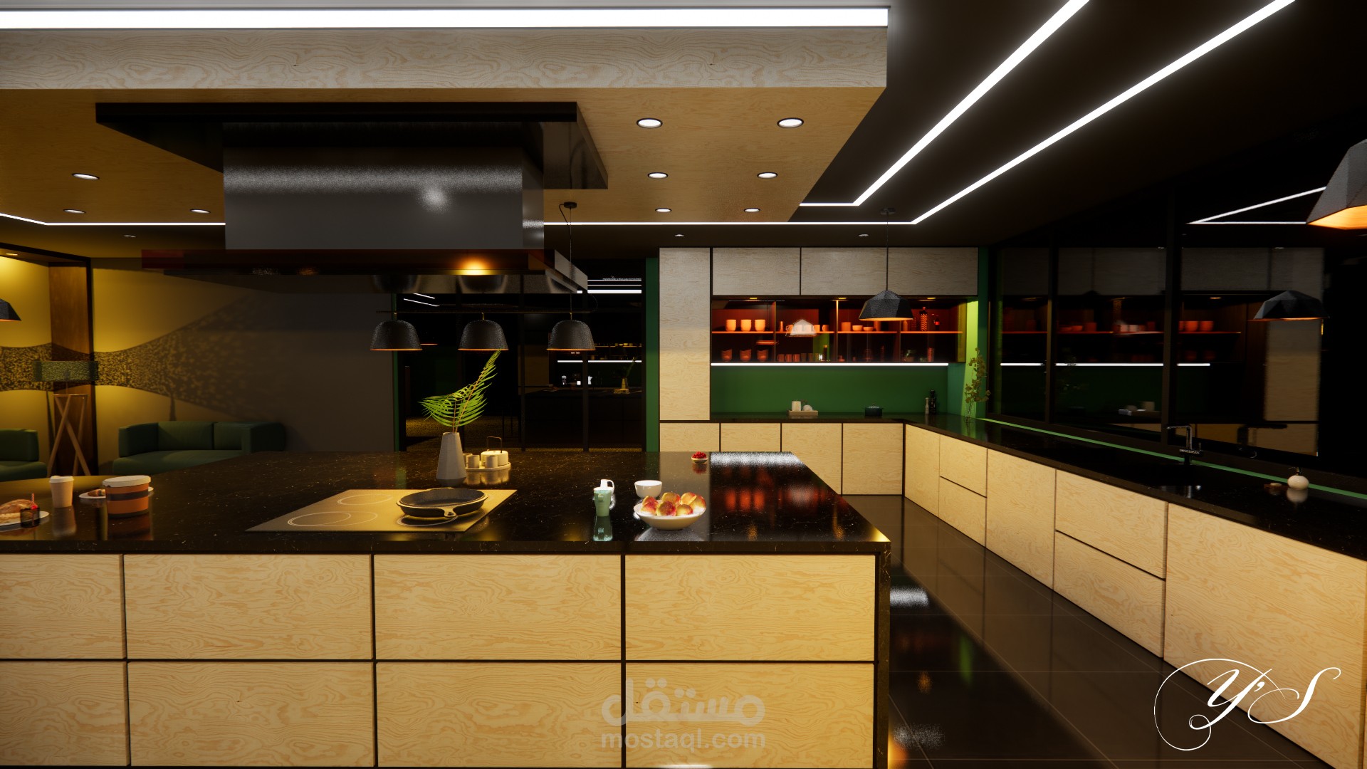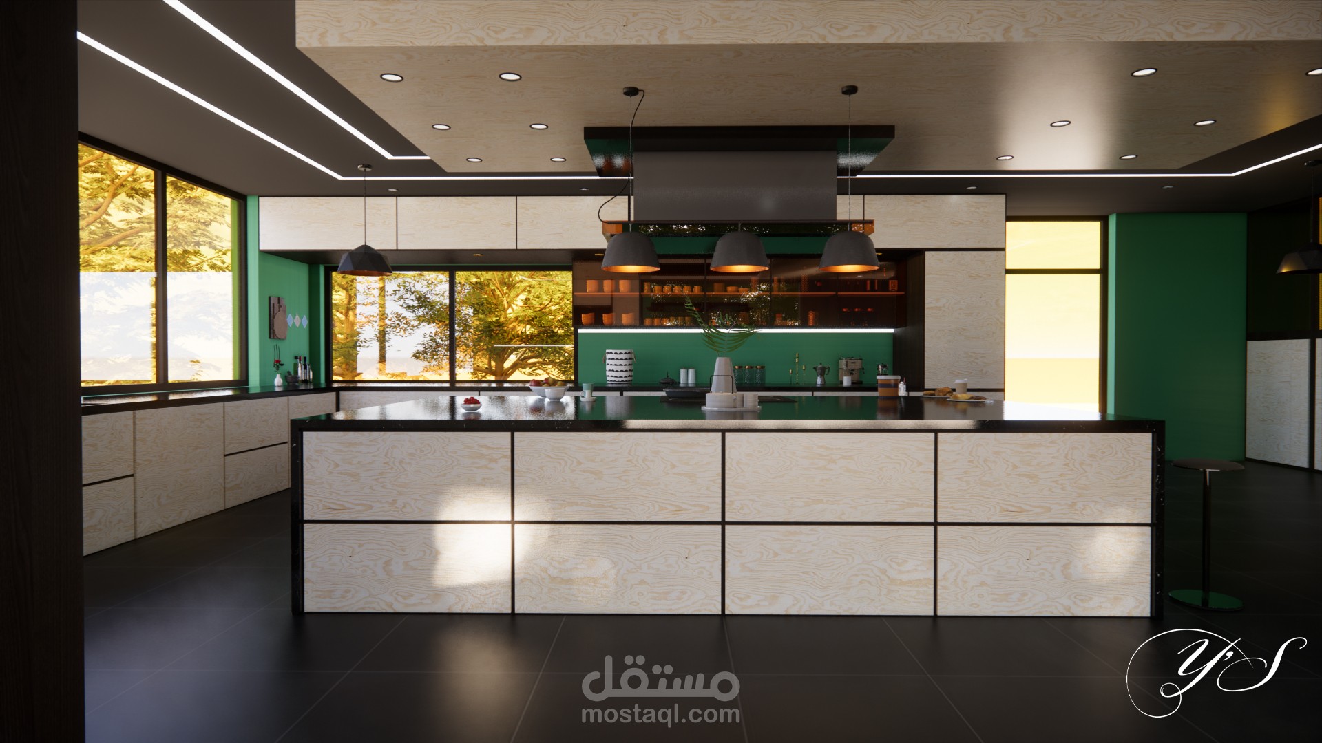 تصميم مطبخ كبير الحجم مع منطقة جلوس صغيرة