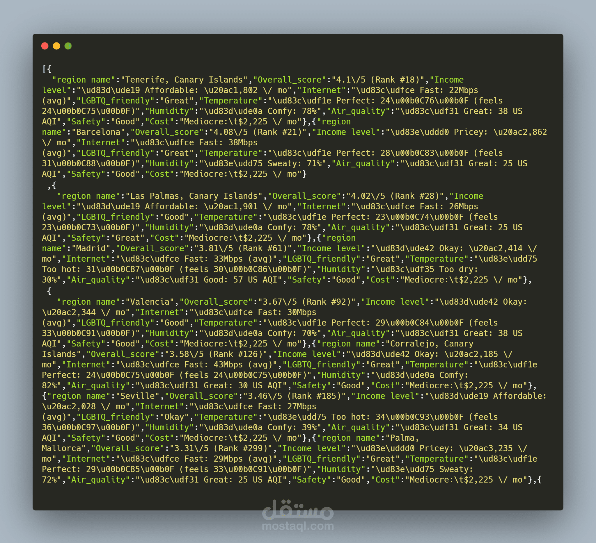آخر أعمالي في إستخراج البيانات من المواقع بإستخدام لغة بايثون و مكتبات bs4 , pandas,requasts ، هذه المرة مع موقع nomadlist يقدم إحصائيات للبلدان والمدن حول العالم ، تم إستخراج البيانات الخاصة بدولة إسبانيا ، وحفظها على شكل ملف json